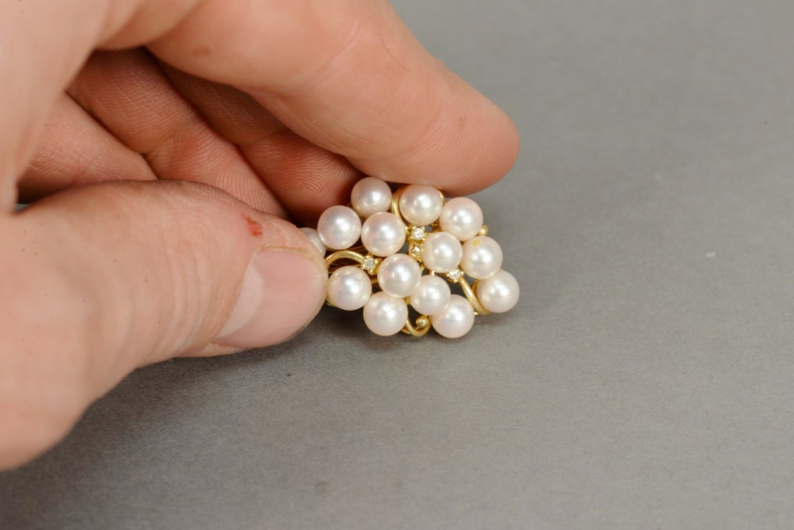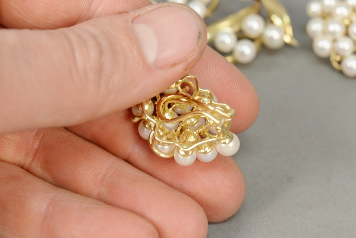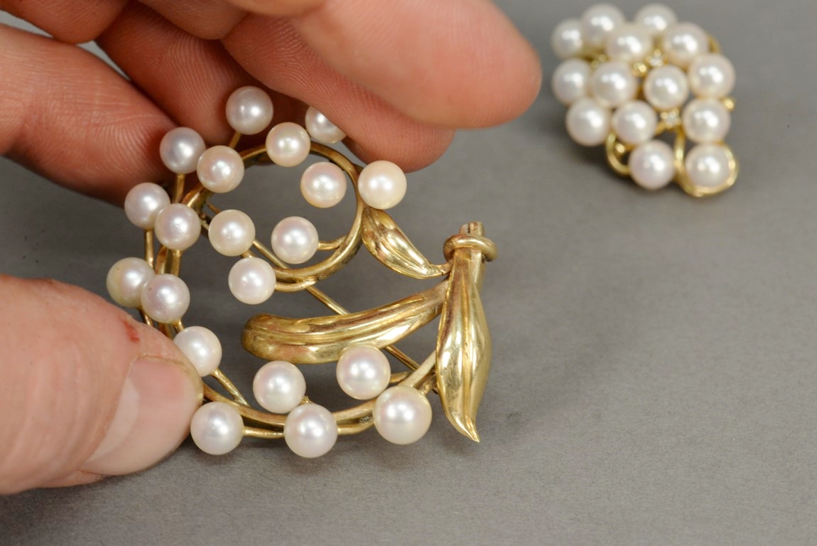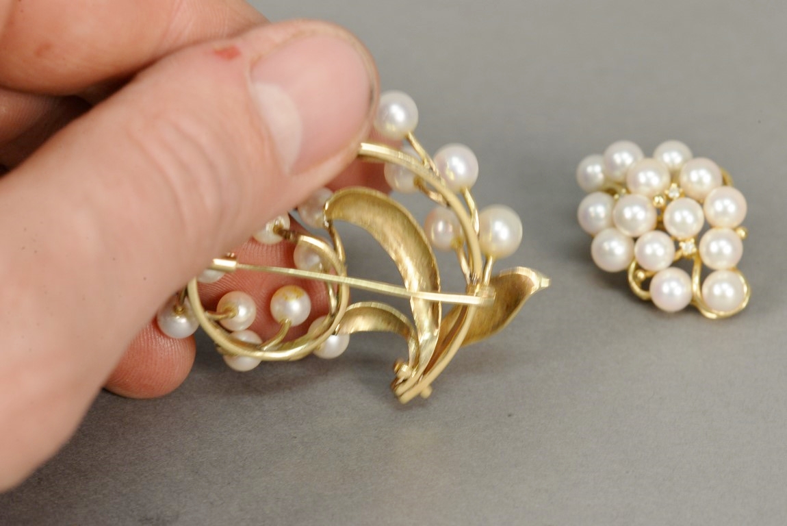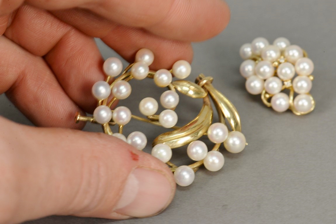 Lot 63: Three piece lot to include 14K gold and cultured pearl spray pin and cultured pearl and 14K cluster earrings, each set with three sm…