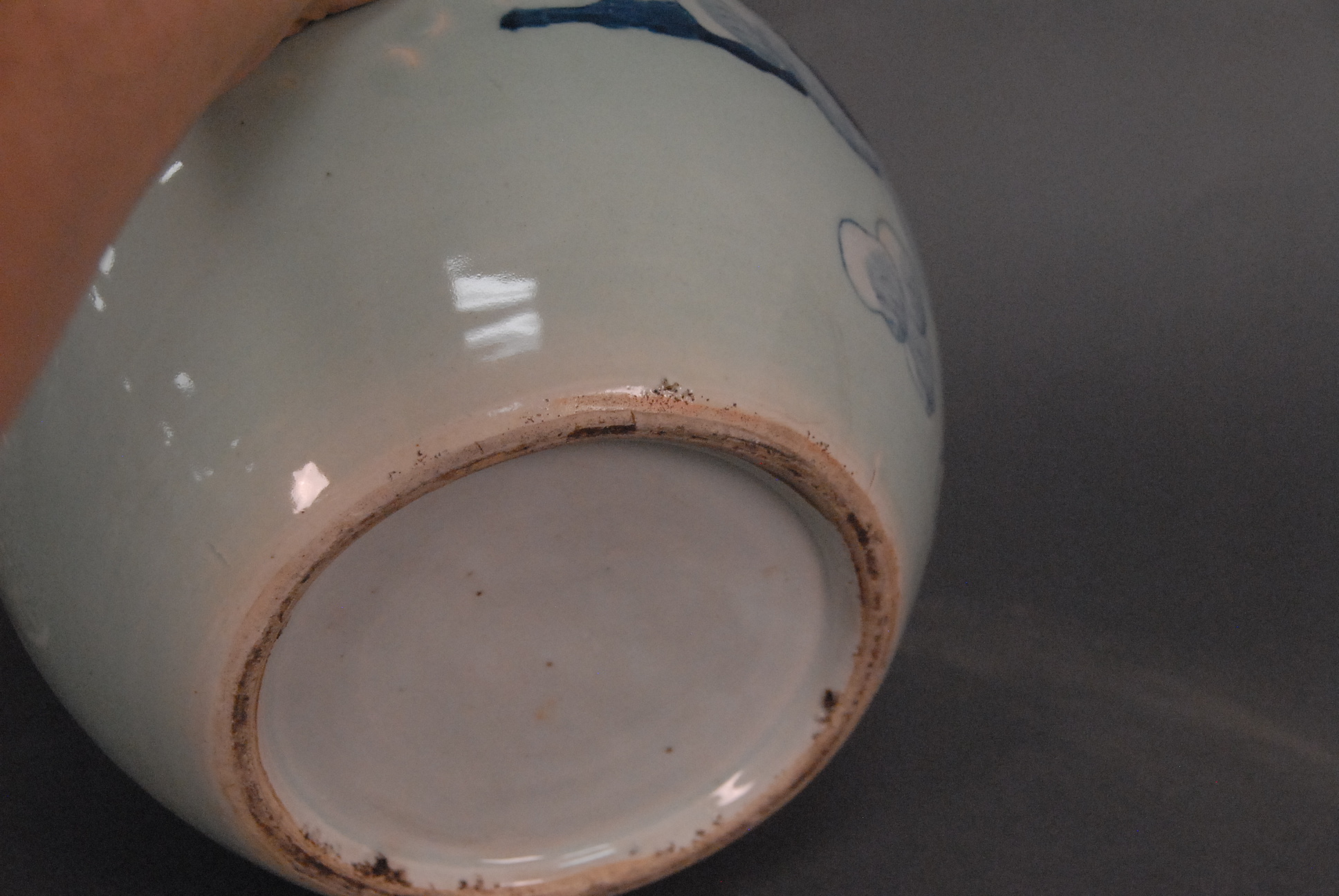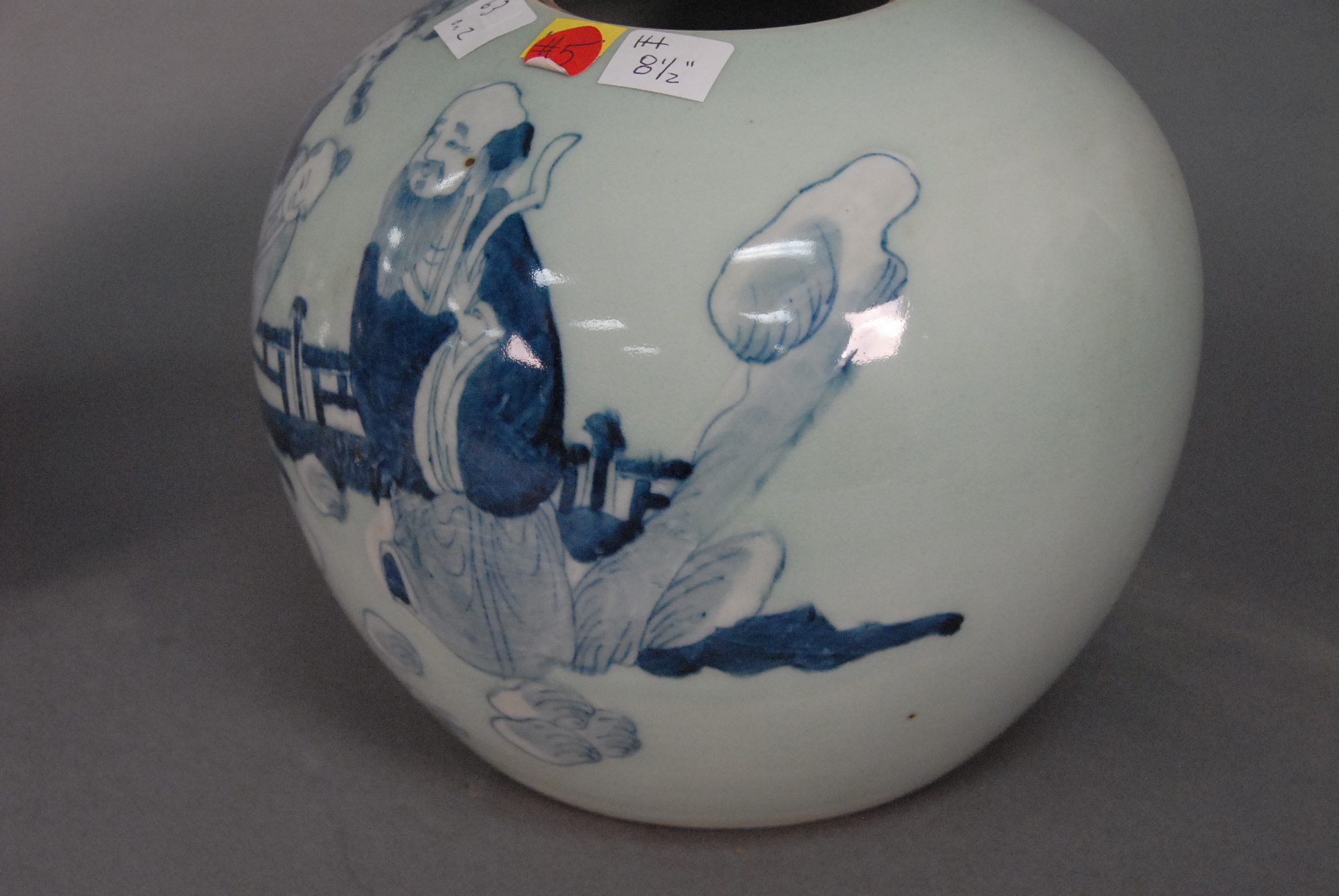 Lot 63: Two blue and white porcelain pieces to include a glazed ginger jar with scholars and no cover and a small jar.