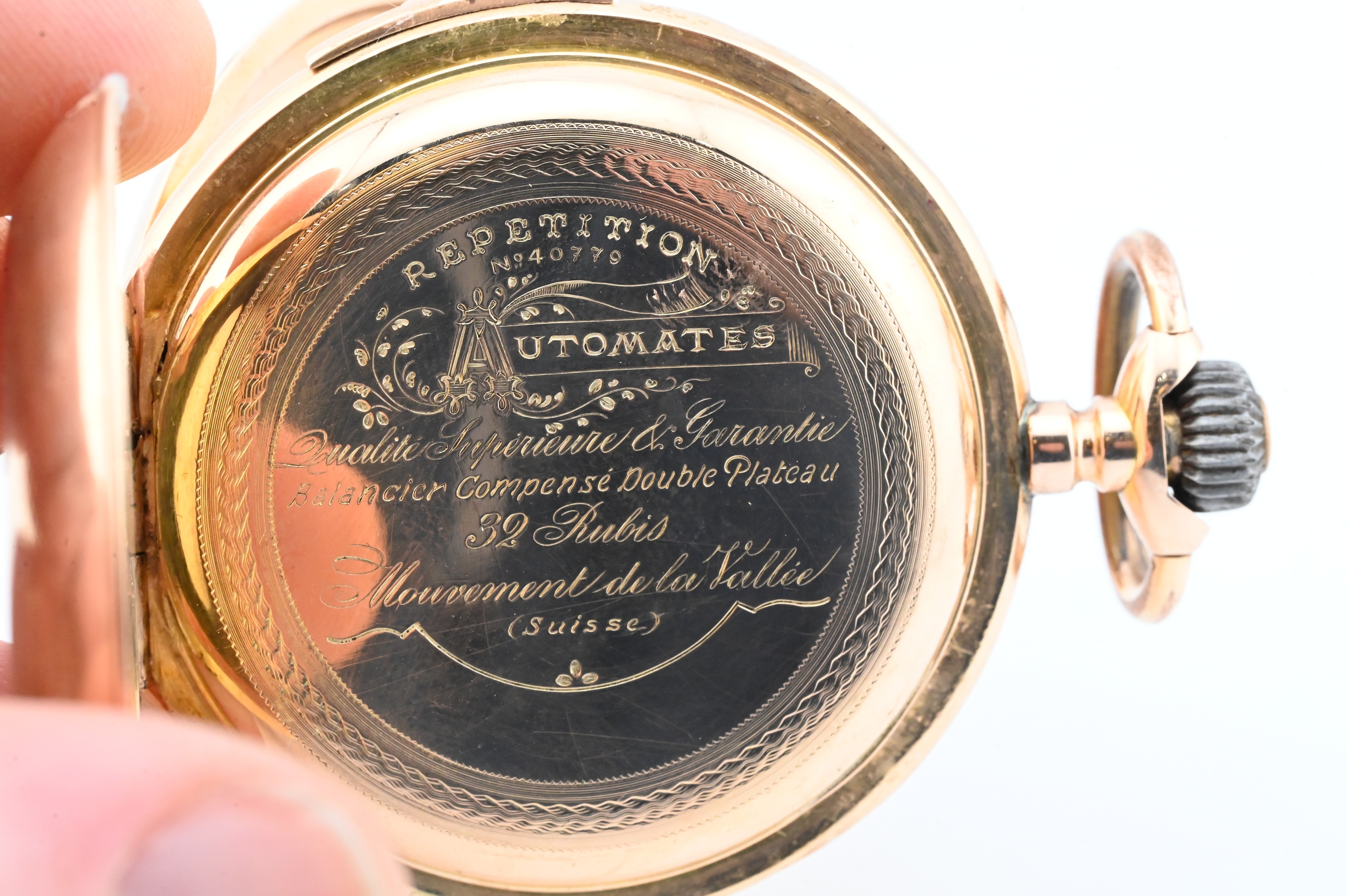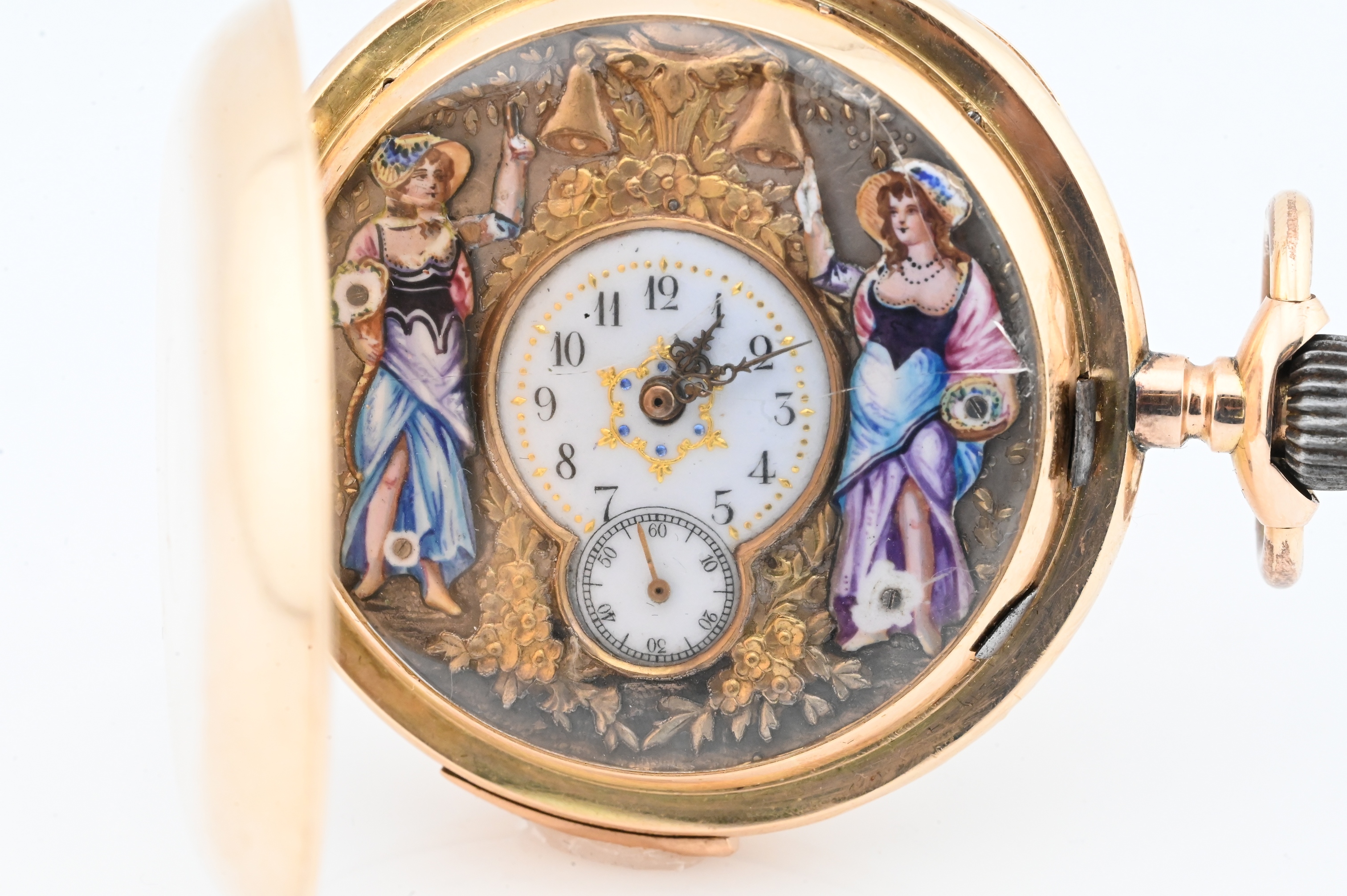 Lot 630: 14K Gold Quarter-Repeating Automaton Pocket Watch with Enamel Figural Scene