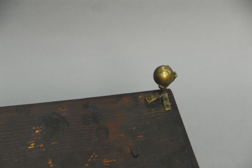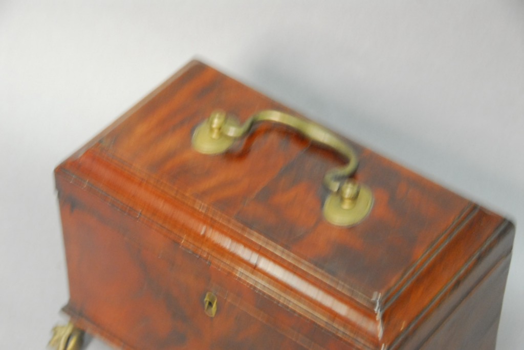 Mahogany lift top tea box with brass ball and claw feet small chip on top. – ht. 7in. wd. 9in.