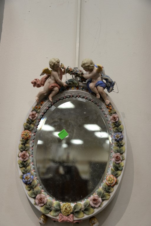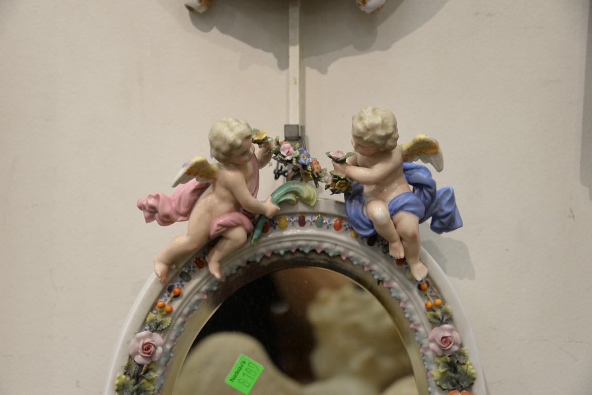 Lot 630: Pair of German porcelain framed mirrors, each with putti on top. some repairs ht. 14in., wd. 9 1/2in.