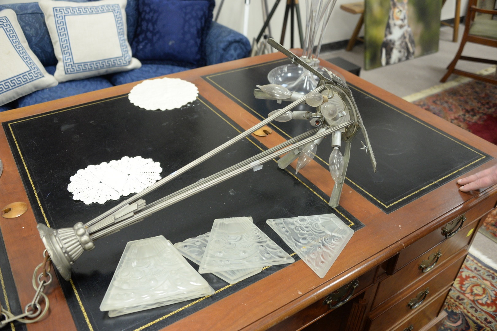 Lot 631: Five Piece Lot to include Art Deco hanging six light chandelier with frosted panels height 27 inches two clear glass epergnes heig…