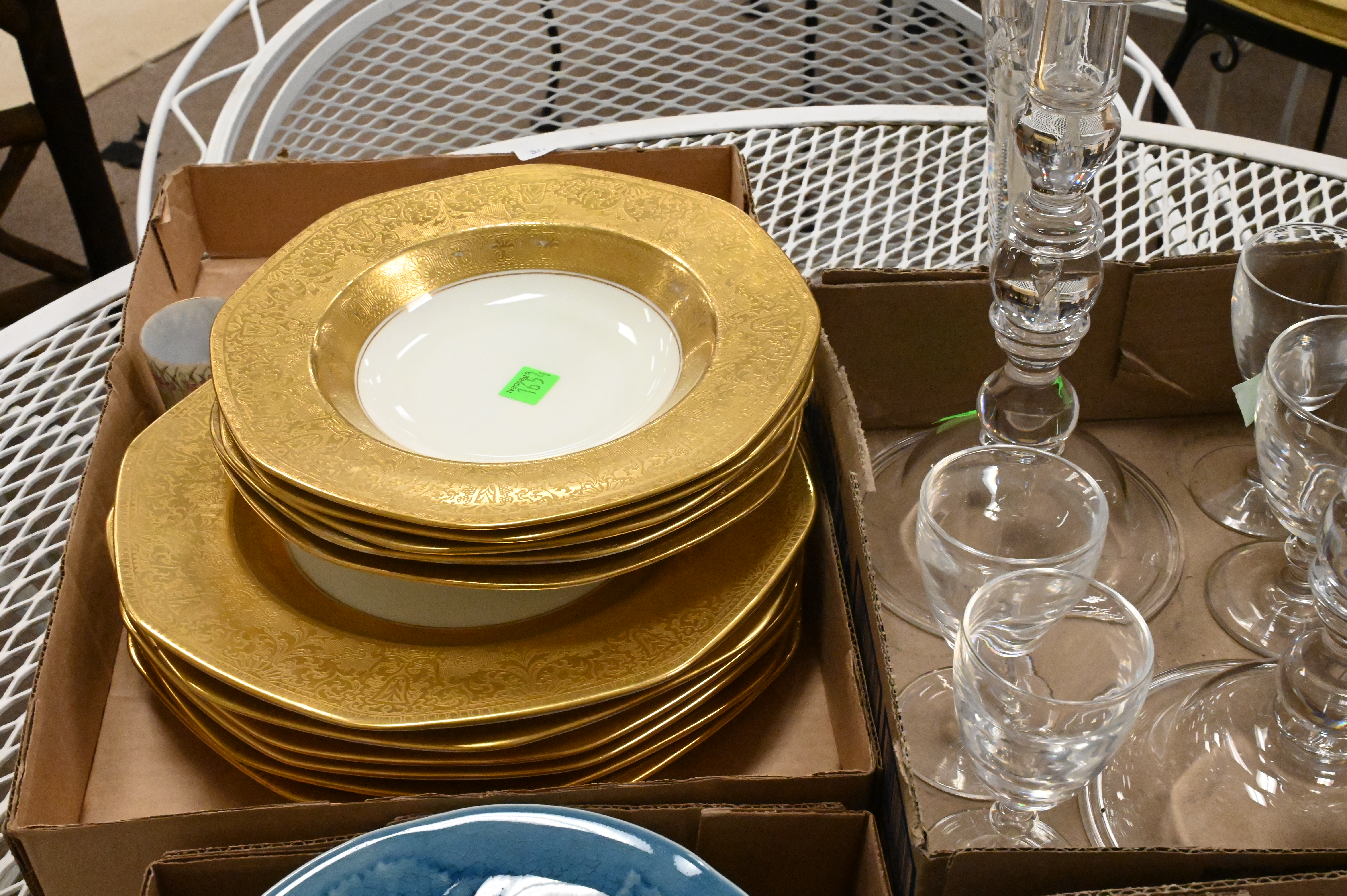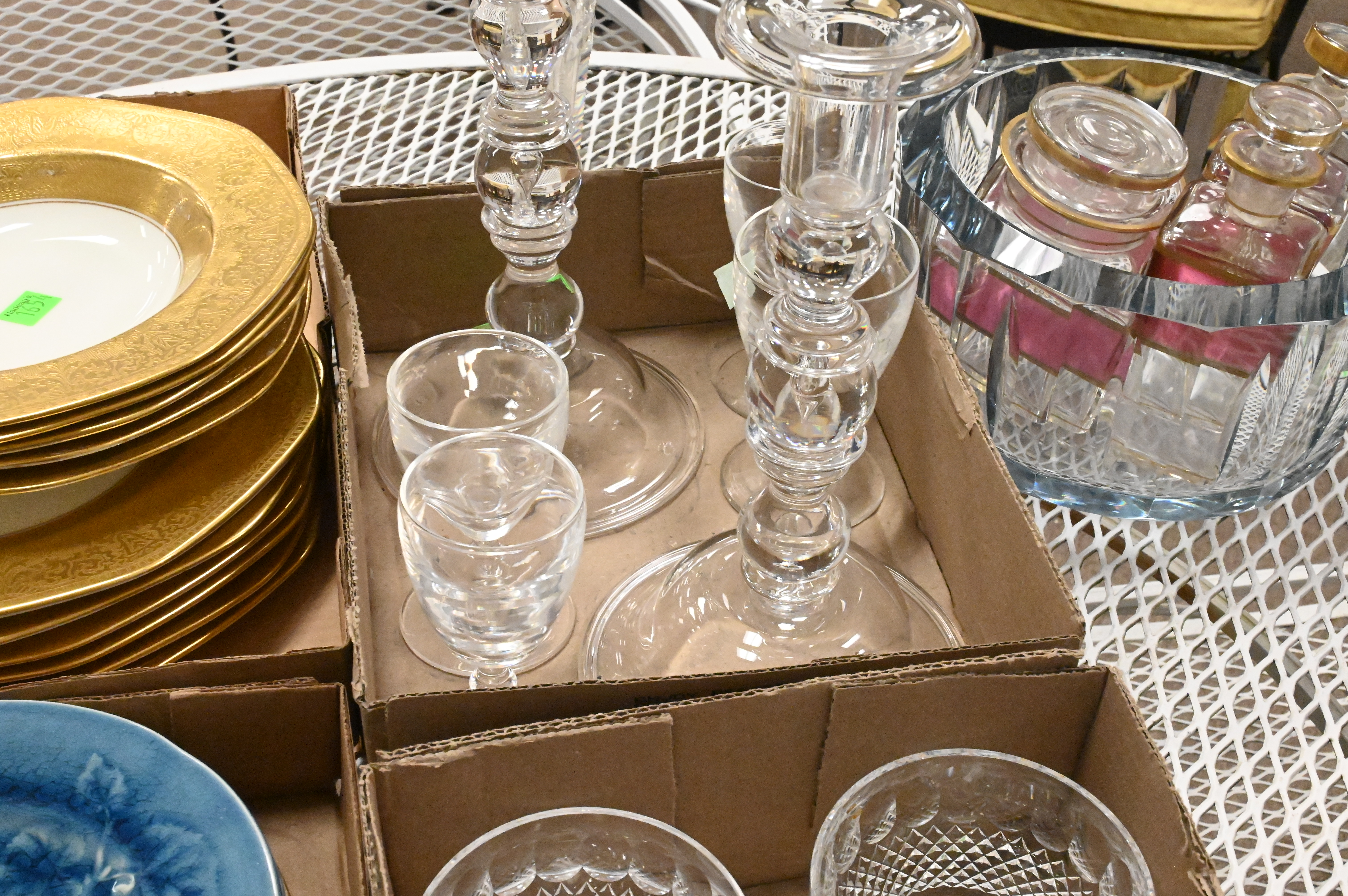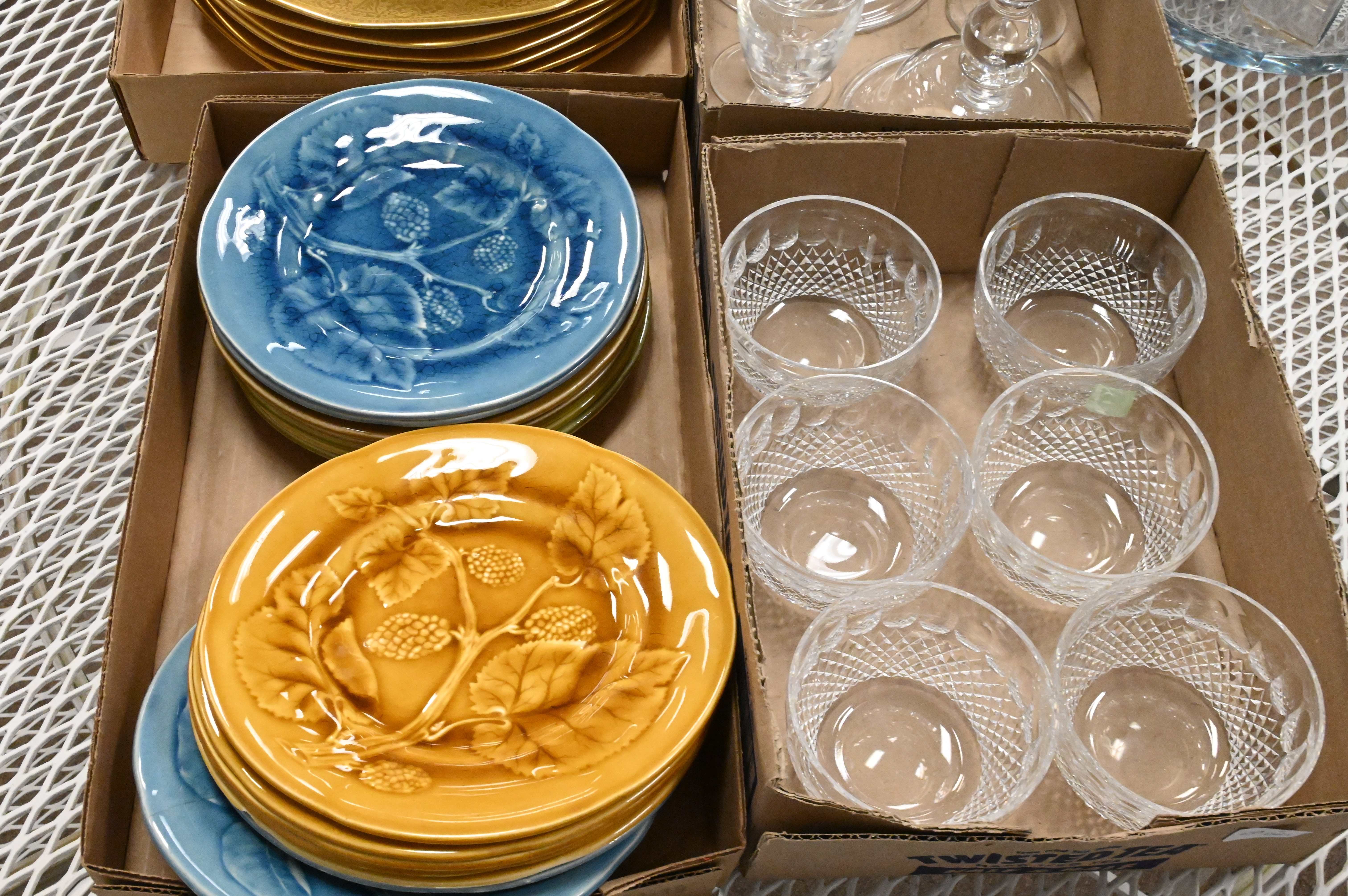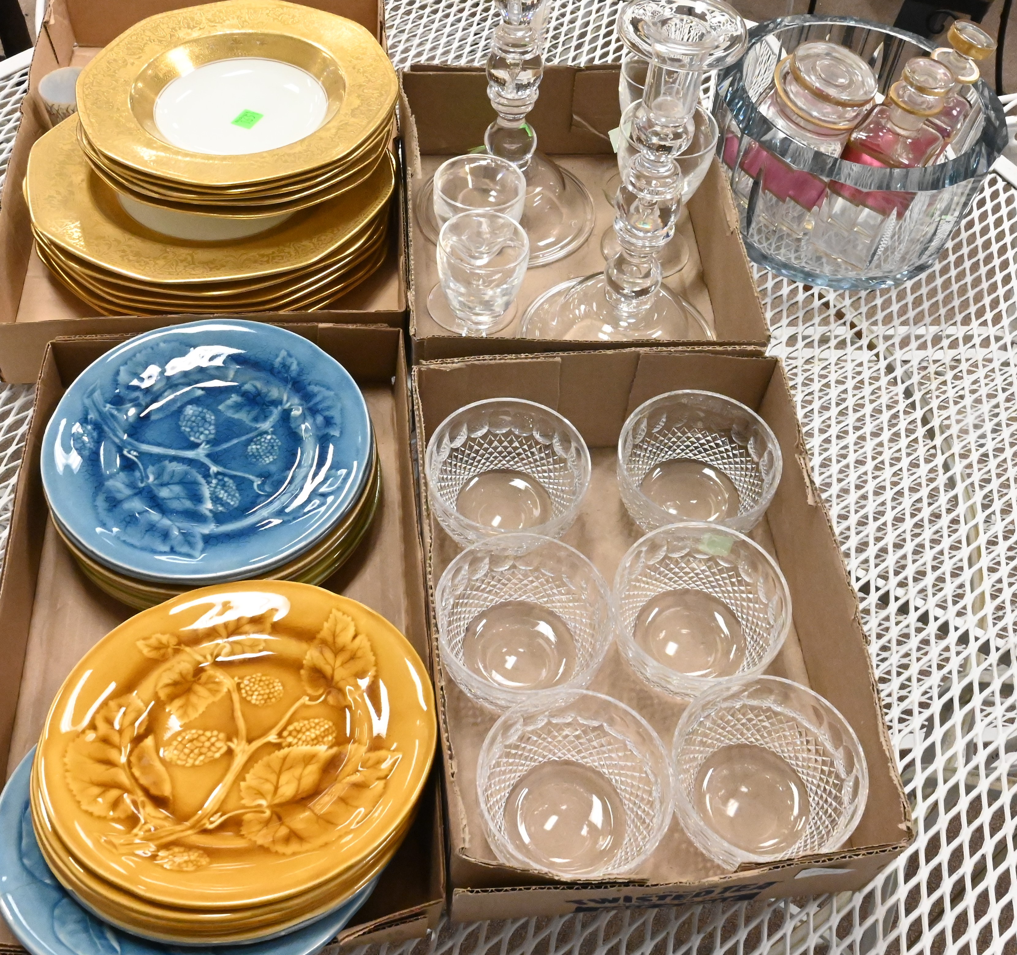 Four Box Lot of Large Glass and Dinner Ware, to include six piece group of Waterford crystal “Colleen” nut dishes, having “Waterford” etched marking on underside, height 2 1/2 inches, diameter 3 3/4 inches, a pair of crystal teardrop candlesticks, having “Steuben” signature etched on underside, height 10 inches, four glass sterns height 4 1/2 inches, 12 crescent England dinnerware, having porcelain octogonal shape and gilt borders to include six soup bowls (diameter 9 inches), and six dinner plates (diameter 10 inches); Strombergshyttan Modern Swedish crystal clear blue bowl, signed on underside and marked 7389, height 5 inches, diameter 8 1/2 inches; group of 14 Choisy Le Roi Majolica plates with botonical designs, marked on underside, along with trumpet vase with serling rim, three vanity bottles and two Japanese shot glasses, diameter 7 1/2 inches