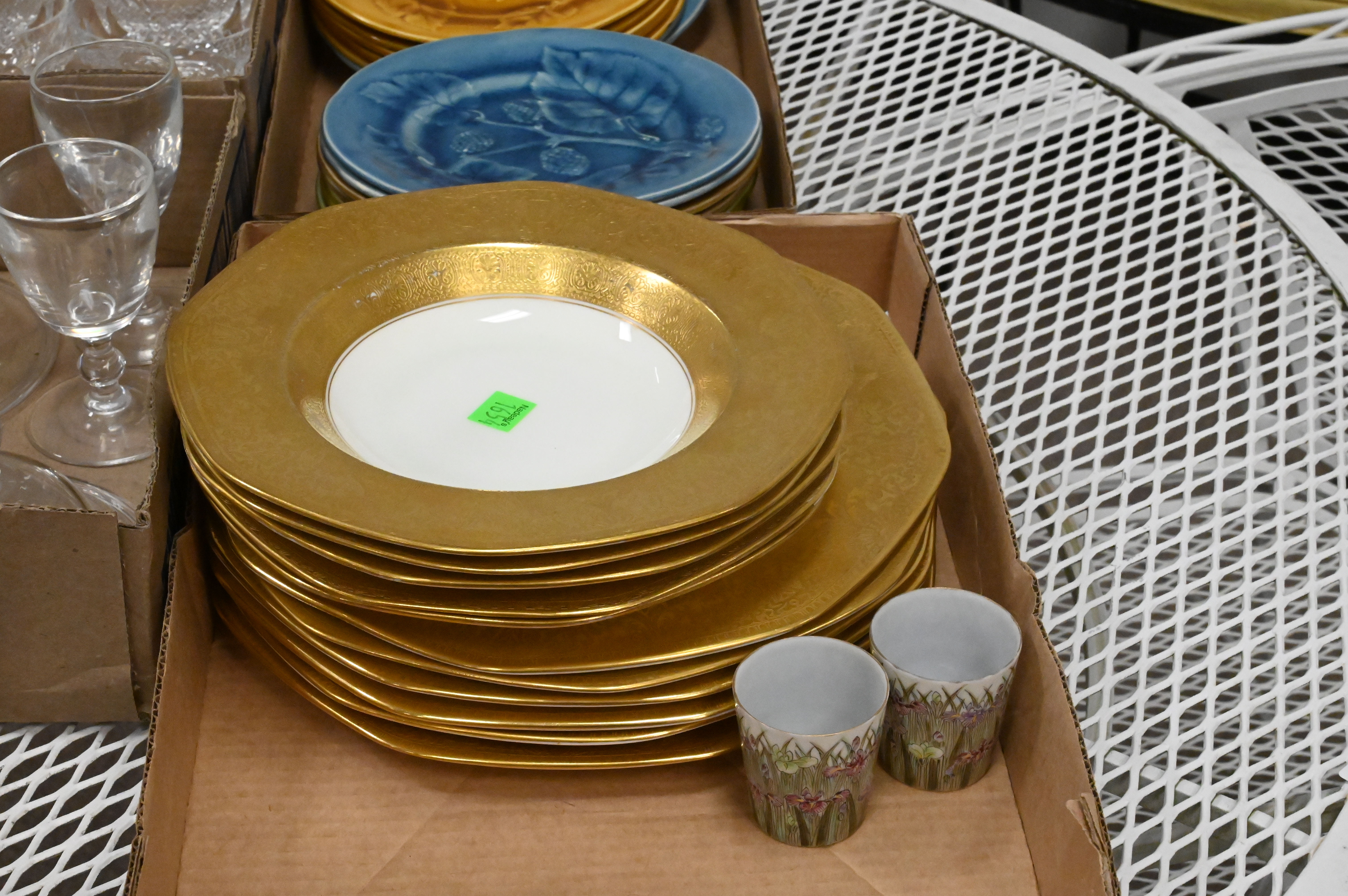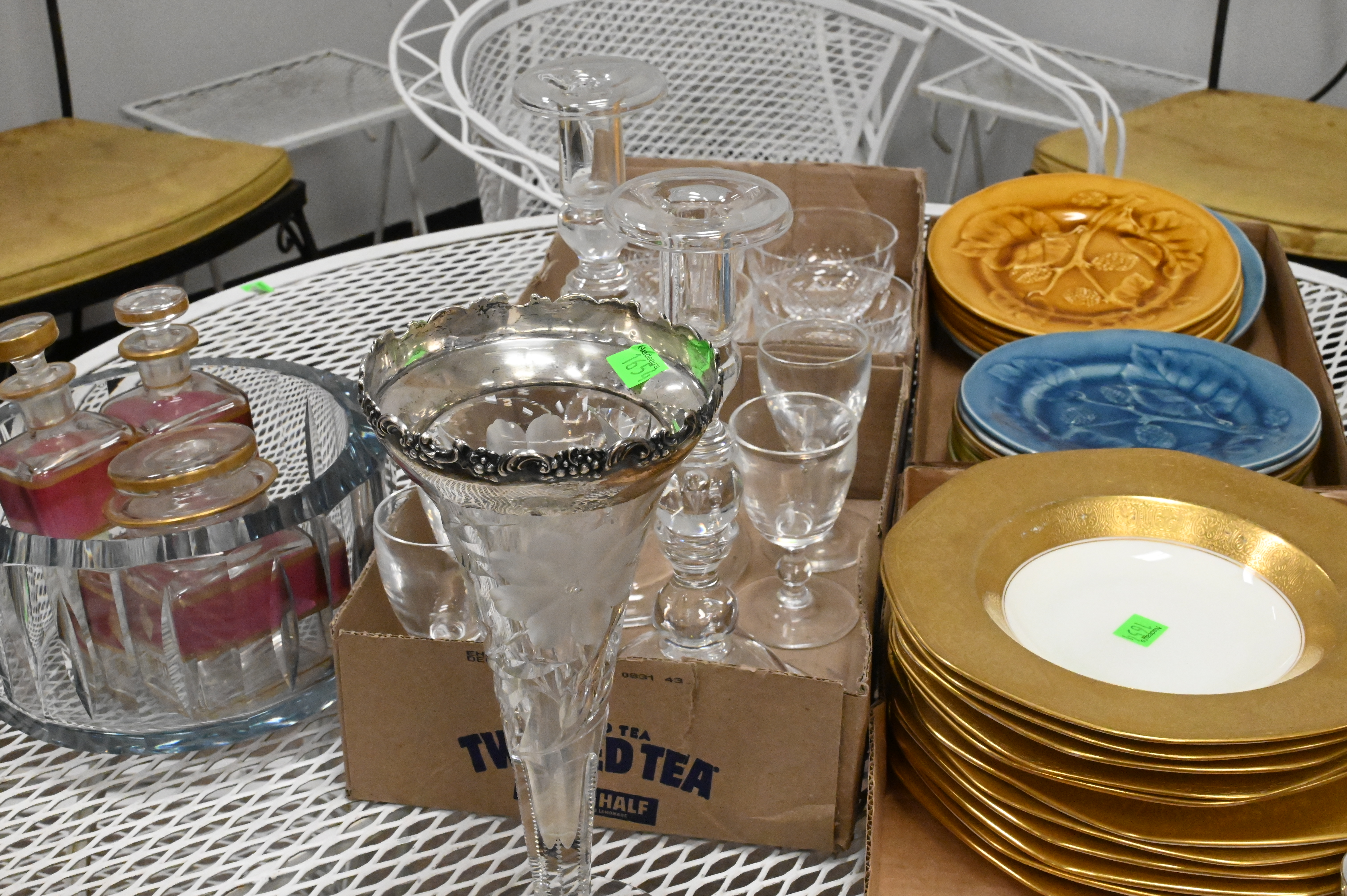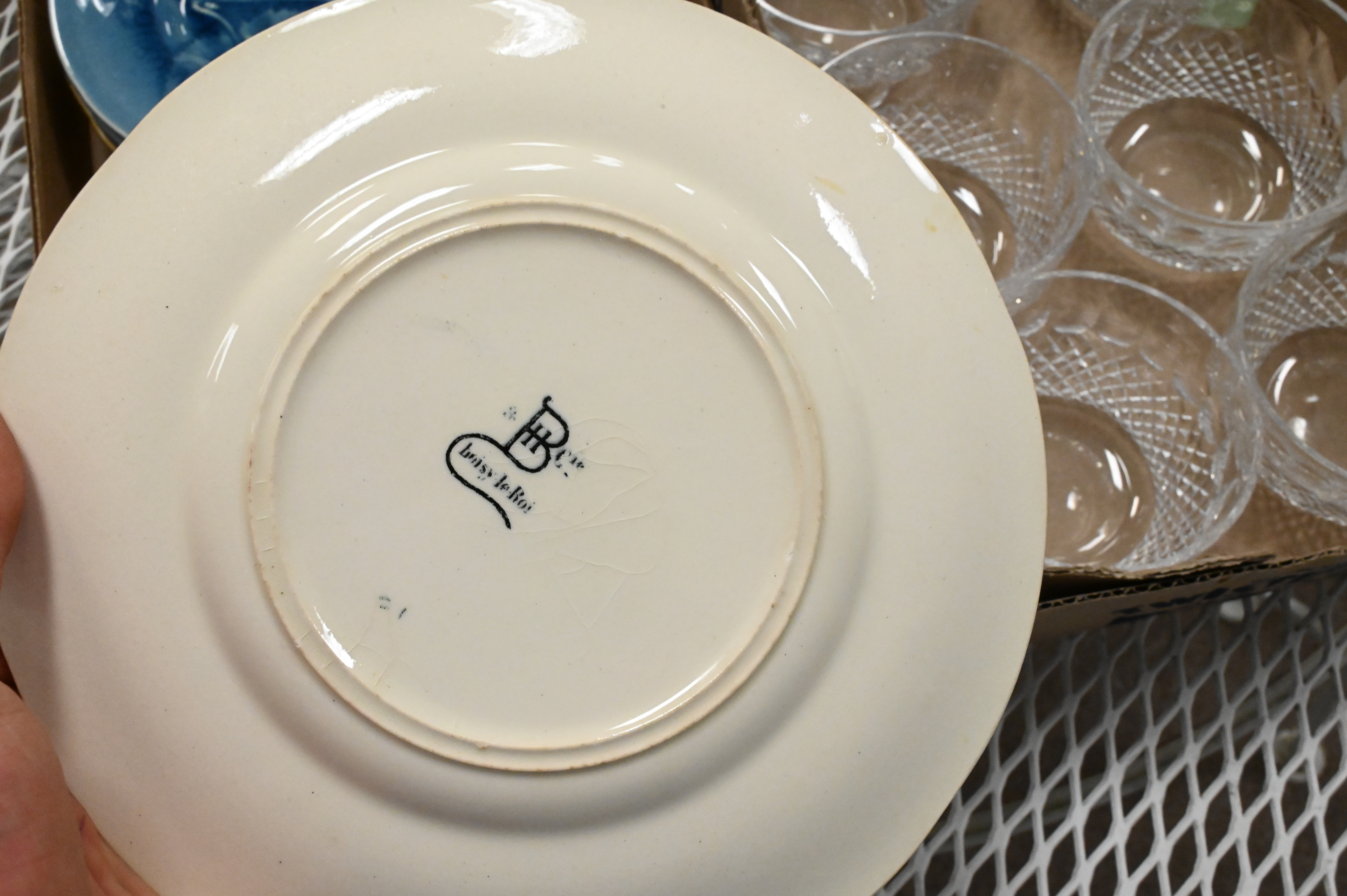 Four Box Lot of Large Glass and Dinner Ware, to include six piece group of Waterford crystal “Colleen” nut dishes, having “Waterford” etched marking on underside, height 2 1/2 inches, diameter 3 3/4 inches, a pair of crystal teardrop candlesticks, having “Steuben” signature etched on underside, height 10 inches, four glass sterns height 4 1/2 inches, 12 crescent England dinnerware, having porcelain octogonal shape and gilt borders to include six soup bowls (diameter 9 inches), and six dinner plates (diameter 10 inches); Strombergshyttan Modern Swedish crystal clear blue bowl, signed on underside and marked 7389, height 5 inches, diameter 8 1/2 inches; group of 14 Choisy Le Roi Majolica plates with botonical designs, marked on underside, along with trumpet vase with serling rim, three vanity bottles and two Japanese shot glasses, diameter 7 1/2 inches