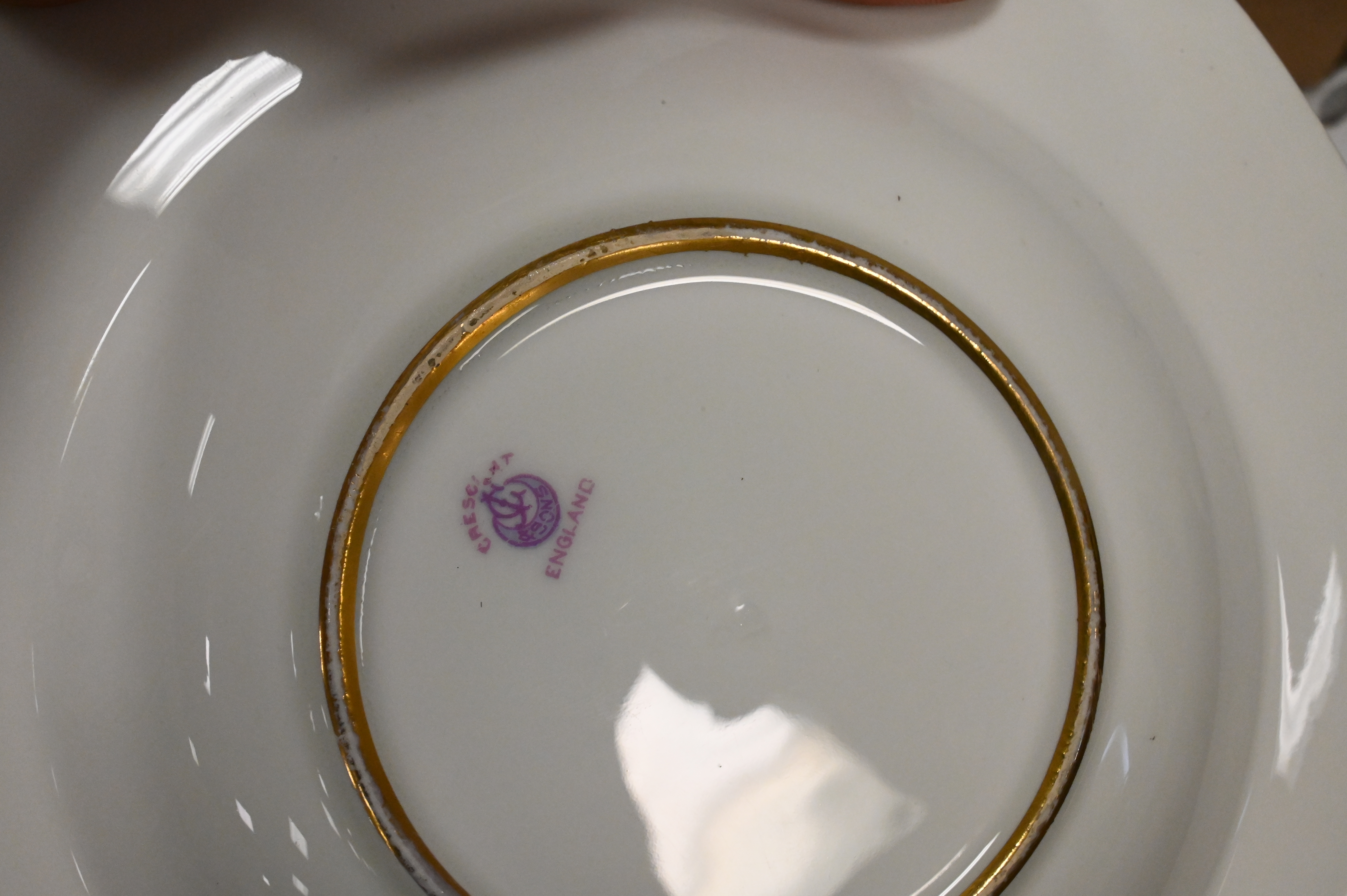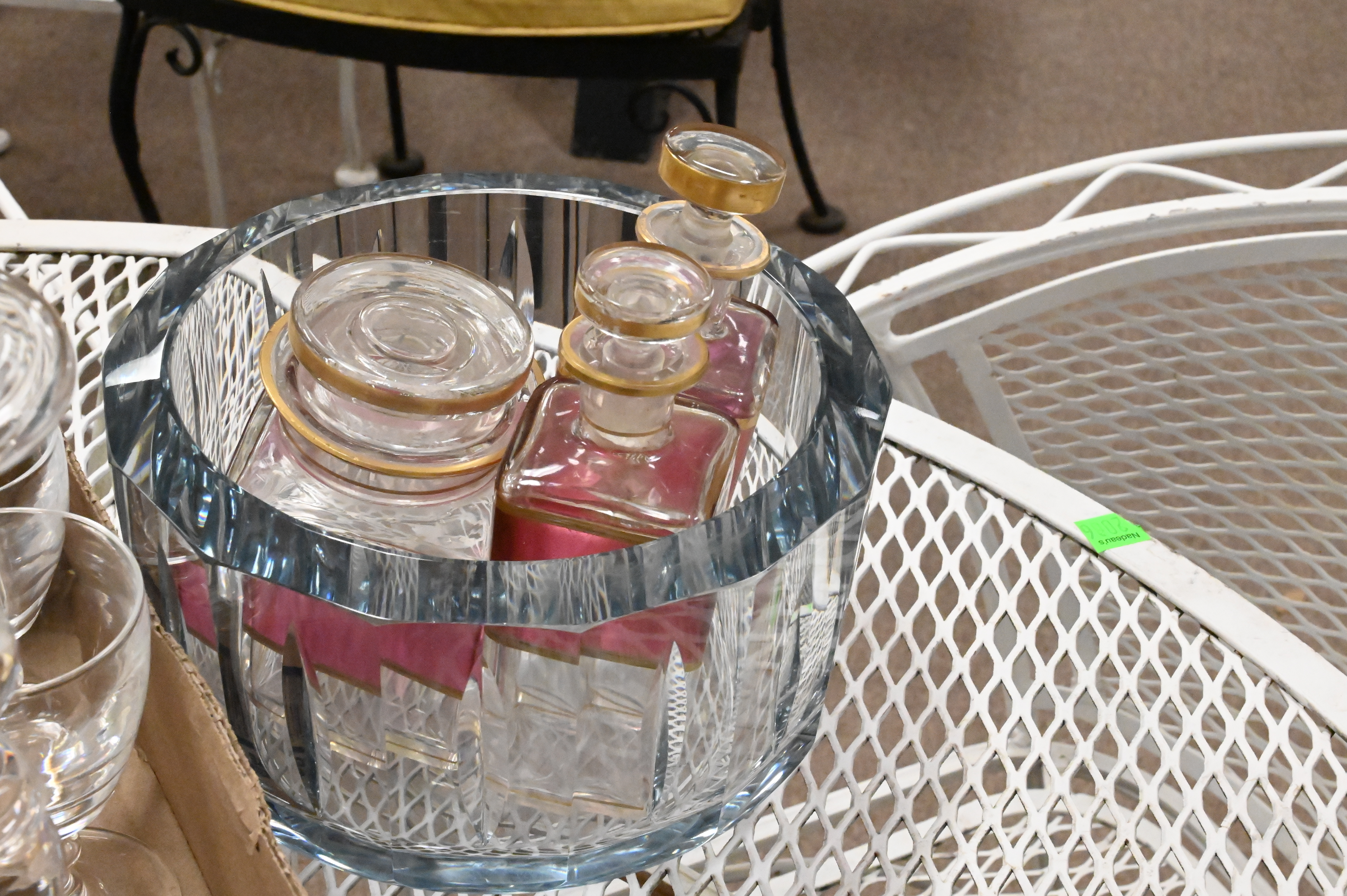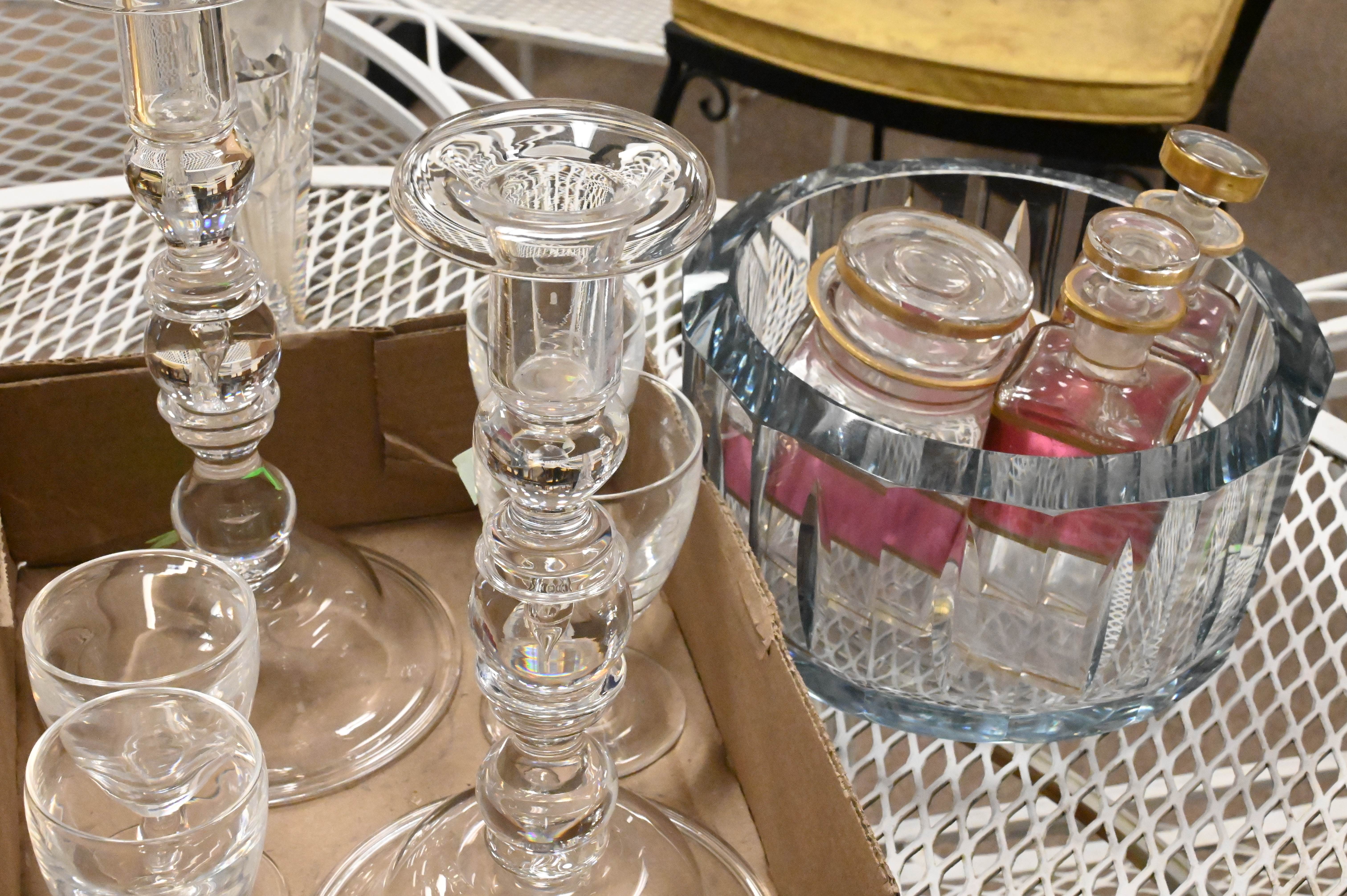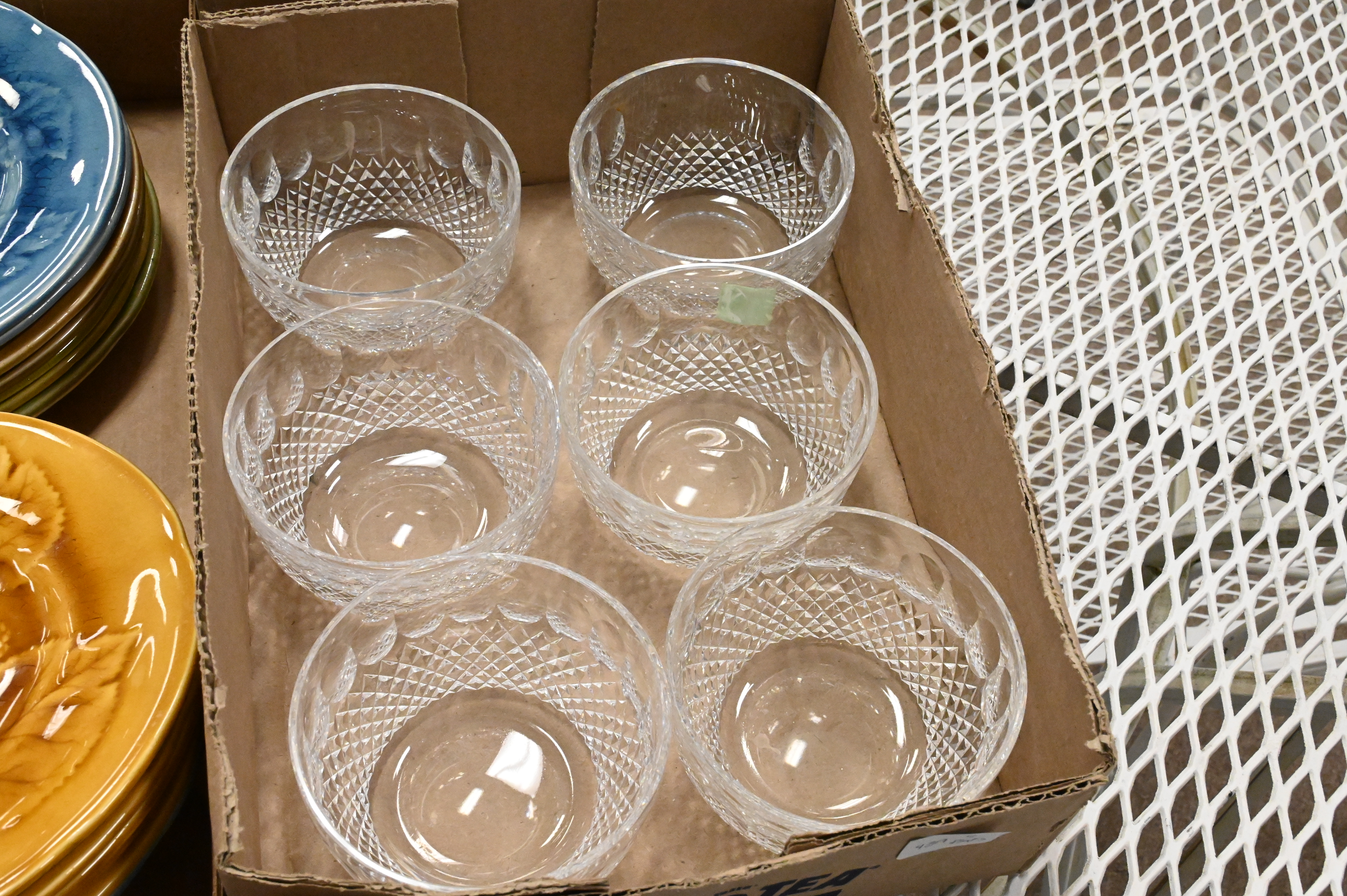 Four Box Lot of Large Glass and Dinner Ware, to include six piece group of Waterford crystal “Colleen” nut dishes, having “Waterford” etched marking on underside, height 2 1/2 inches, diameter 3 3/4 inches, a pair of crystal teardrop candlesticks, having “Steuben” signature etched on underside, height 10 inches, four glass sterns height 4 1/2 inches, 12 crescent England dinnerware, having porcelain octogonal shape and gilt borders to include six soup bowls (diameter 9 inches), and six dinner plates (diameter 10 inches); Strombergshyttan Modern Swedish crystal clear blue bowl, signed on underside and marked 7389, height 5 inches, diameter 8 1/2 inches; group of 14 Choisy Le Roi Majolica plates with botonical designs, marked on underside, along with trumpet vase with serling rim, three vanity bottles and two Japanese shot glasses, diameter 7 1/2 inches