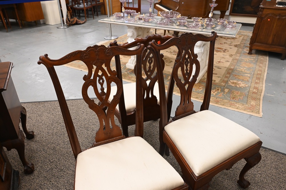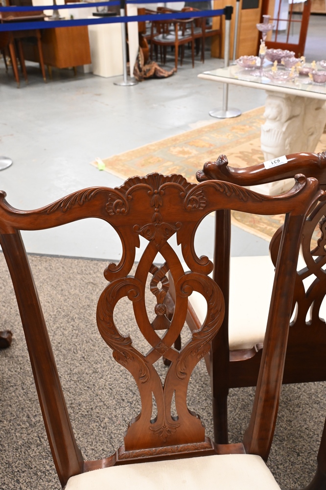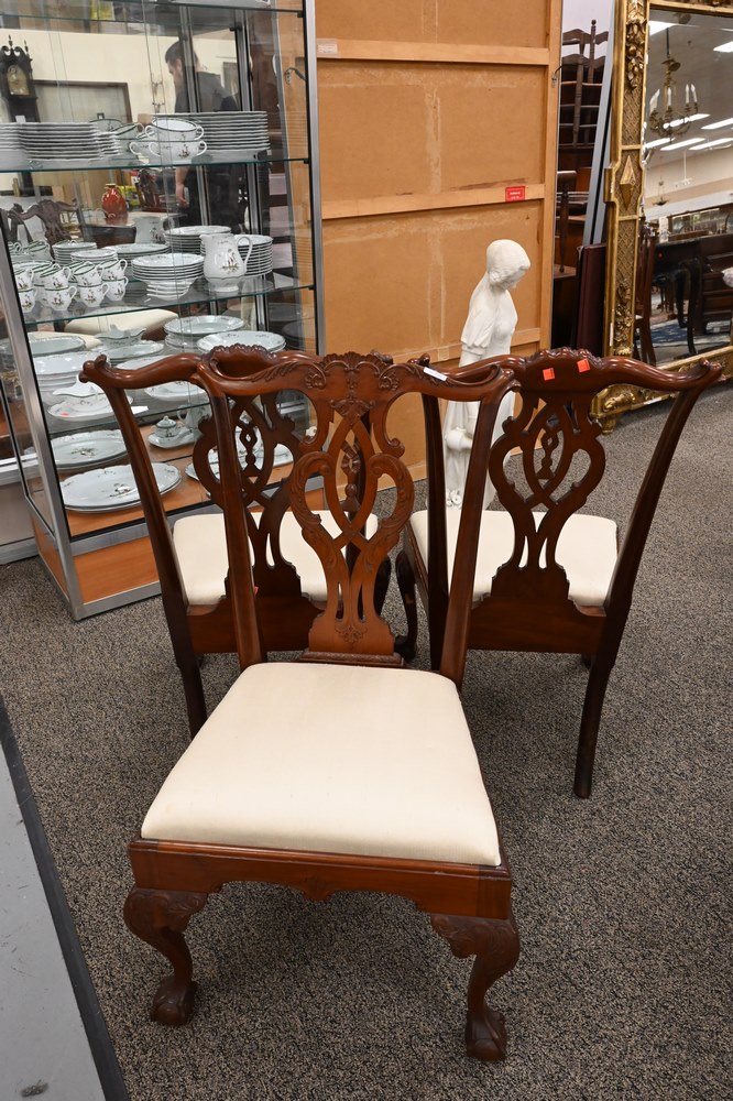 Lot 631: Margolis Rare Set of Three Mahogany Chippendale Style Tassel Back Side Chairs, having carved back, carved cabriole legs and ball and…