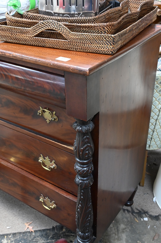 Lot 632: Empire Mahogany Two Over Three Drawer Chest, having acanthus carved pillars and claw feet, height 40 inches, top 23 1/2″ x 49 1/2″.
