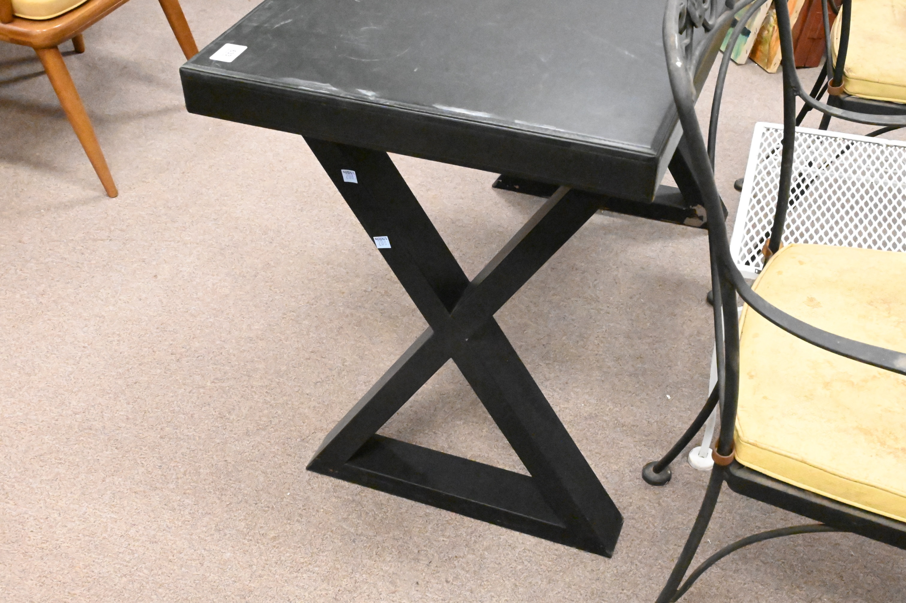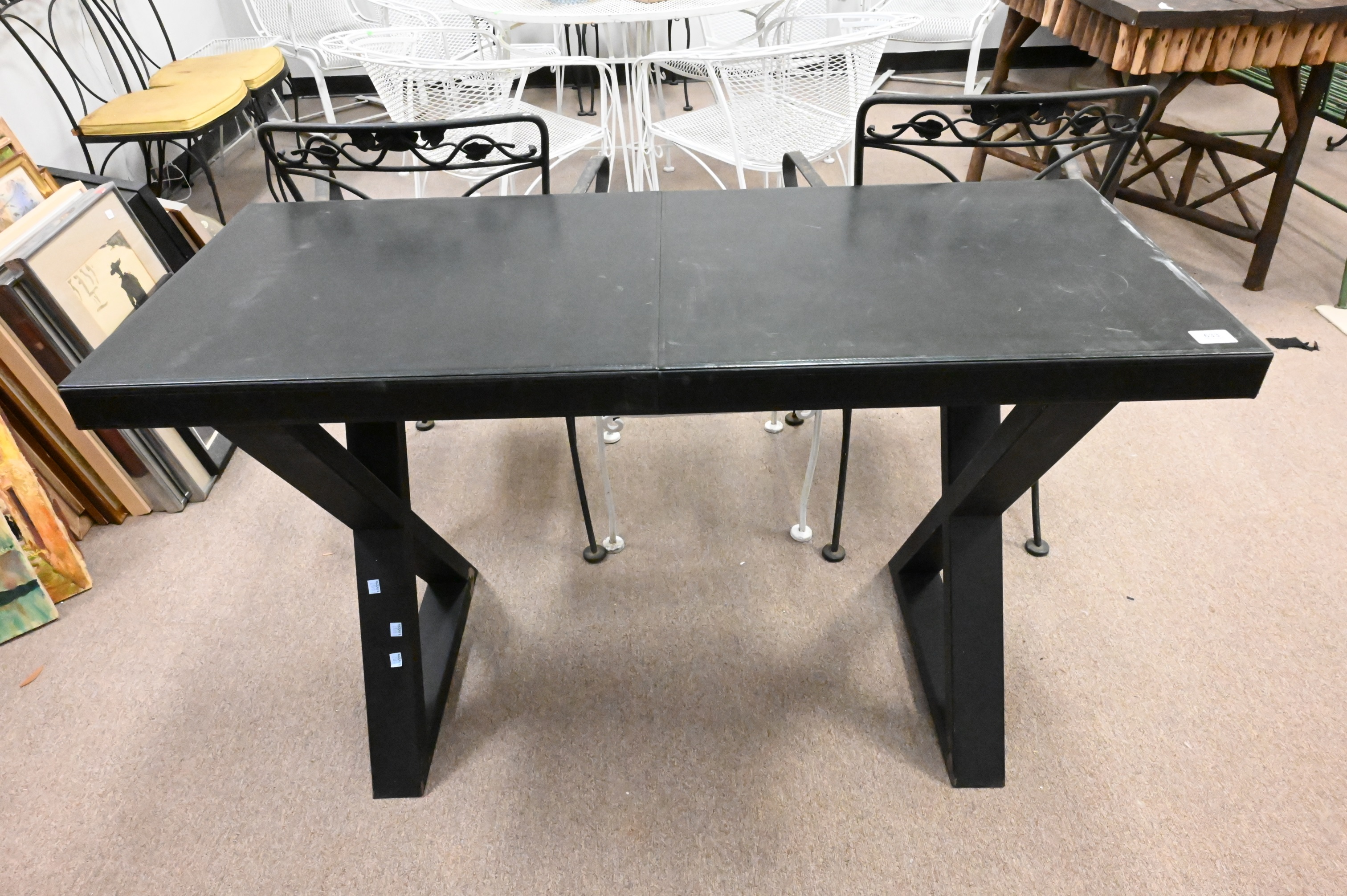 Leather Writing Table, on metal “X” Base, height 28 1/2 inches, top 20″ x 47 1/2″.