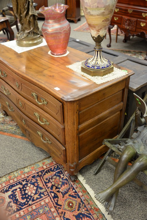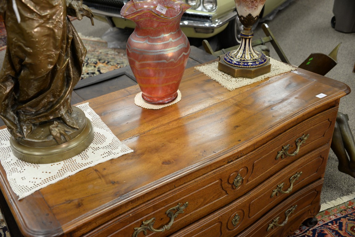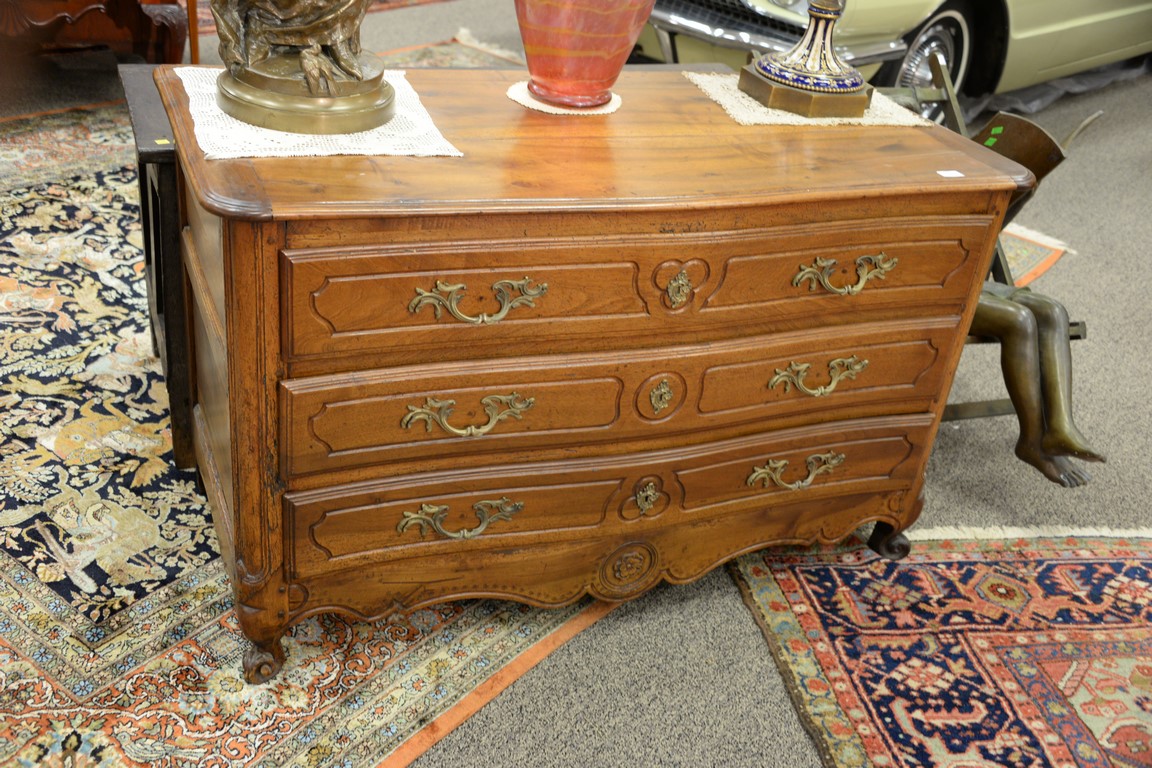 Lot 633: Louis XV fruitwood commode with three drawers, 18th century. restored ht. 31in., wd. 53in., dp. 24in.