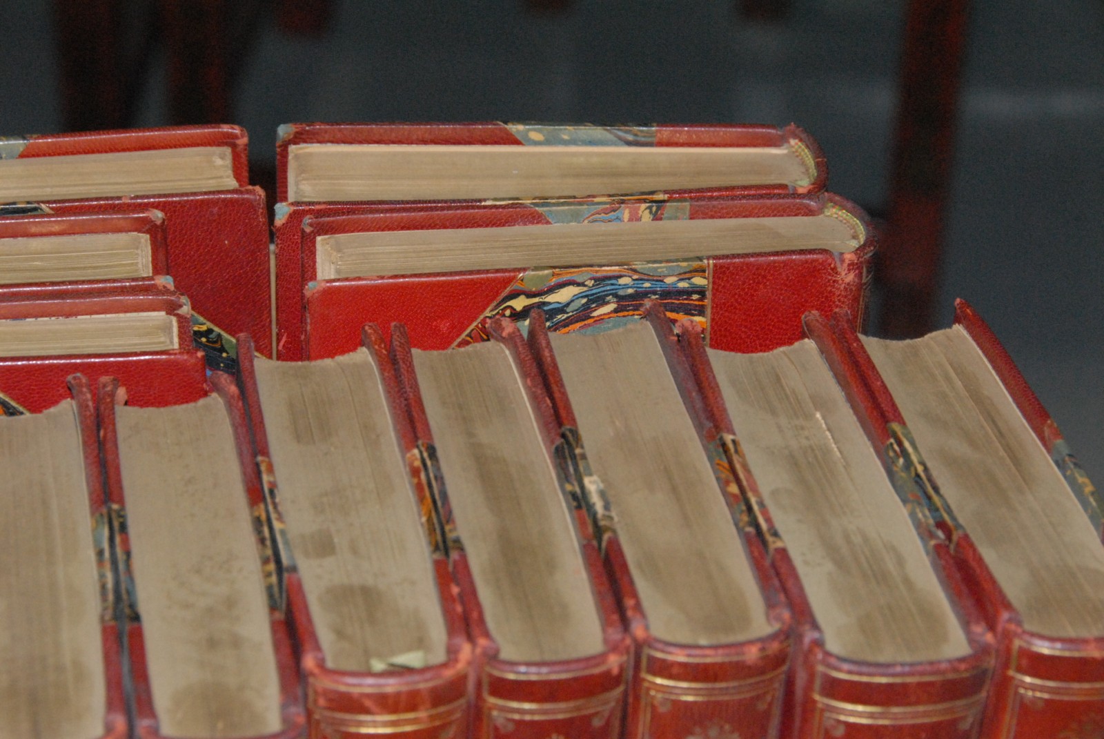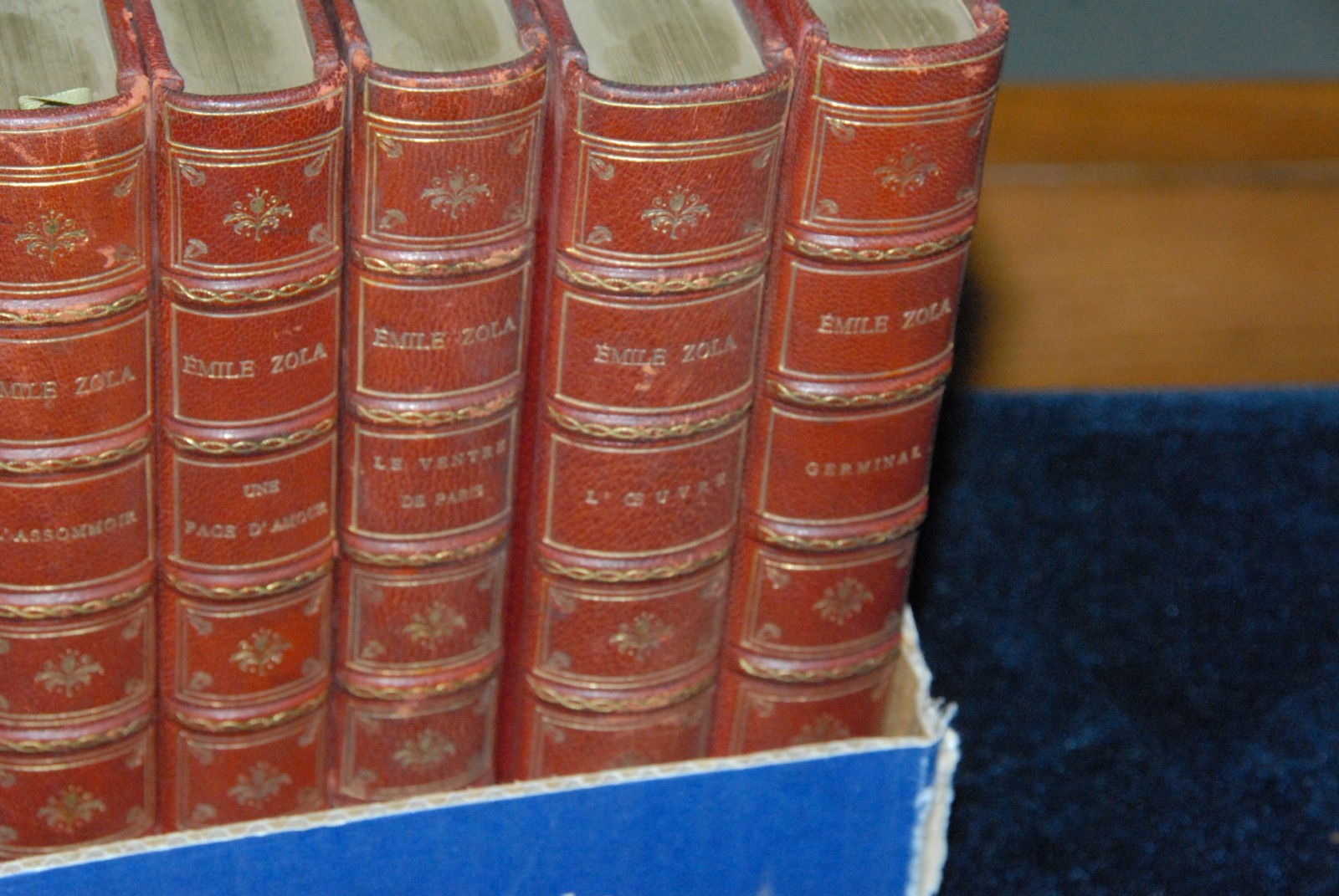Zola’s Works, Paris 1910, fifteen volumes in red 3/4 leather.