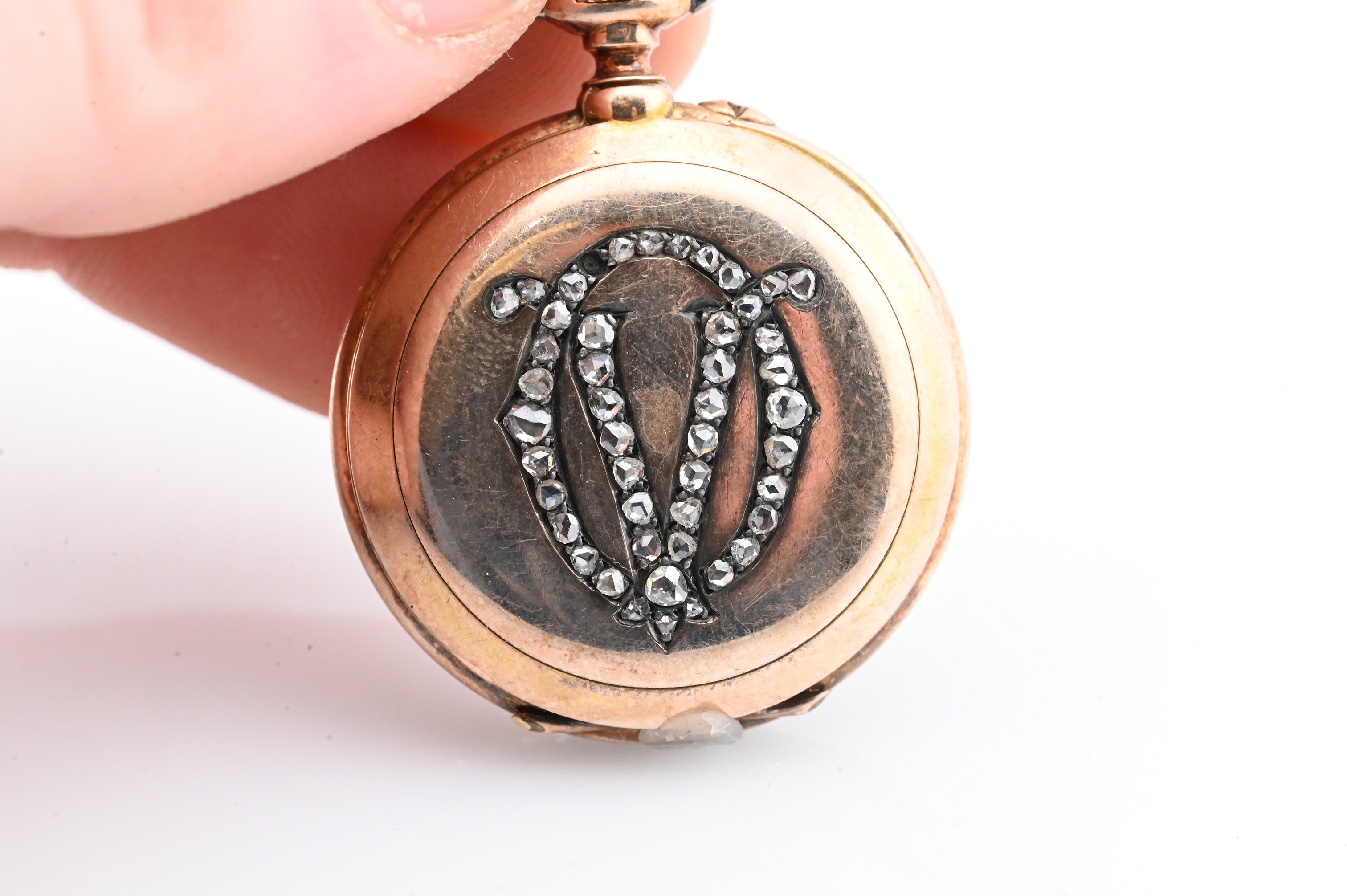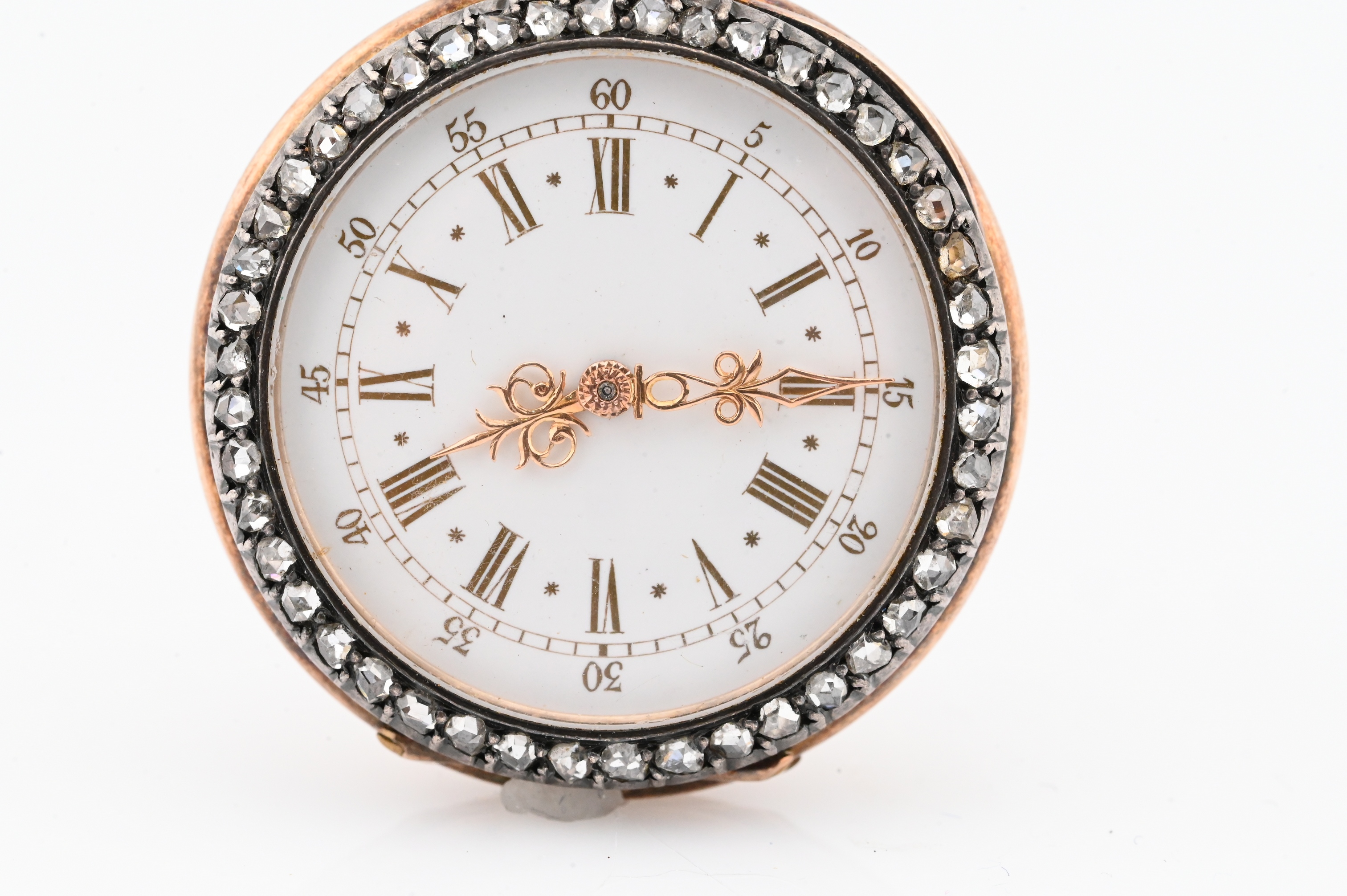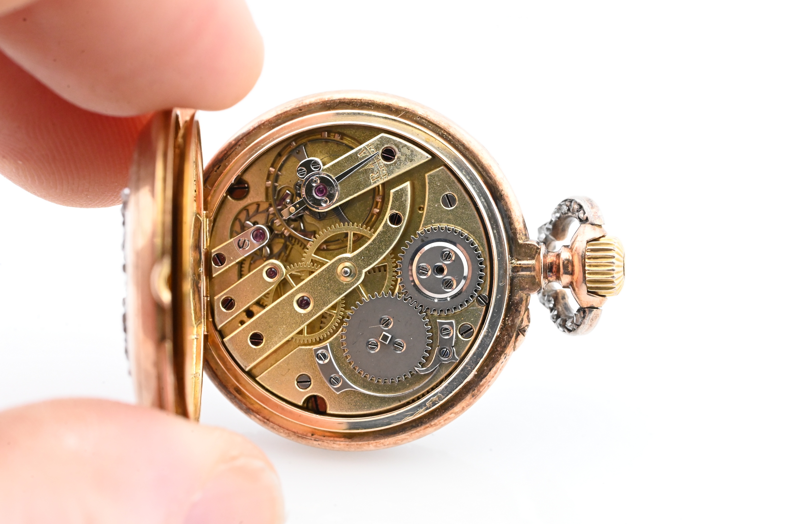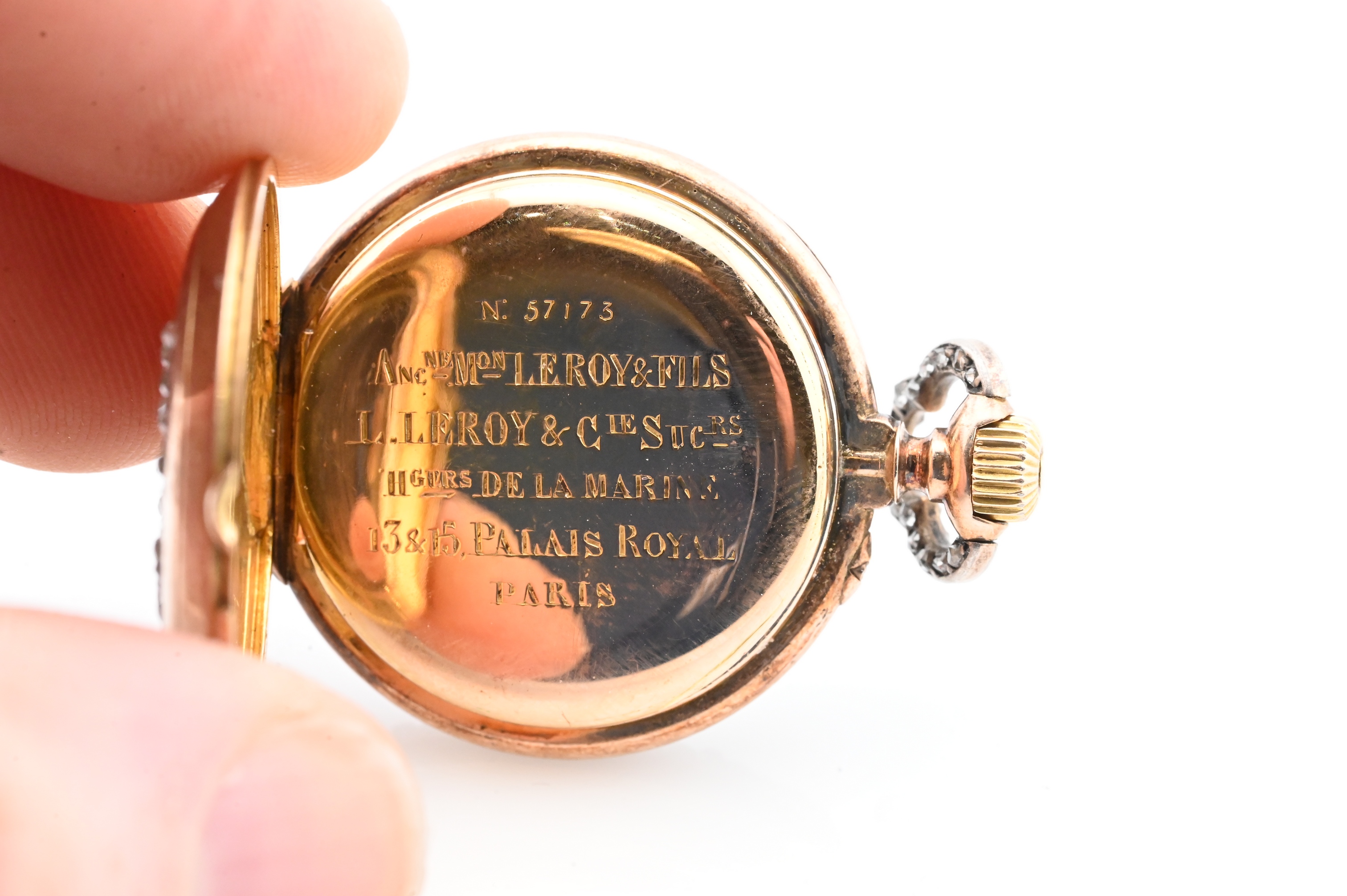 signed Ancienne Maison Leroy & Fils / L. Leroy & Cie Sucrs / Horlogers de la Marine / 13 & 15 Palais Royal Paris, no. 57173; the circular white enamel dial with gilt Roman numerals and outer Arabic minute track, gilt hands, and rose-cut diamond bezel surround, enclosed within a hinged case back further decorated with a monogram motif in rose-cut diamonds; the interior revealing a finely jeweled lever movement with gilt plates and visible wheels; the bow accented with diamonds (two missing), fitted with engine-turned crown