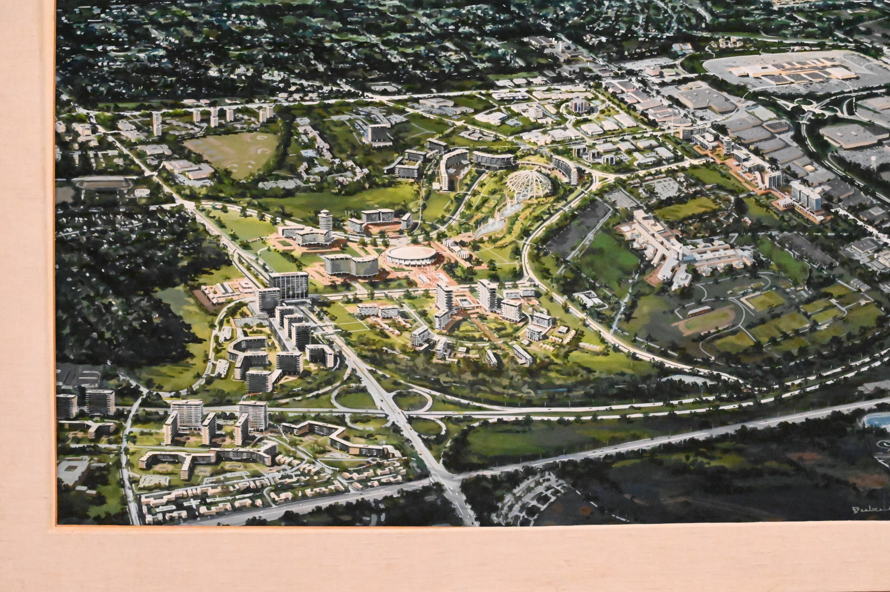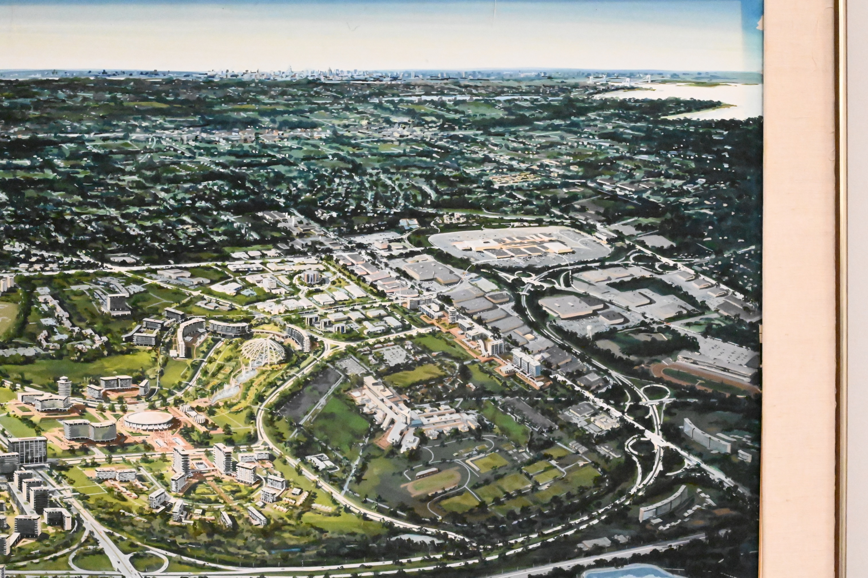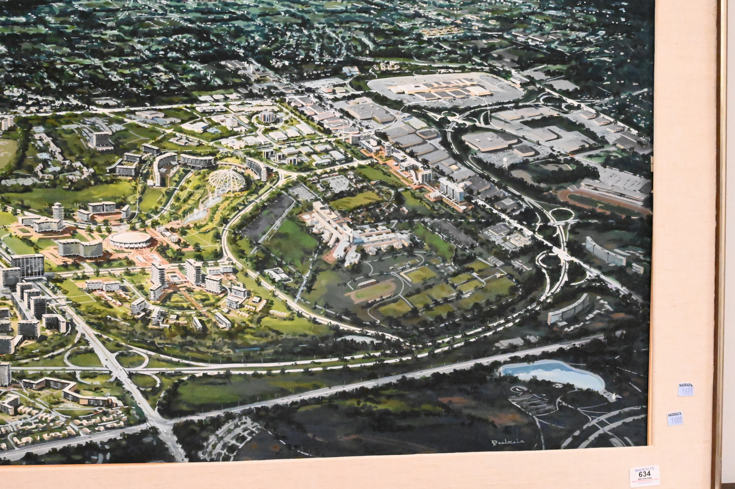 Artist Unknown Birds Eye View of a City (possibly Long Island) guache on paper signed illegibly lower right 30 1/2″ x 40″
