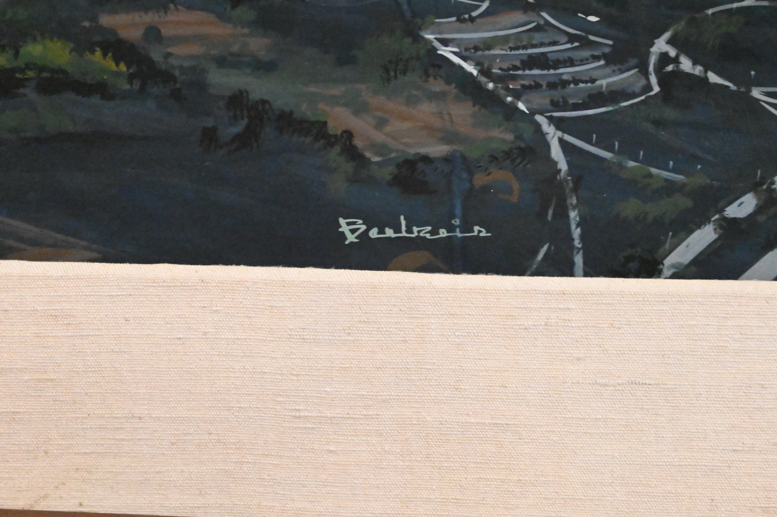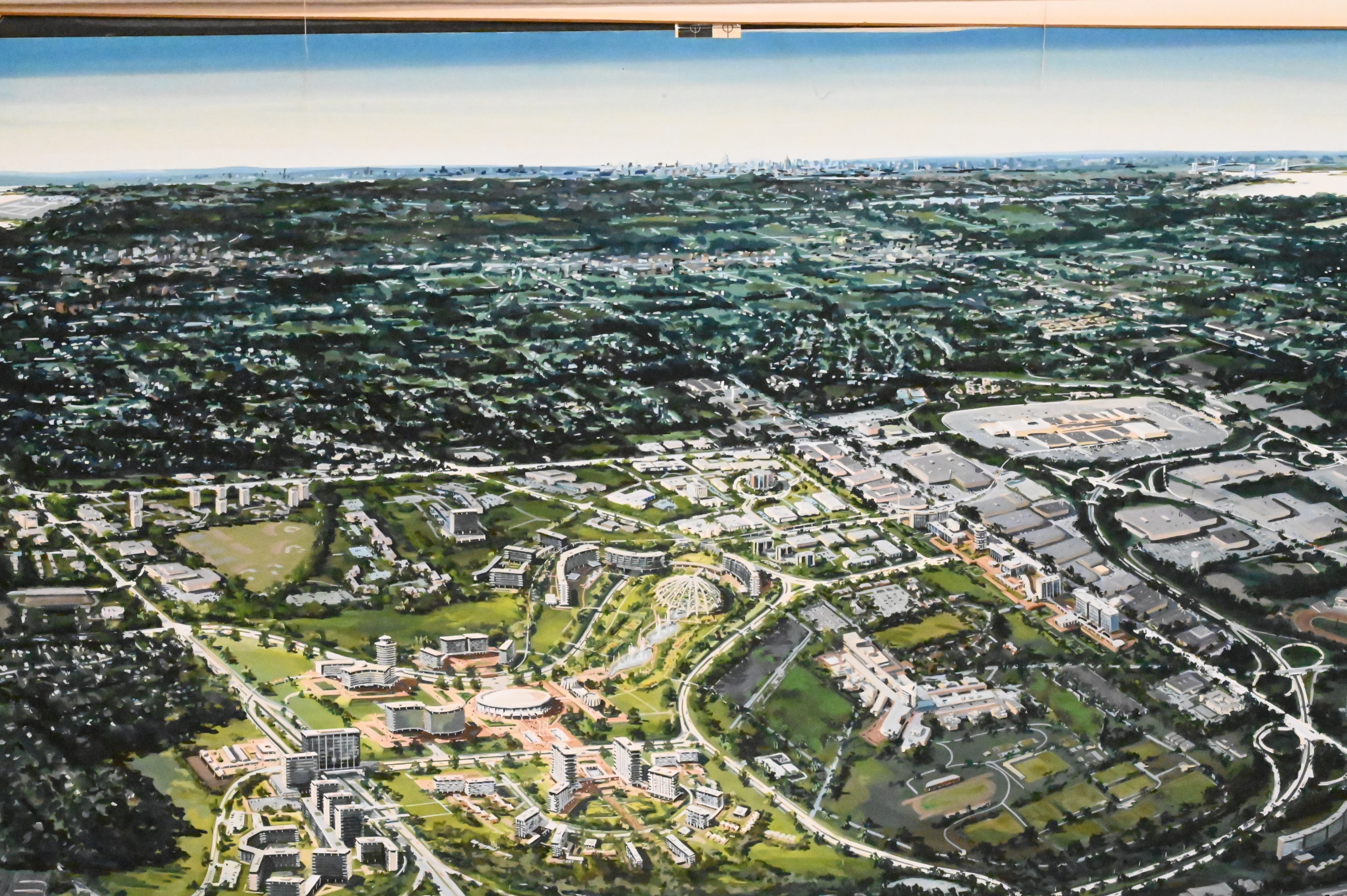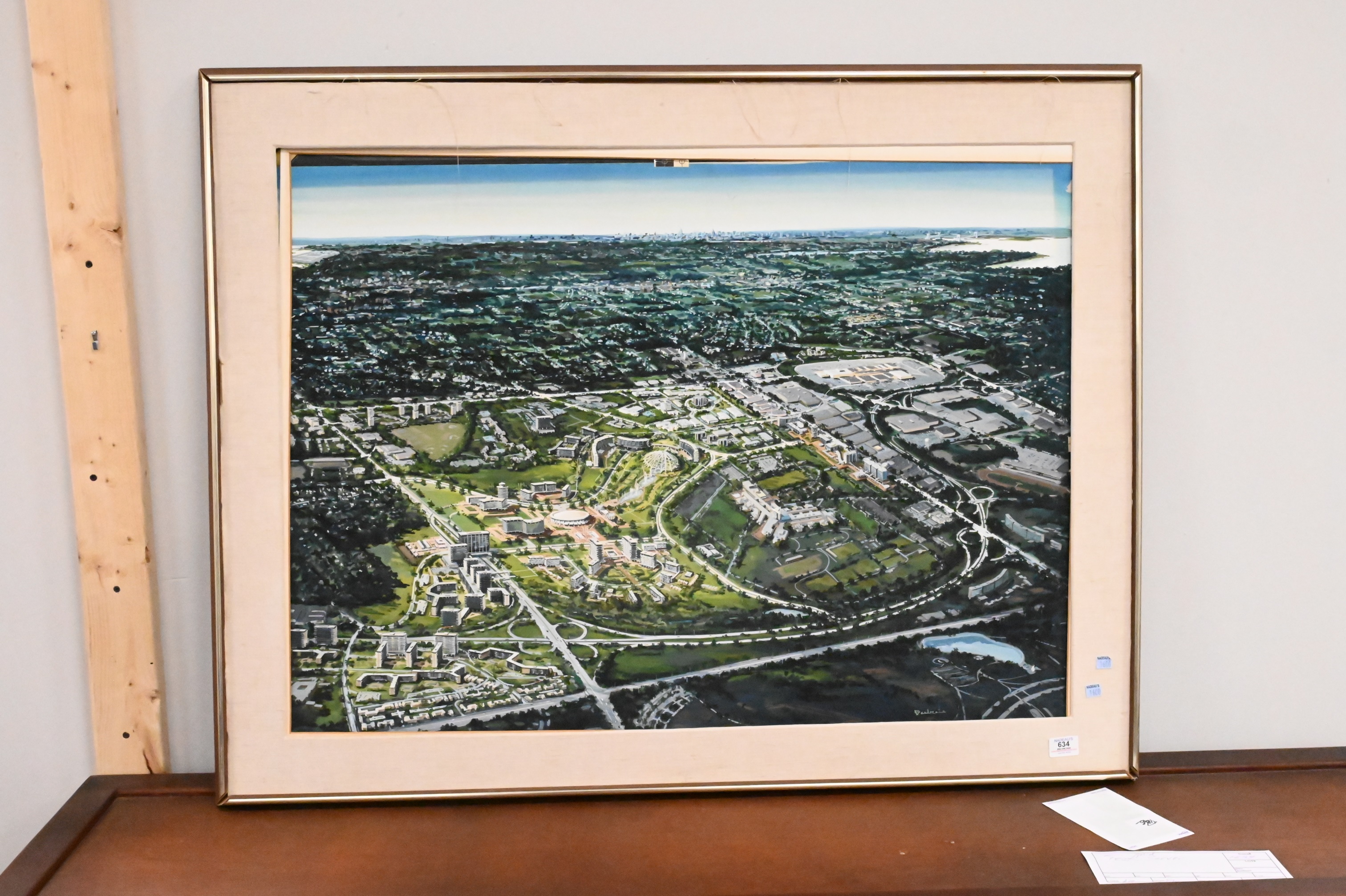 Artist Unknown Birds Eye View of a City (possibly Long Island) guache on paper signed illegibly lower right 30 1/2″ x 40″