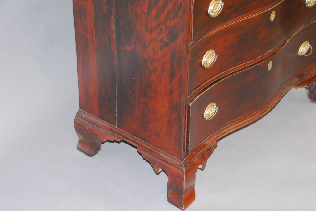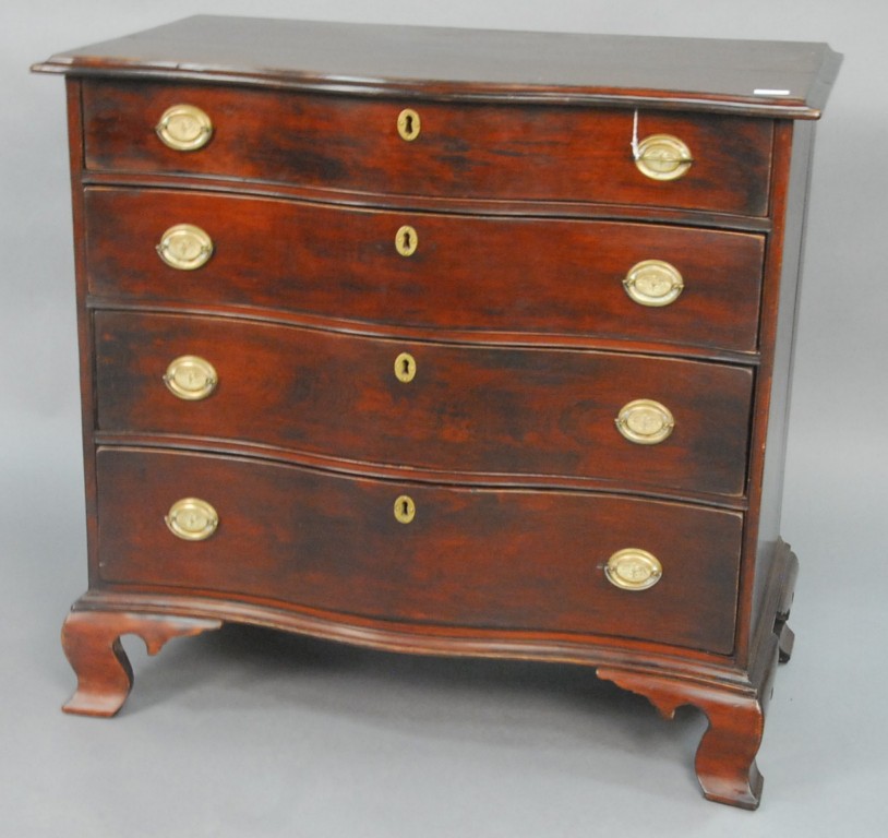 Connecticut cherry Chippendale chest having large overhanging molded edge, serpentine front with four graduated conforming shaped drawers, conforming shaped molded frieze, set on boldly carved and shaped ogee bracket feet, second half of 18th century. – ht. 35 3/4in. wd. 38in. 21 1/2in.
