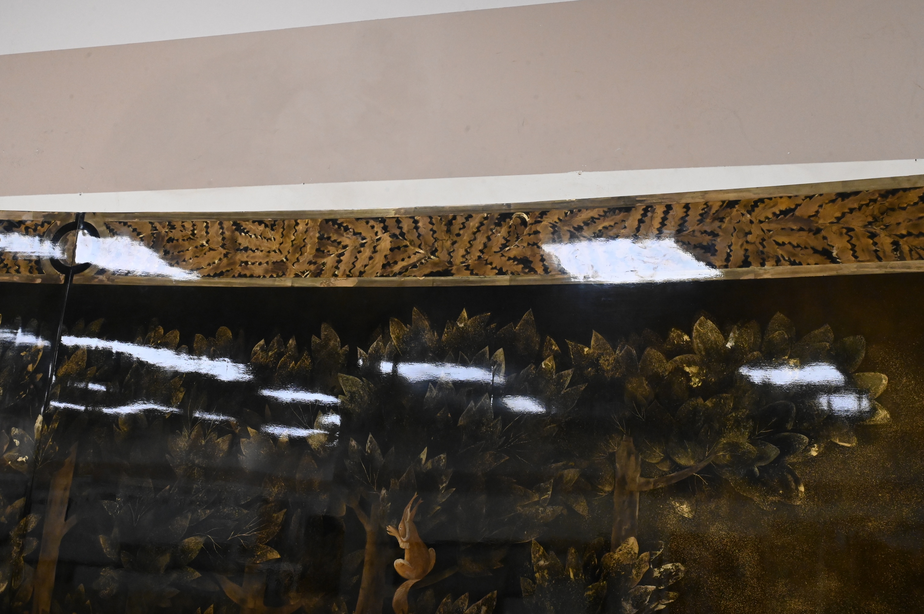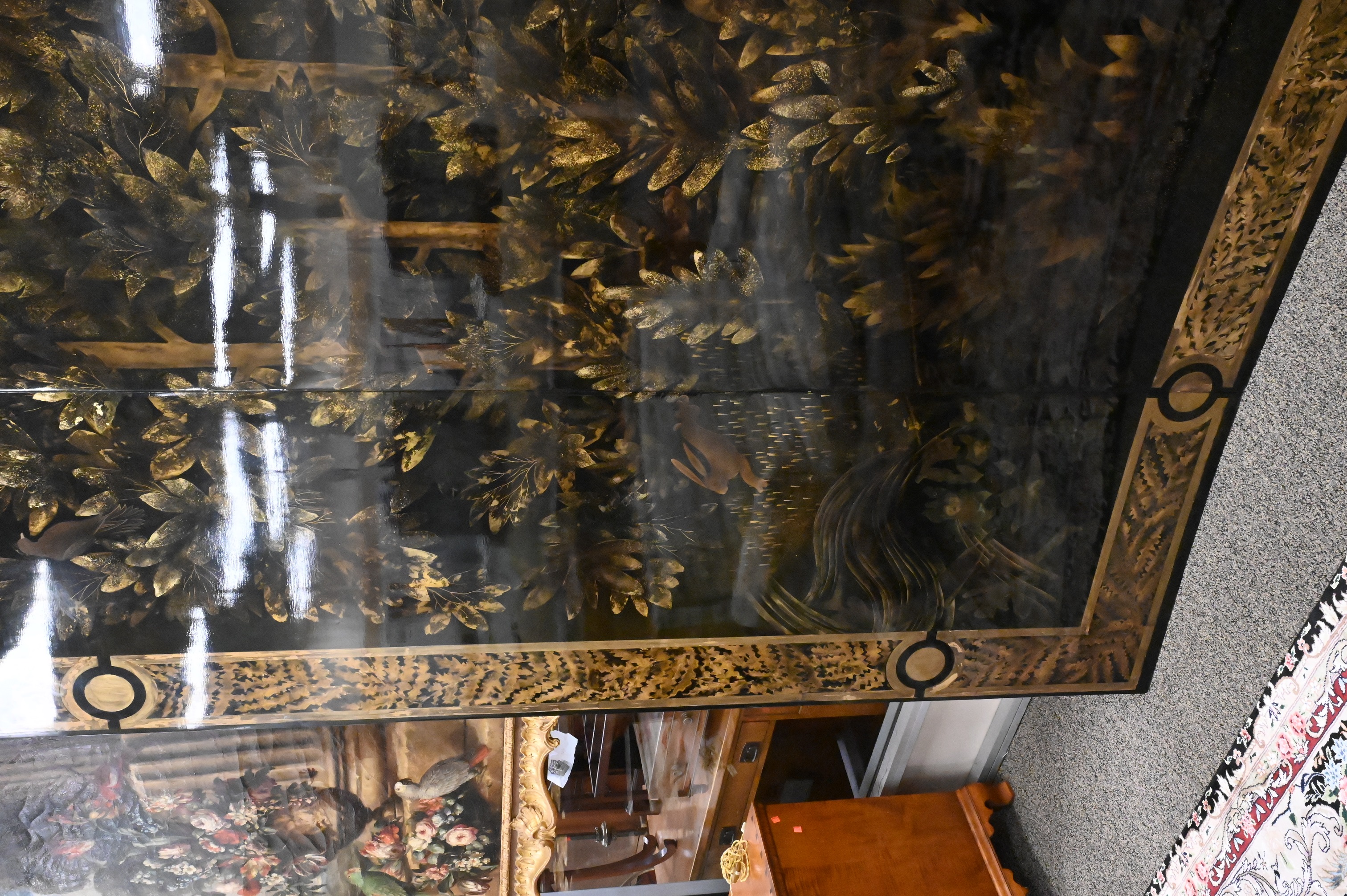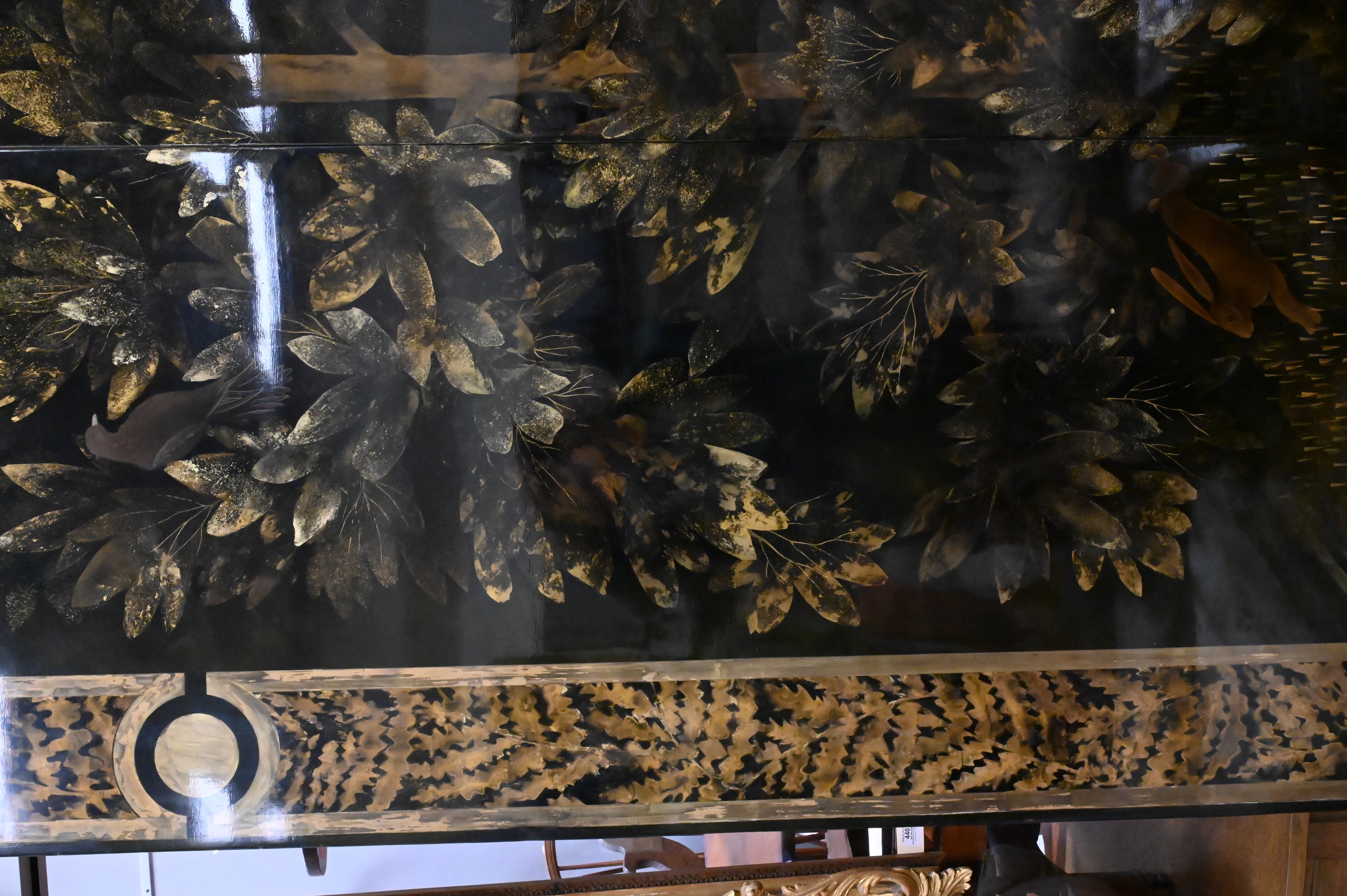 Three part curved black and gold lacquered wood depicting a forest landscape with foliage, birds and rabbits, border having stylized foliage motif