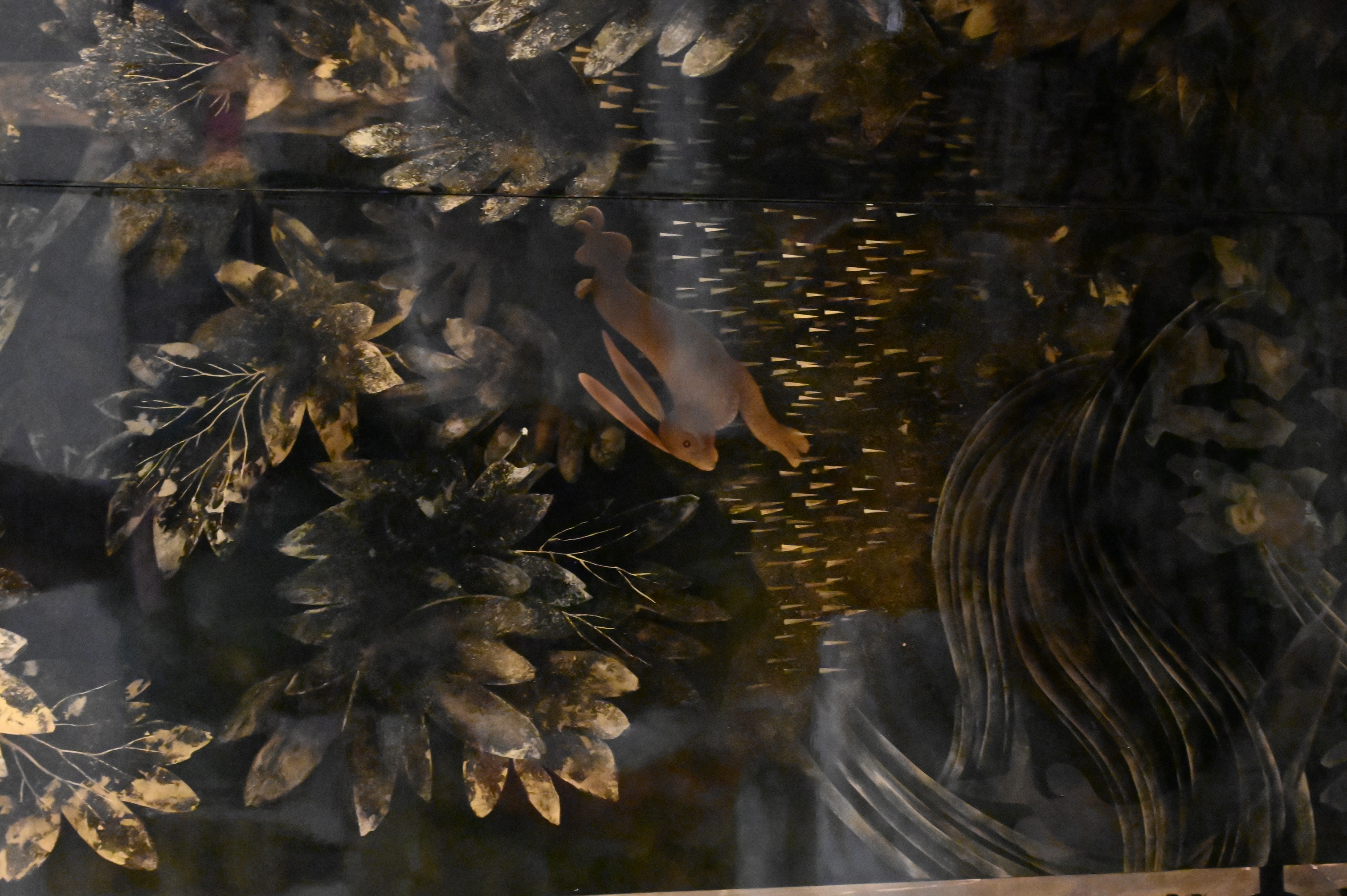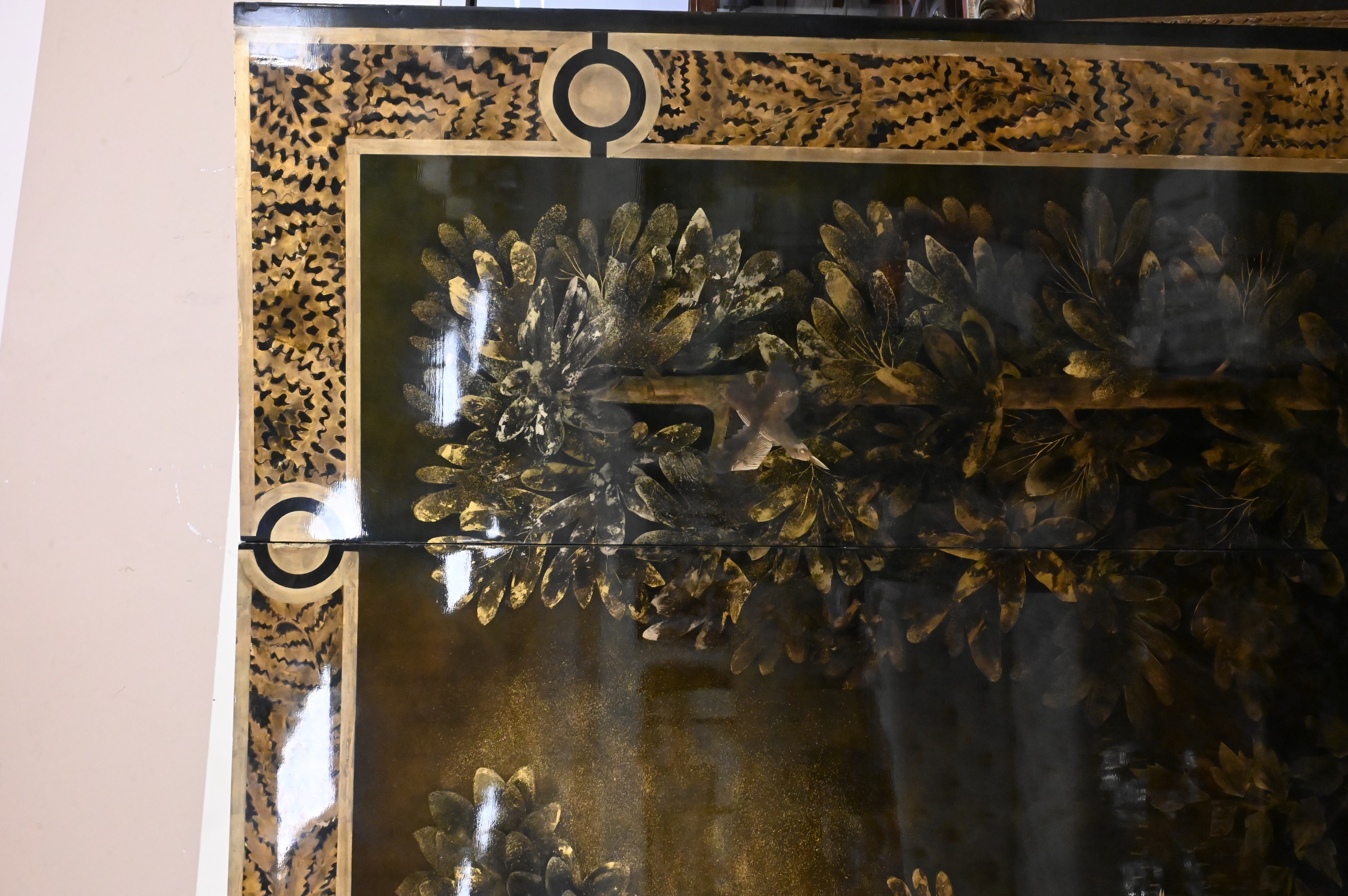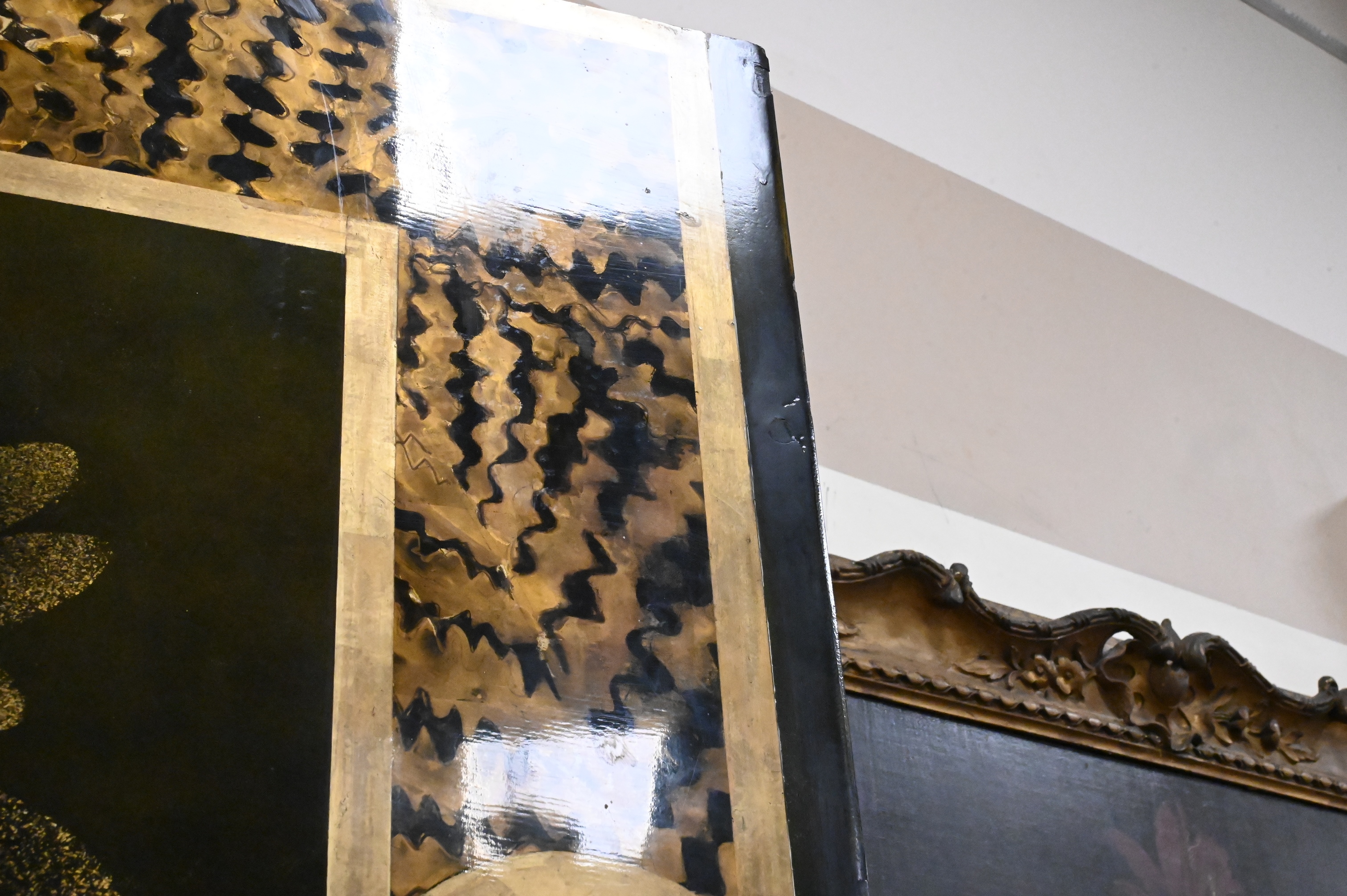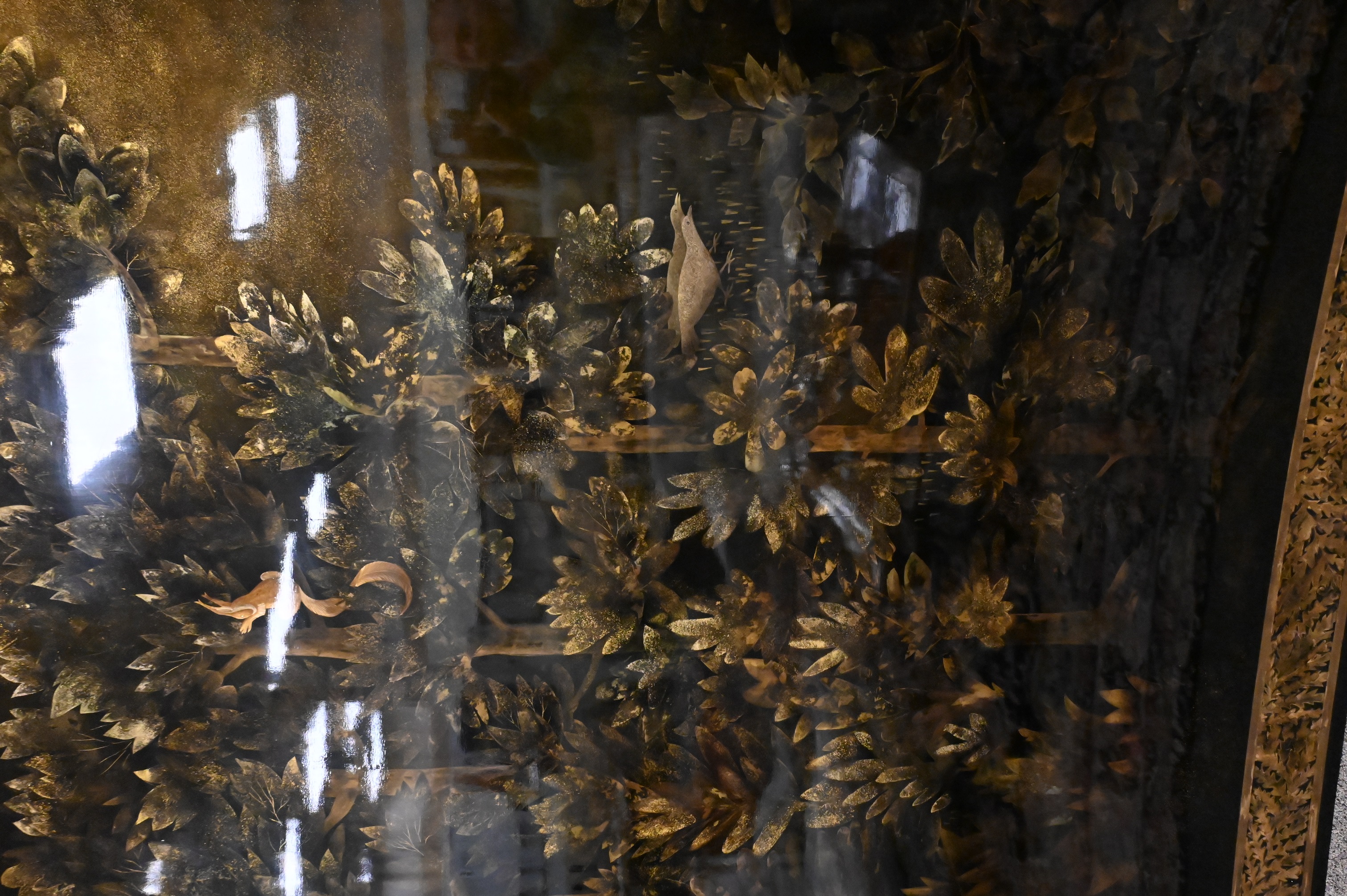 Three part curved black and gold lacquered wood depicting a forest landscape with foliage, birds and rabbits, border having stylized foliage motif