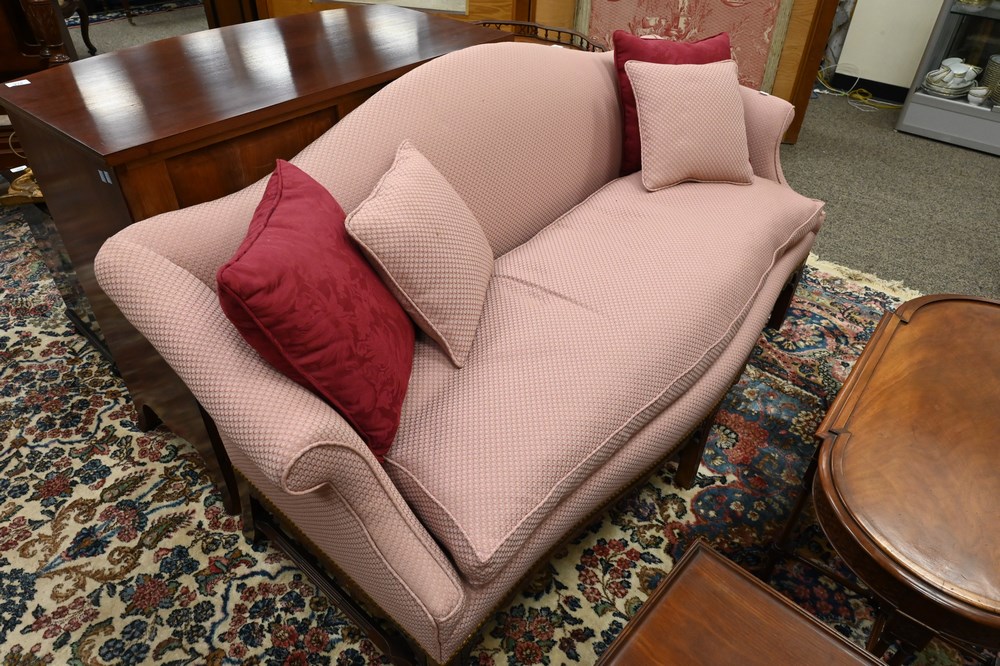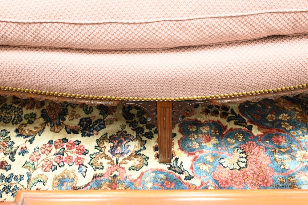 Lot 634: Two Piece Margolis Mahogany Lot, to include Chippendale style camelback sofa, having down cushion and custom upholstery with carved …