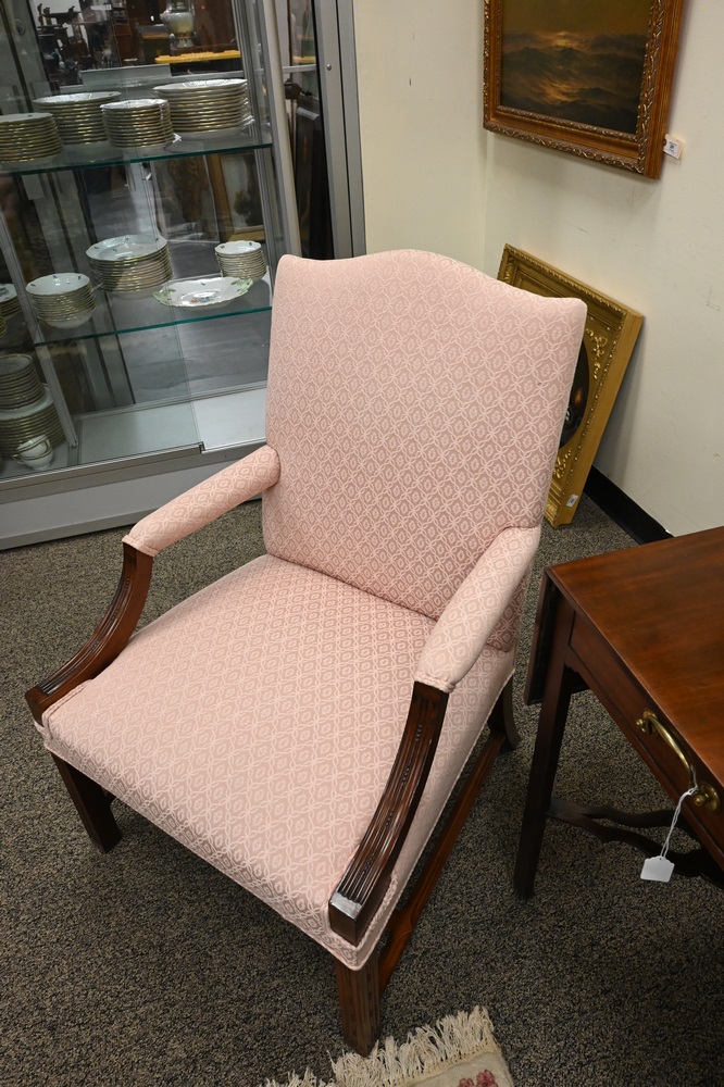 Two Piece Margolis Mahogany Lot, to include Chippendale style camelback sofa, having down cushion and custom upholstery with carved frame and square fluted legs, along with matching upholstered armchair; height 35 inches, length 72 inches.