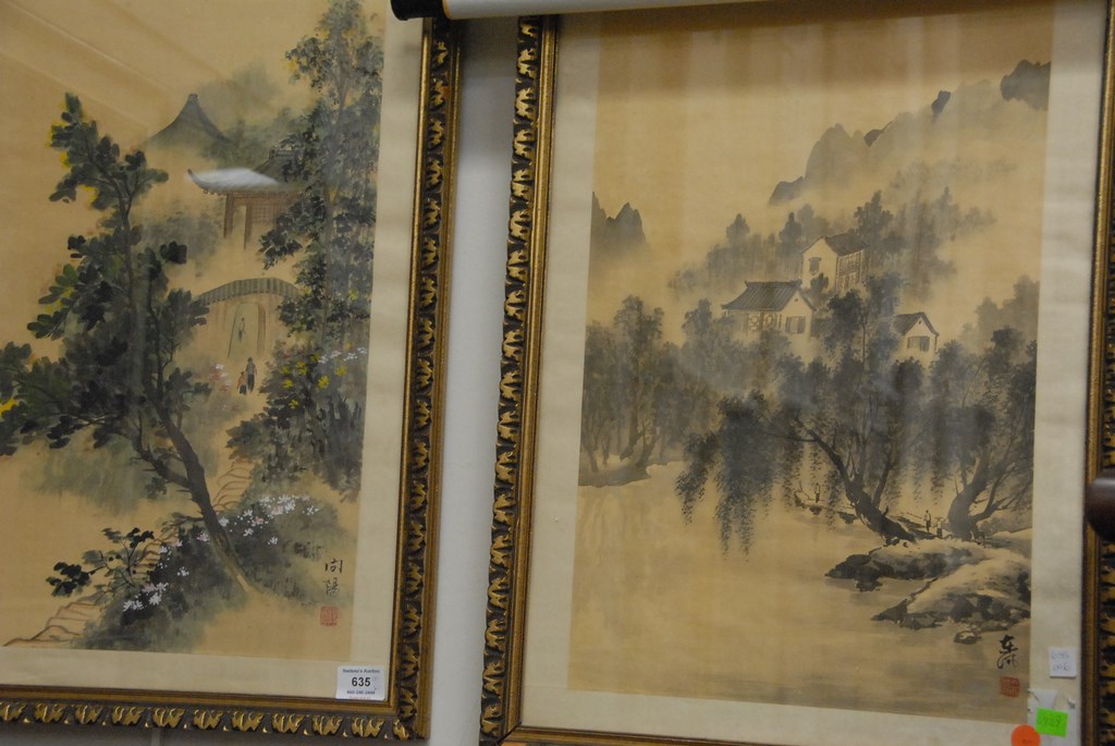 Lot 635: Group of six framed paintings: oil on canvas, two prints, and pair of watercolor on paper landscapes. 21 x 13 to 21 x 36