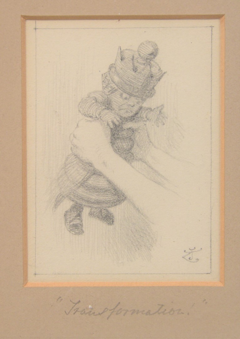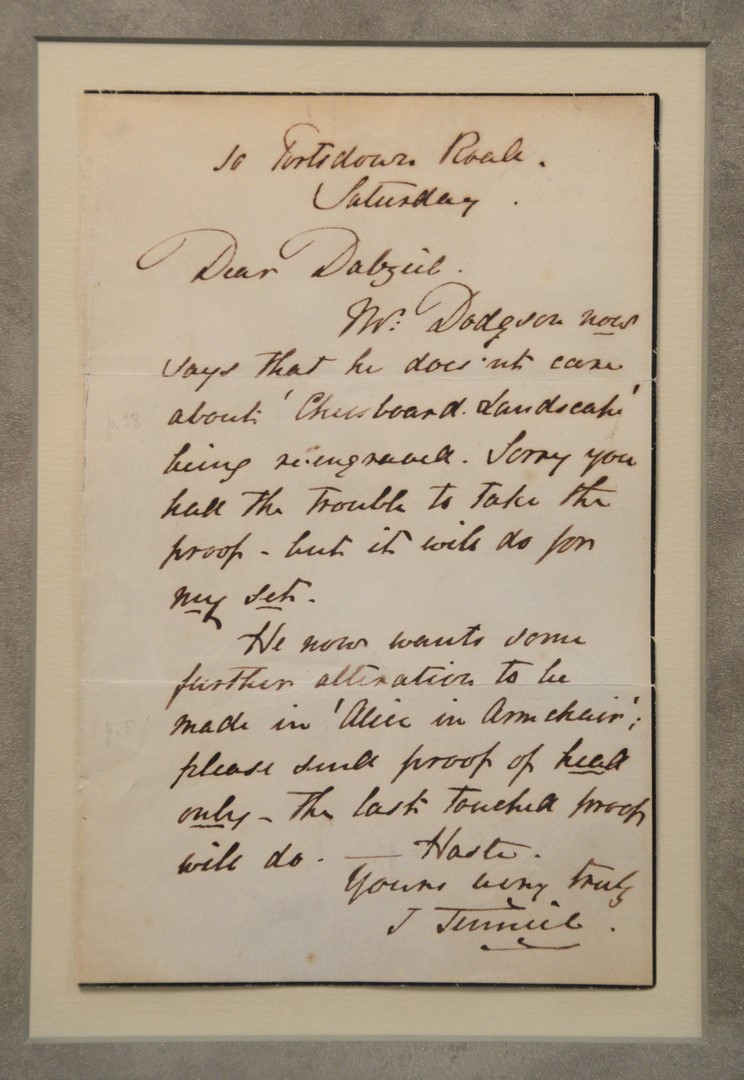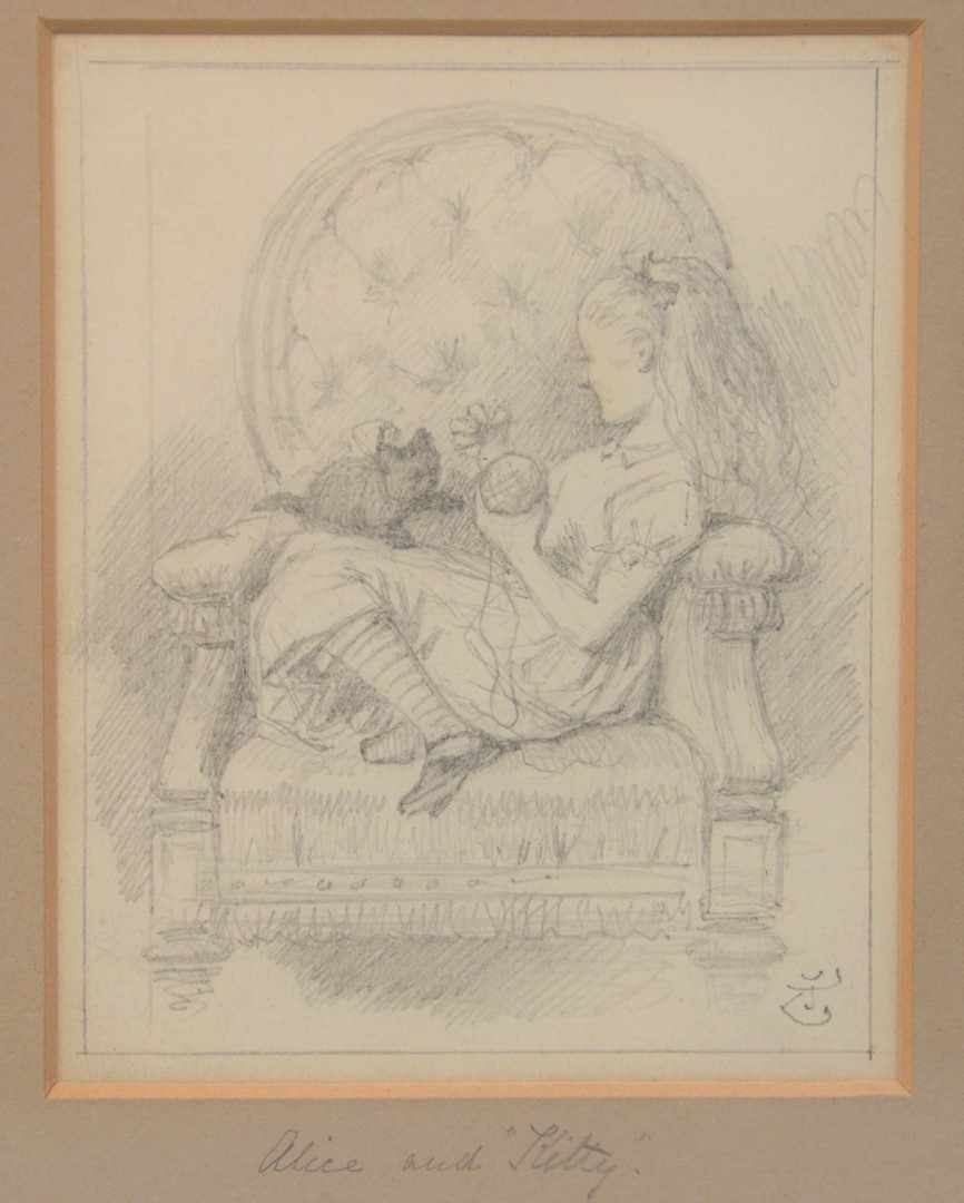 John Tenniel 1820 – 1914 Through the Looking Glass by John Tenniel, 1871 original pencil drawings set of three, Alice’s Adventures in Wonderland pencil drawings order of the script: left side Transformation sight size: 3 1/4 x 2 3/8 center: Alice and Kitty sight size: 4 1/2 x 3 1/2 right: and it really was a kitten after all sight size: 3 1/4 x 2 3/8 all signed and monogrammed along with a written letter by the artist talking about Alice in the Armchair bottom paragraph He now wasn’t some further alteration to be made in ‘Alice in the Armchair’, please send proof of head only. The last touched much will do….. – J. Tenniel Provenance: Bronson Winthrop who was a Philanthropist and socialite. From Paris moved to New York, who’s father was founding member of Knickerbocker Club, New York. To: Charlotte Cram who married Robert Fowler, Landscape Architect. To: Charlotte P. Fowler who married George Furse. To: Present owner, who is great, great niece of Bronson Winthrop. An original letter from John Tenniel is also included with Lot 635.