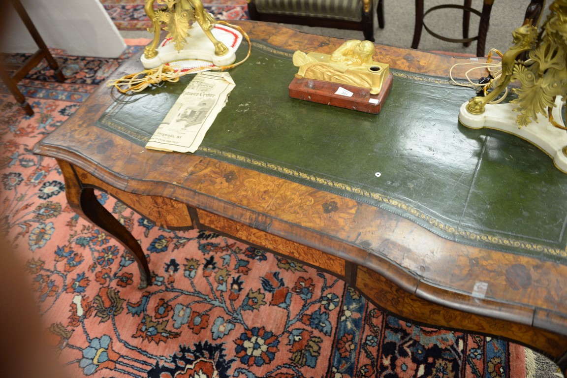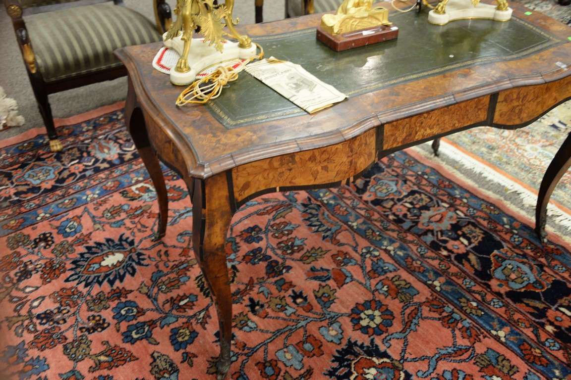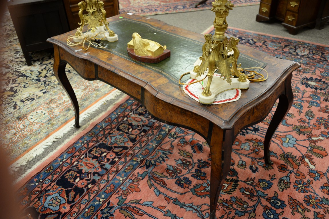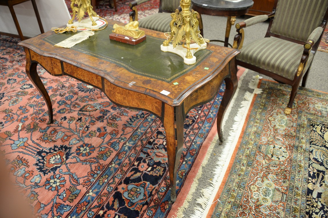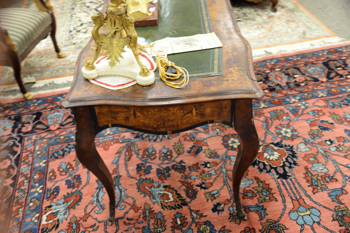 Lot 635: Louis XV style writing table having shaped top with inset leather writing surface surrounded by marquetry inlay over conforming marq…