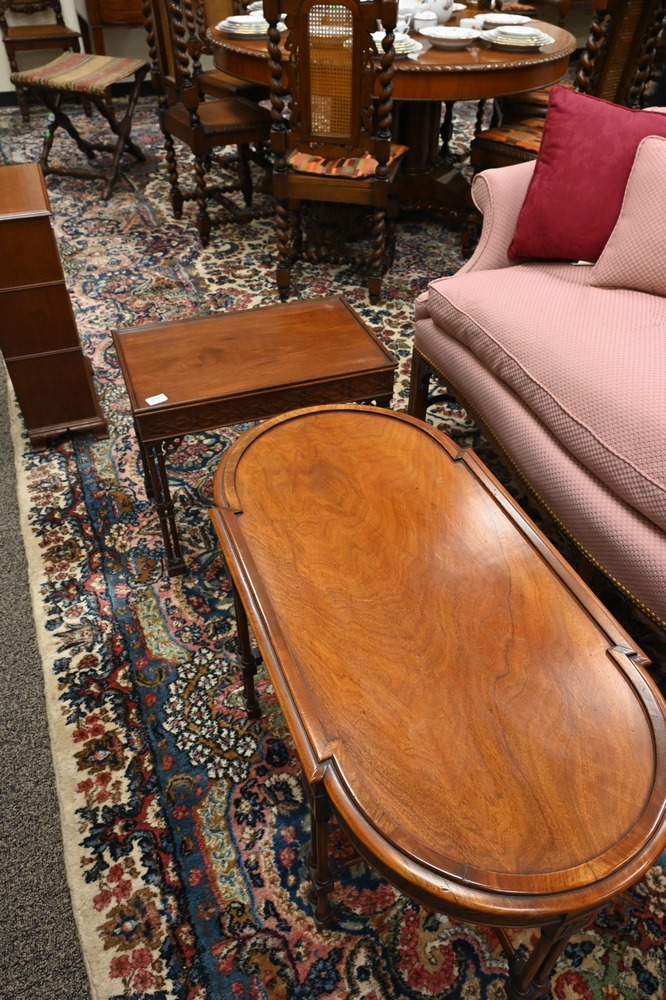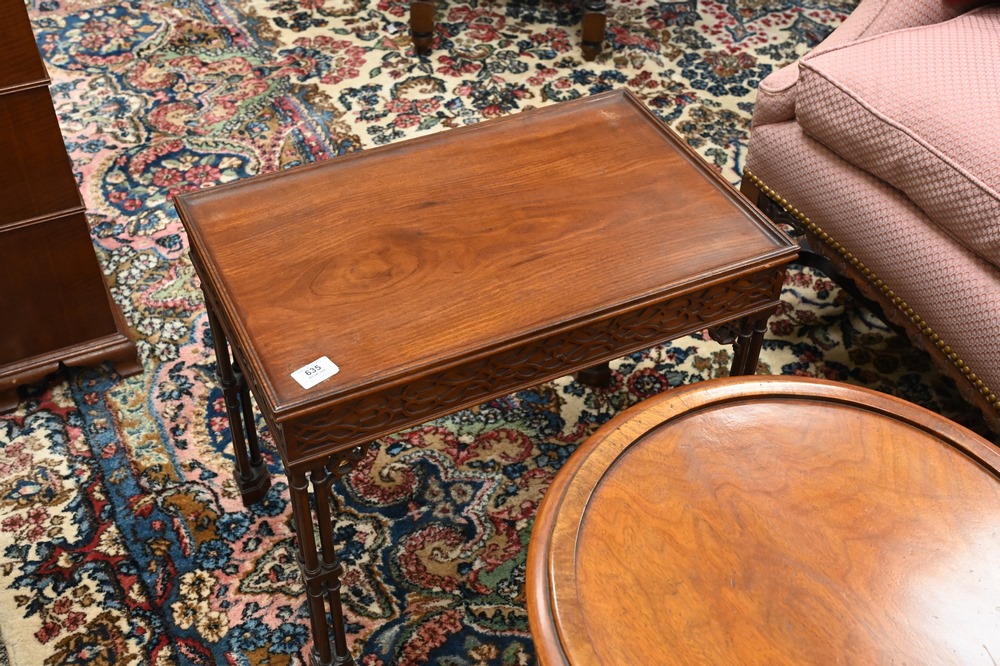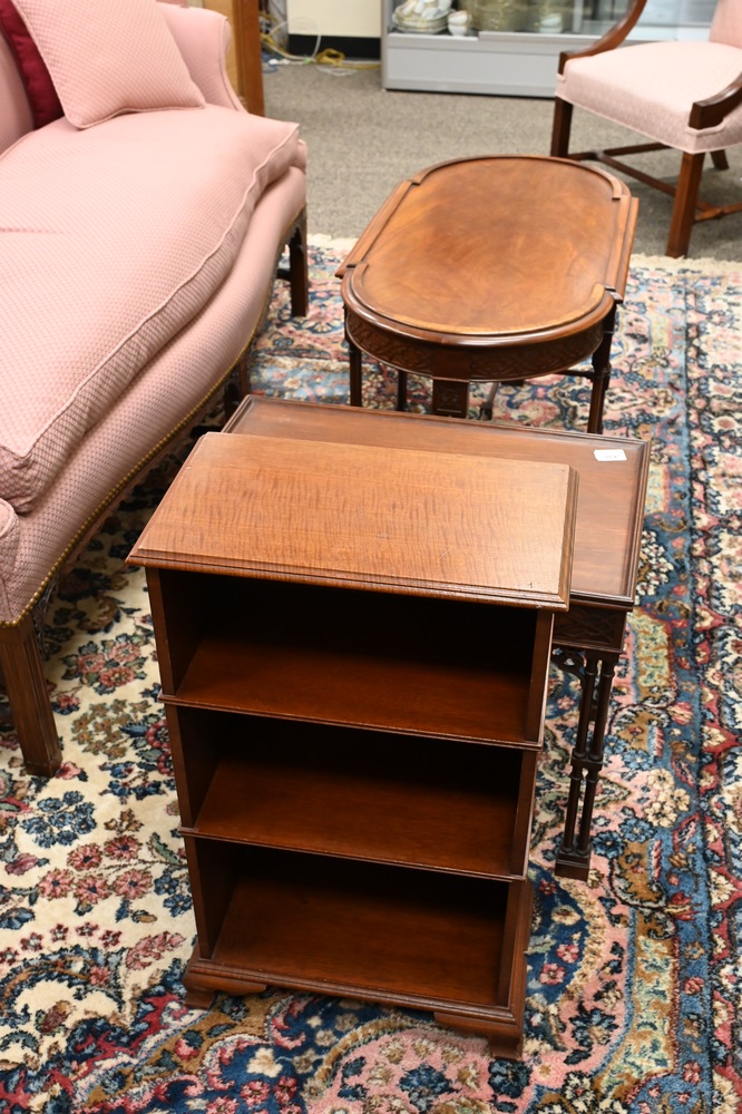 Three Piece Margolis Lot, to include a diminutive bookcase, height 26 inches, top 8 1/2″ x 15″; along with two custom Chinese Chippendale style coffee tables. Provenance: Keller Family Collection. Custom Margolis specialty pieces made for Samuel and Sophie Gross which were then passed to Florence Keller, then to Dan and Gerald Keller.