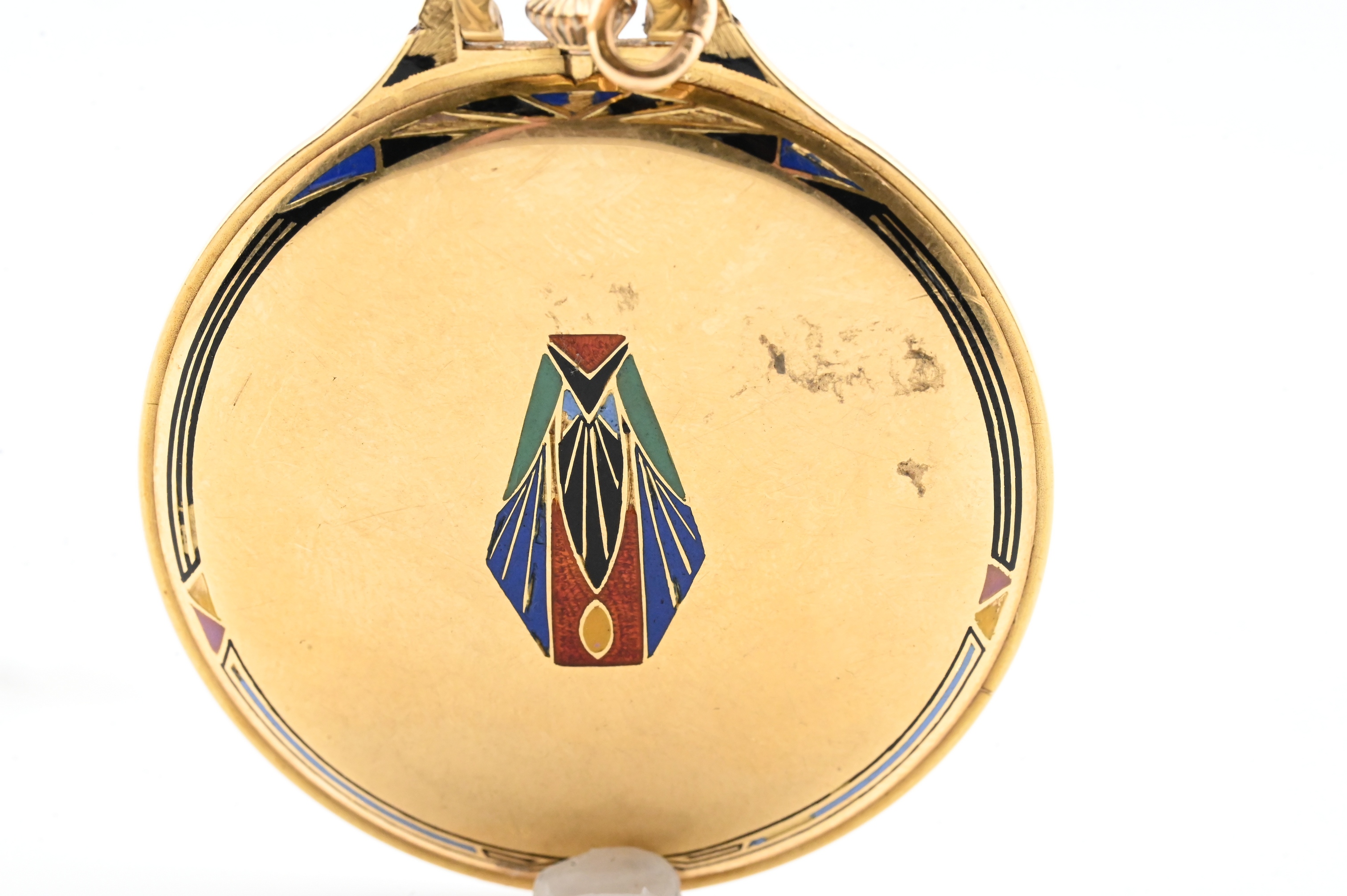 manual wind pocket watch with white enamel dial featuring gold and silver-tone Arabic numerals, outer minute track, and subsidiary seconds dial; signed Vulcain Chronomètre, the 18K yellow gold case with stylized blue, red, and black geometric enamel accents in Art Deco style, interior stamped Vulcain, 18K, and numbered 1809008, movement signed Vulcain Chronomètre 15 Jewels Swiss
