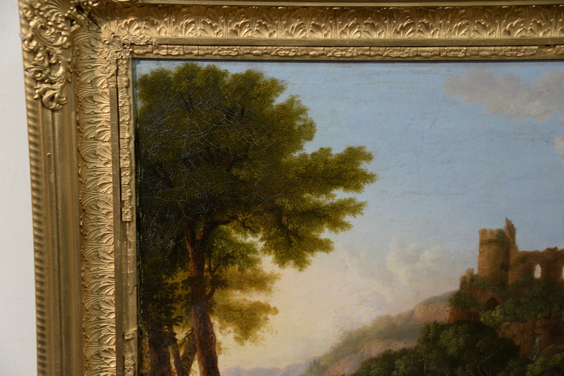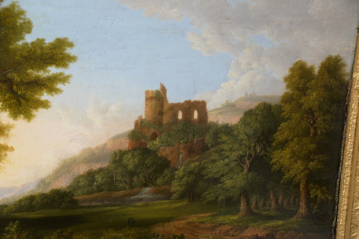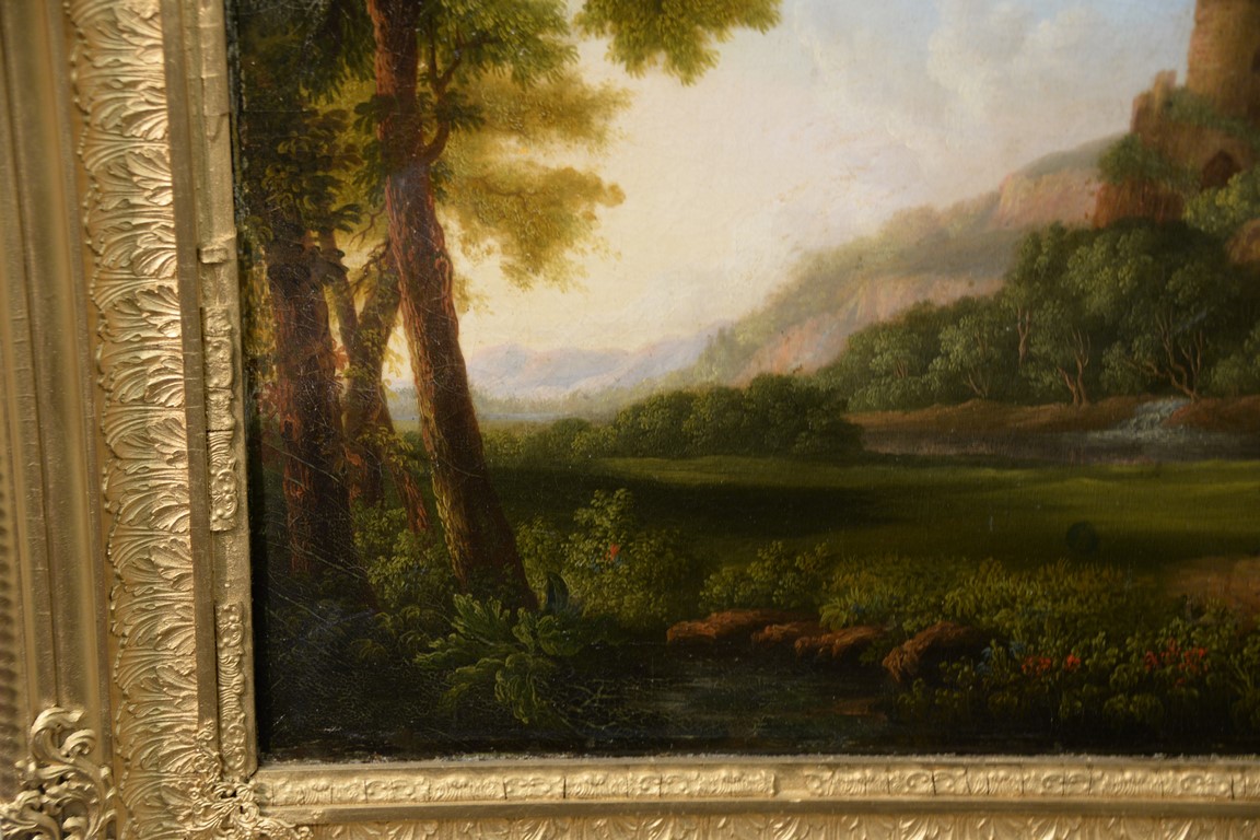 Lot 636: Large oil on canvas European Mountainous Landscape with castle on hillside unsigned relined 24 x 34
