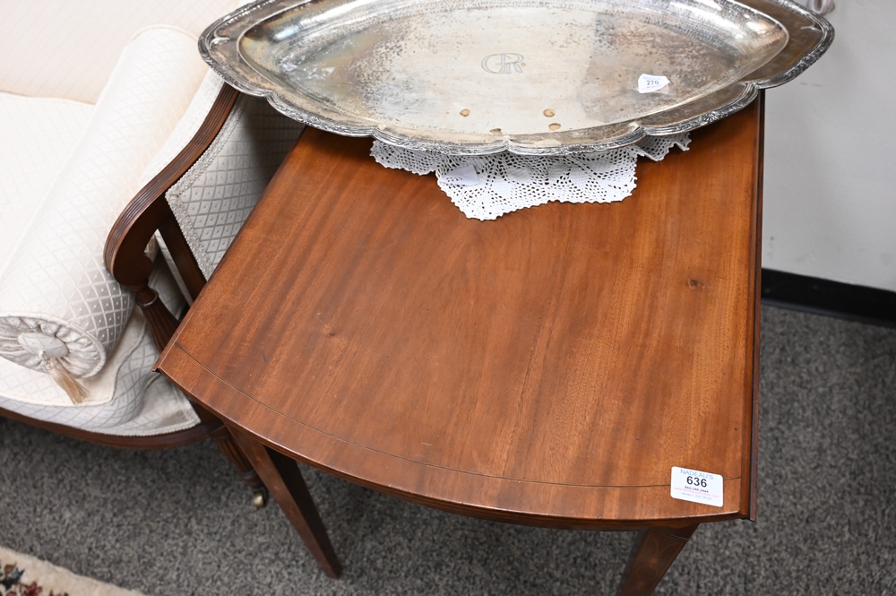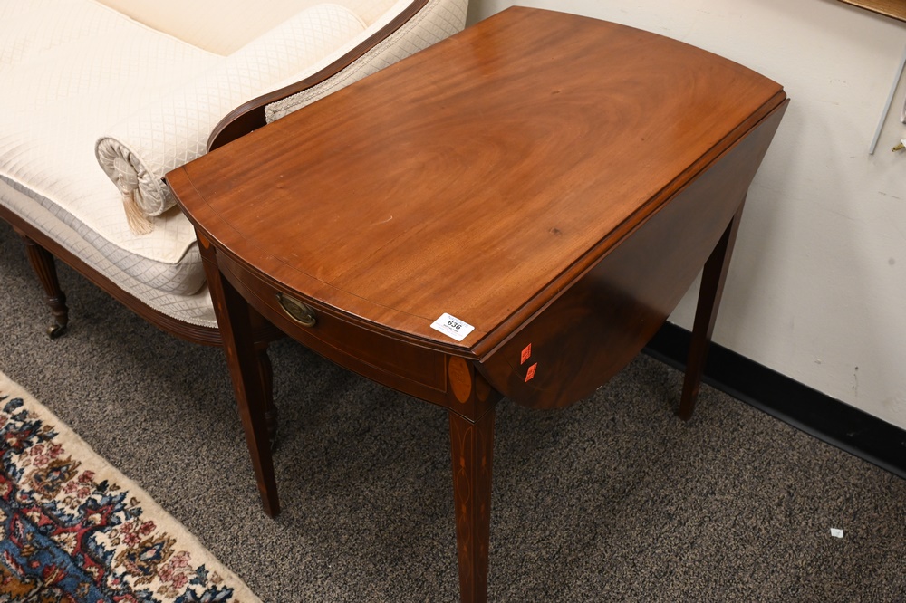 Lot 636: Margolis Federal Style Pembroke Drop Leaf Table, having bowed ends and inlaid legs, height 28 inches, table top 20 1/2″ x 33″. Prove…