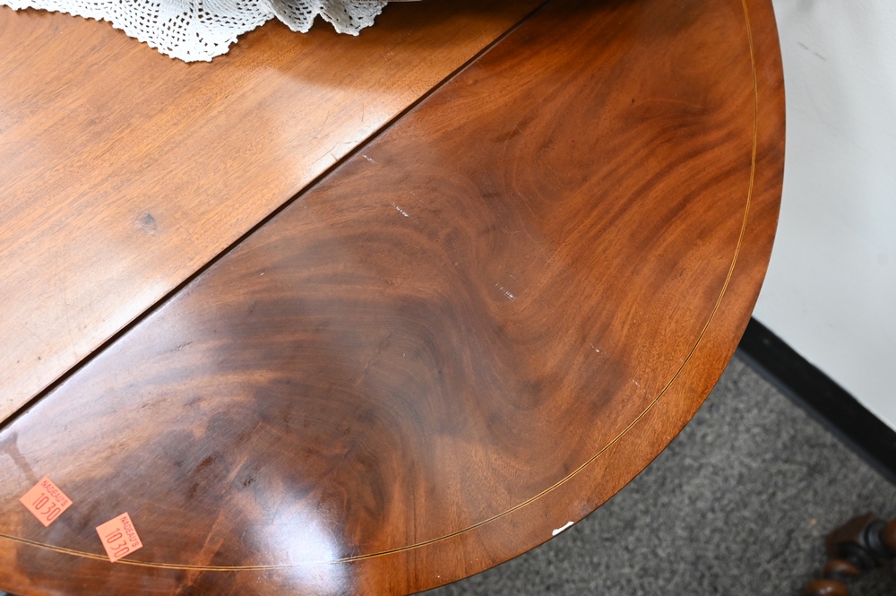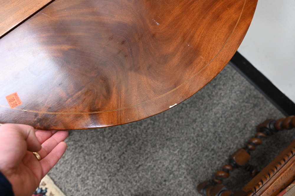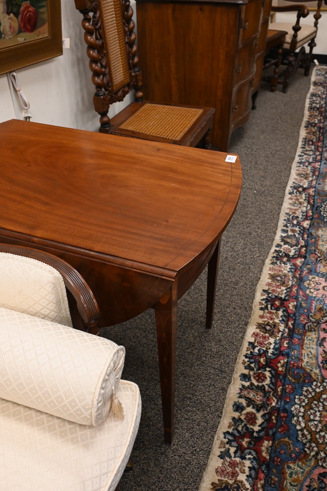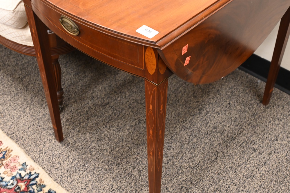 Margolis Federal Style Pembroke Drop Leaf Table, having bowed ends and inlaid legs, height 28 inches, table top 20 1/2″ x 33″. Provenance: Keller Family Collection. Custom Margolis specialty pieces made for Samuel and Sophie Gross which were then passed to Florence Keller, then to Dan and Gerald Keller.