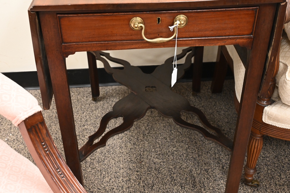 Lot 637: George II Mahogany Pembroke Drop Leaf Table, having flat pierce carved stretcher and one drawer all set on squared legs, height 29 i…