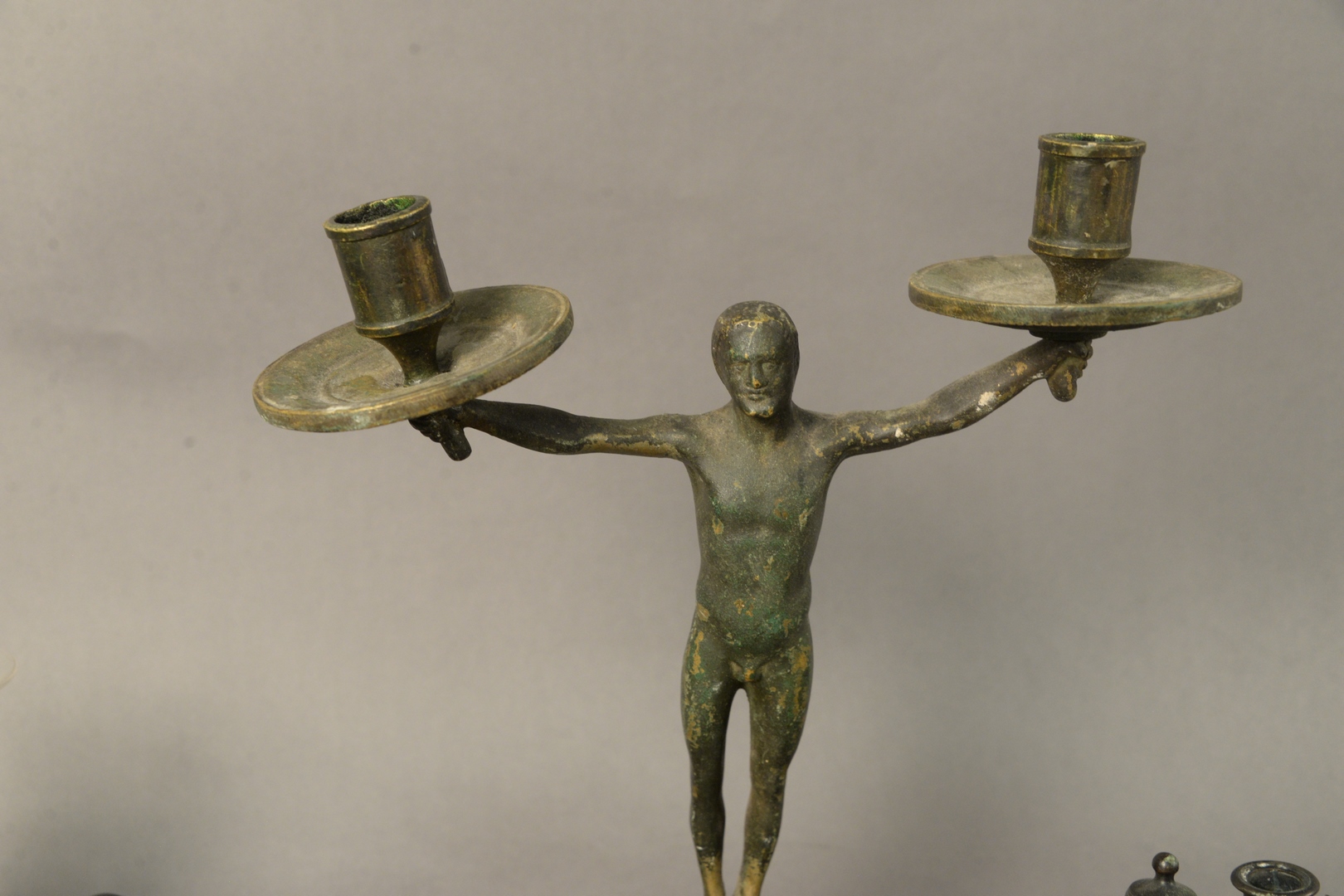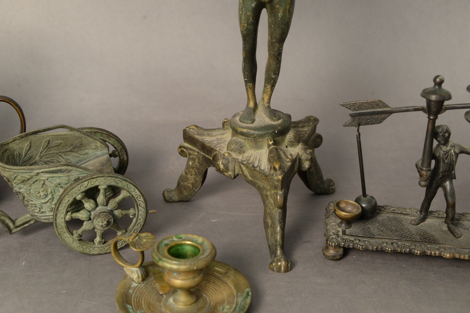 Lot 637: Group of Five Bronze Grand Tour Items to include a bronze nude male figure candelabra a miniature bronze gladiator chariot a brass…