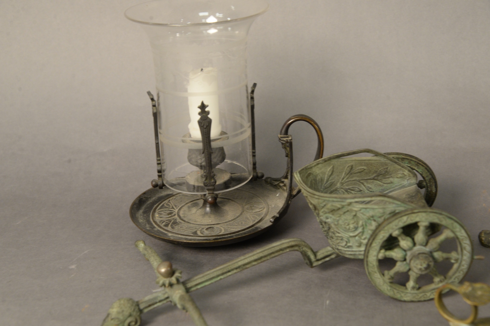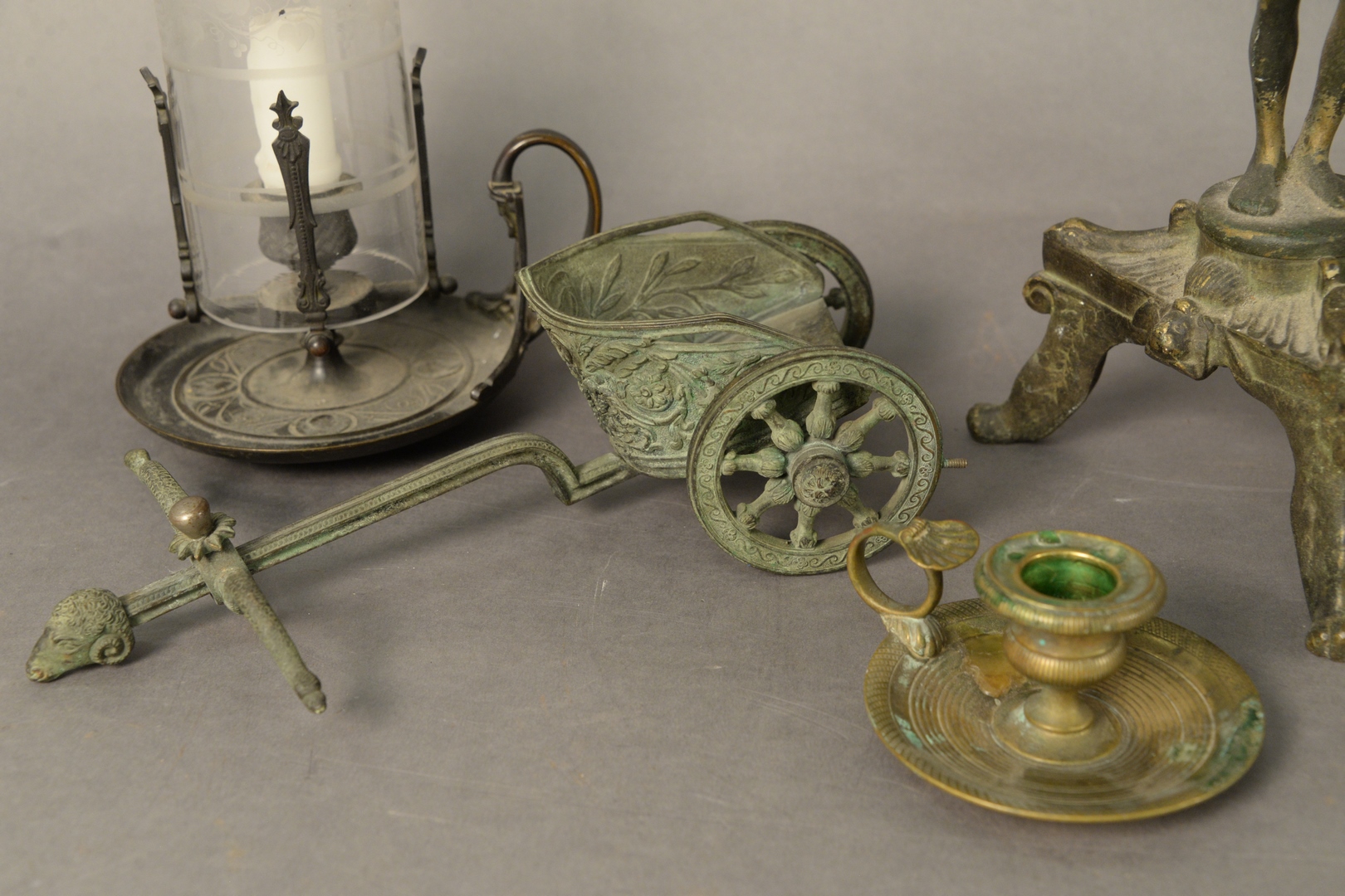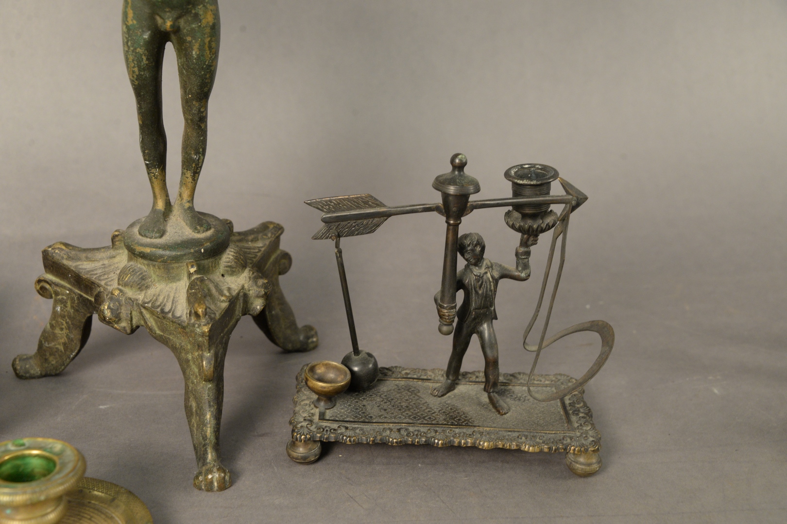 Group of Five Bronze Grand Tour Items to include a bronze nude male figure candelabra a miniature bronze gladiator chariot a brass candlestick an etched glass and bronze candle holder and a small pendulum form bronze candle holder, largest height 14 1/2 inches, width 11 inches.