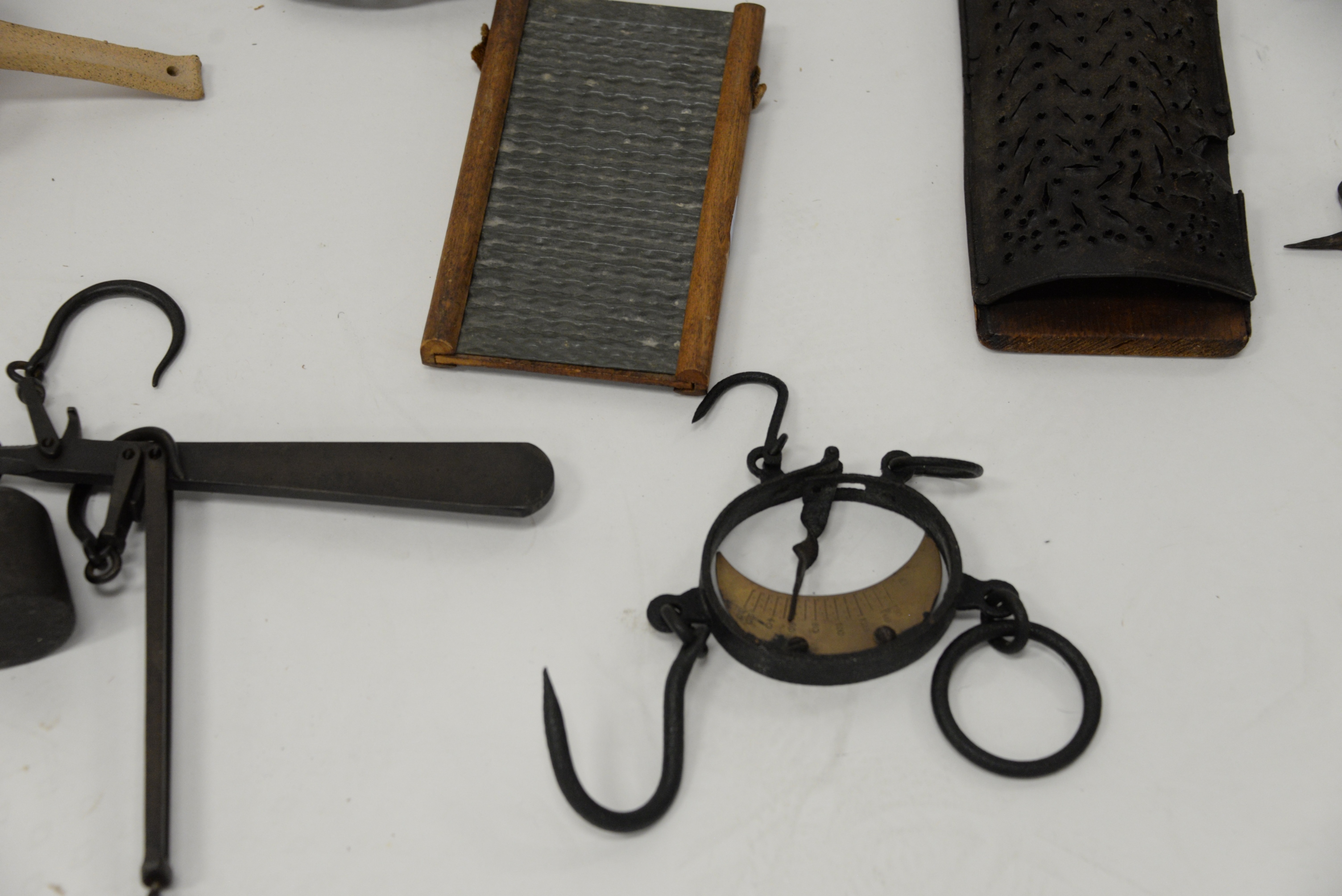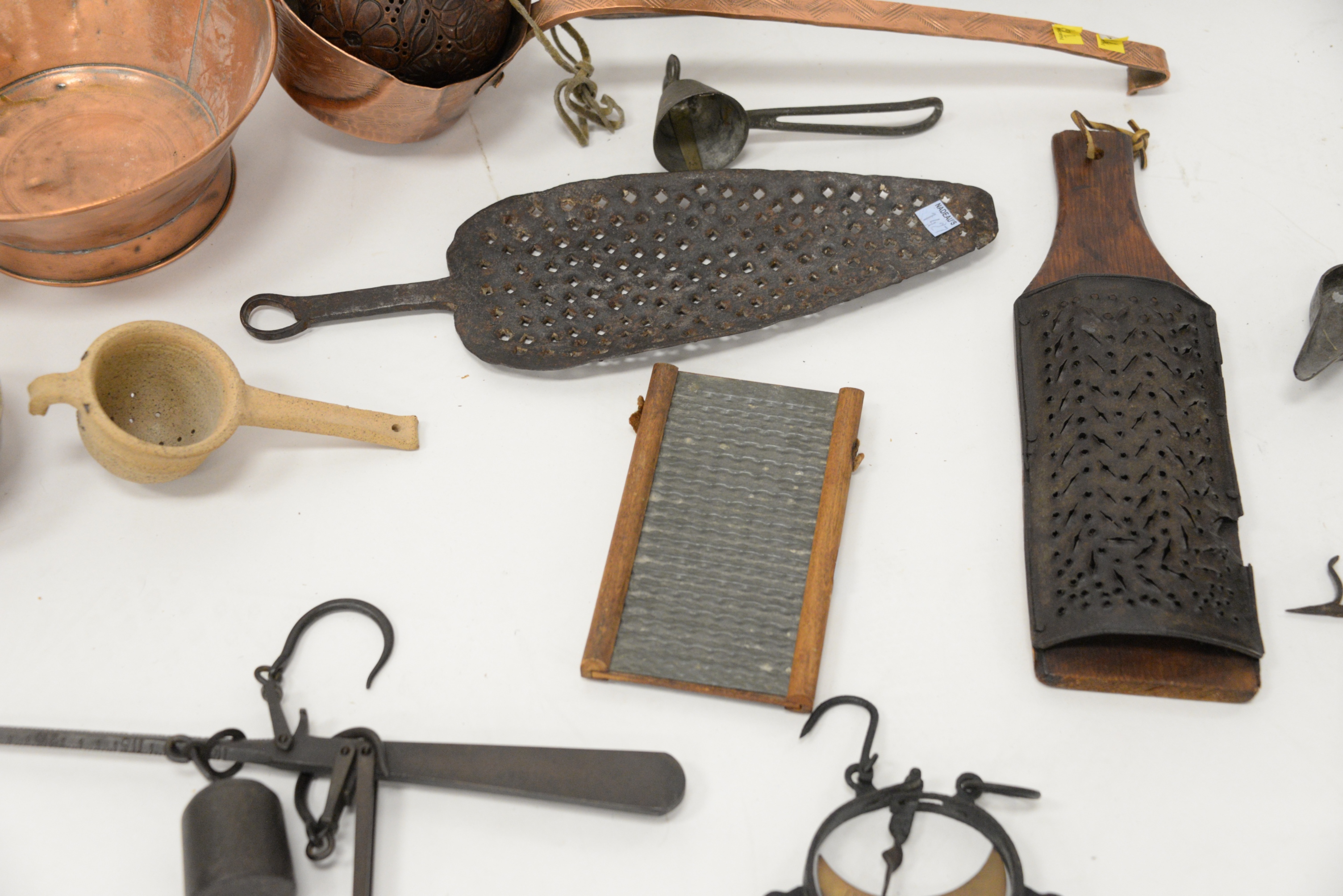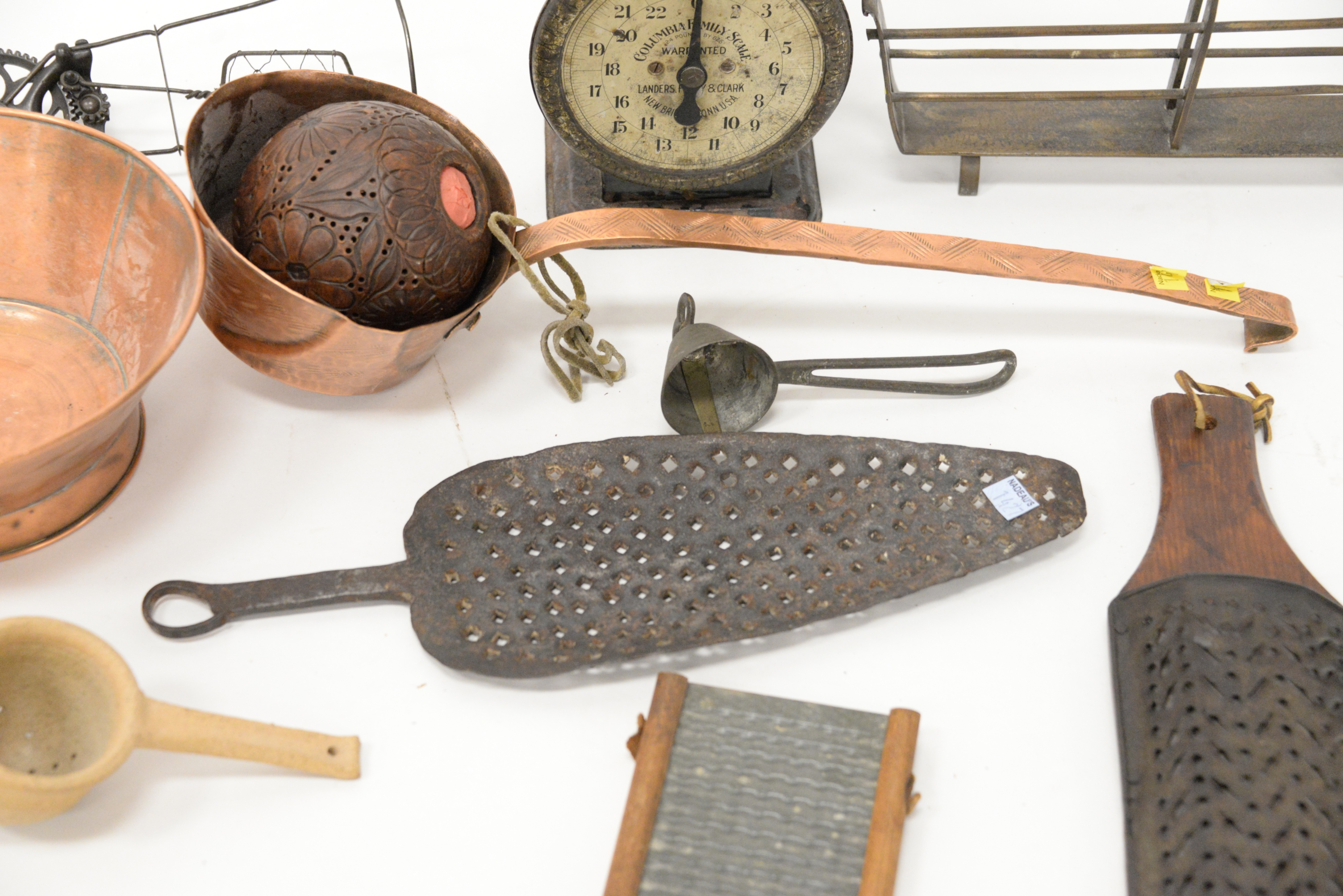Large Group of Assorted Primitive Items, to include 1884 egg beater, cheese grater, iron scale, betty lamp, copper, etc., largest 23 inches.