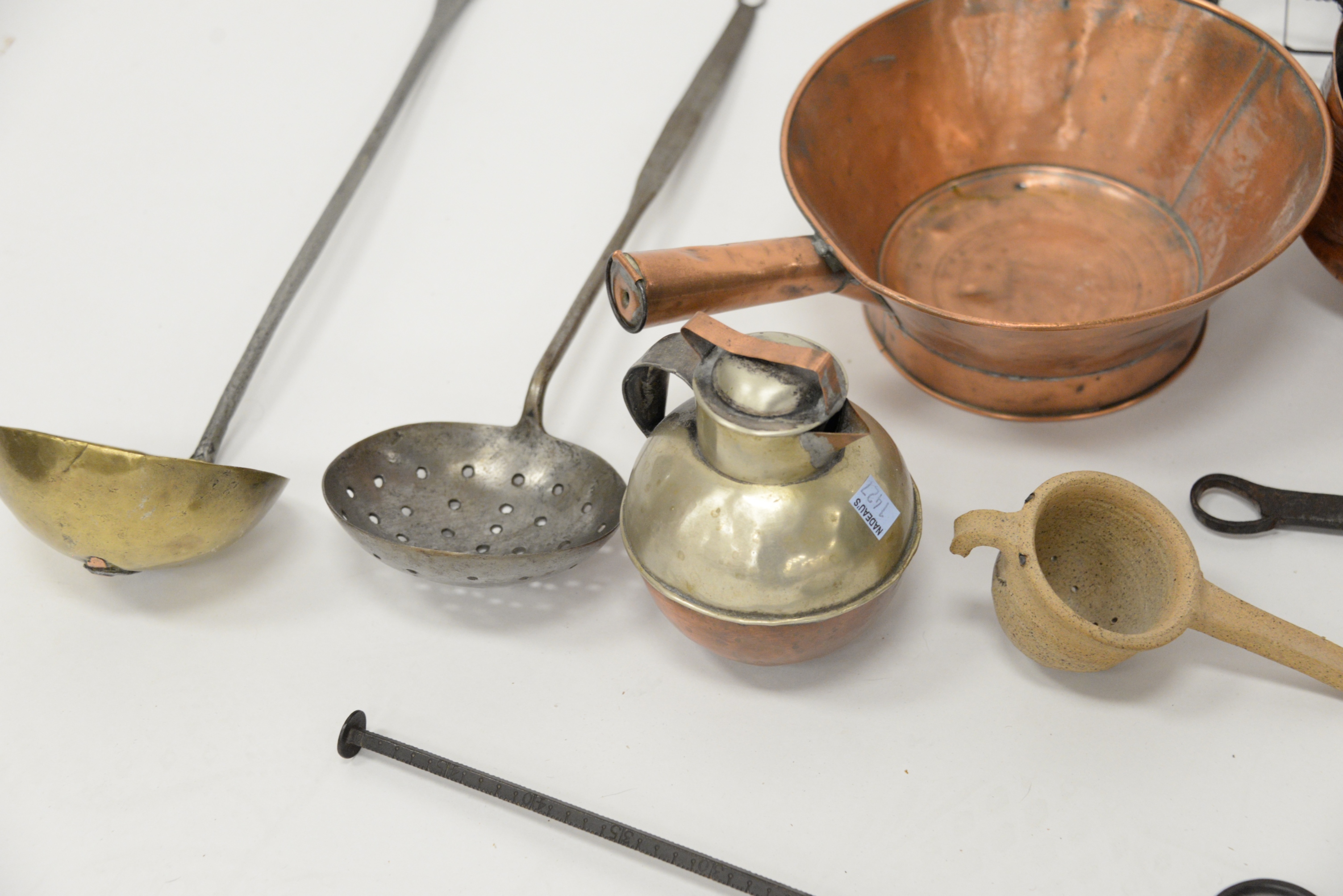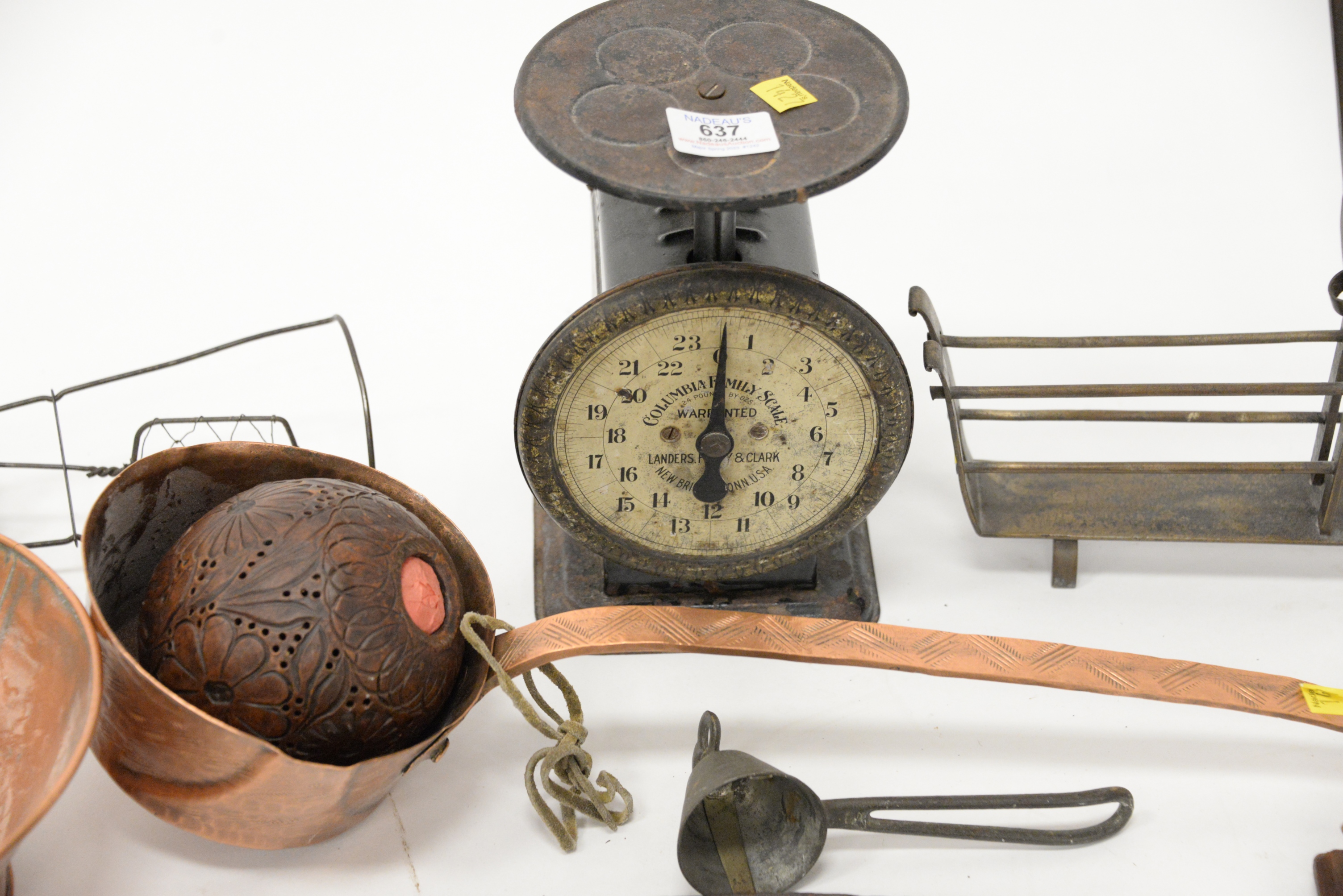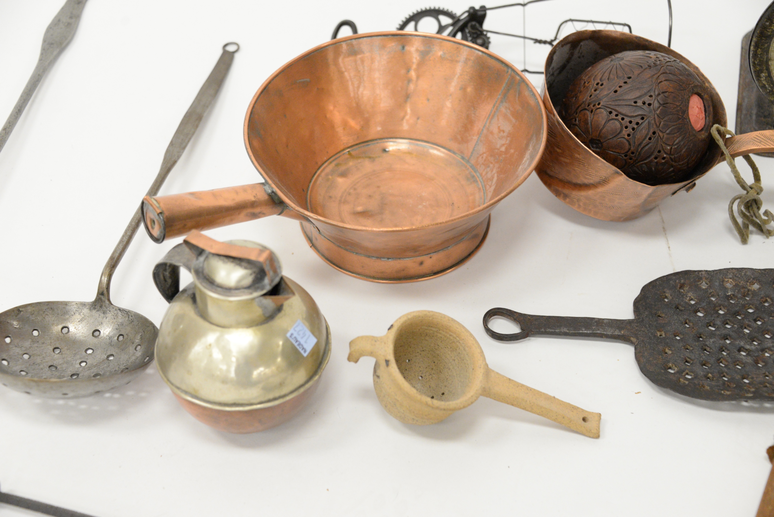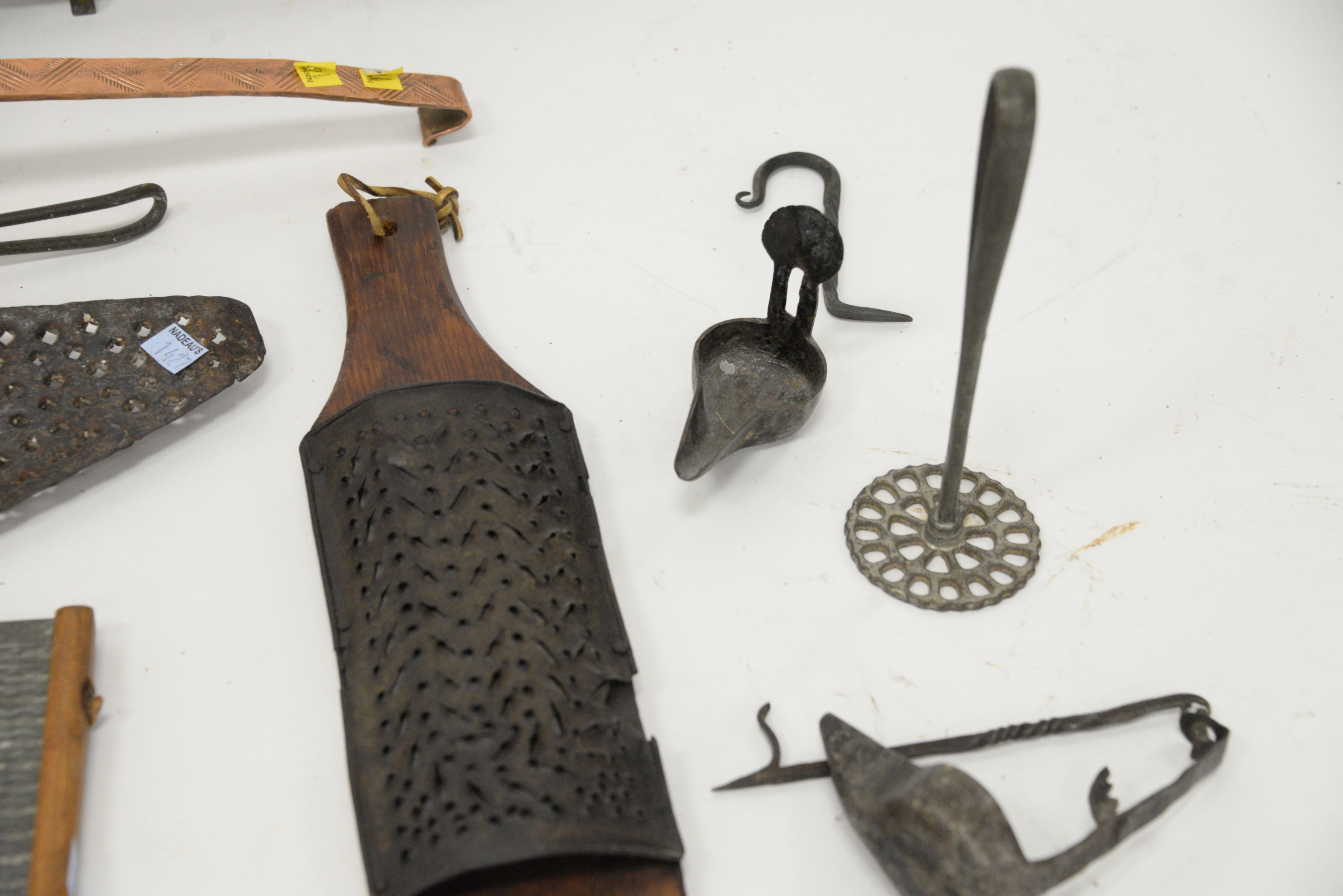 Large Group of Assorted Primitive Items, to include 1884 egg beater, cheese grater, iron scale, betty lamp, copper, etc., largest 23 inches.