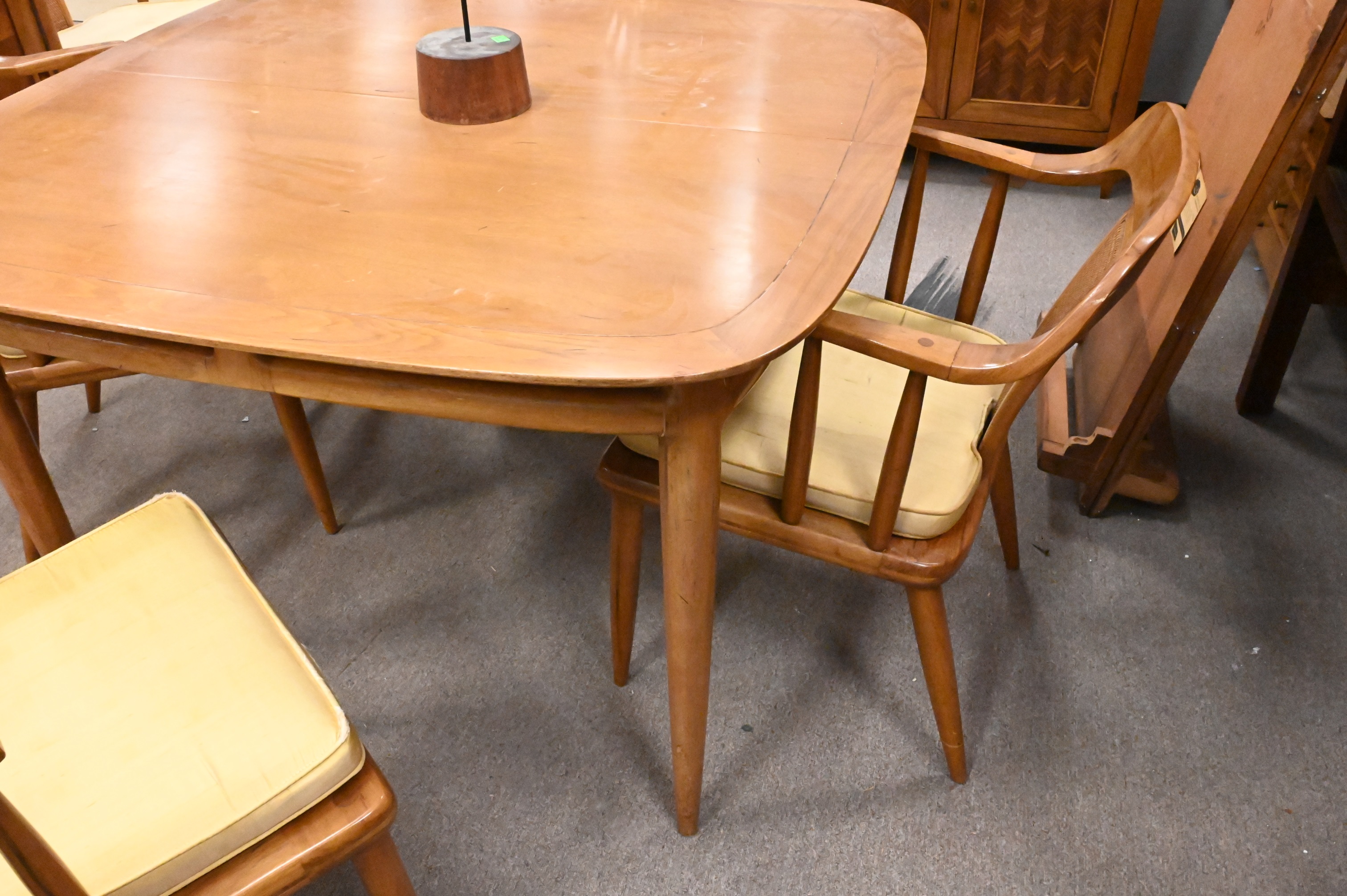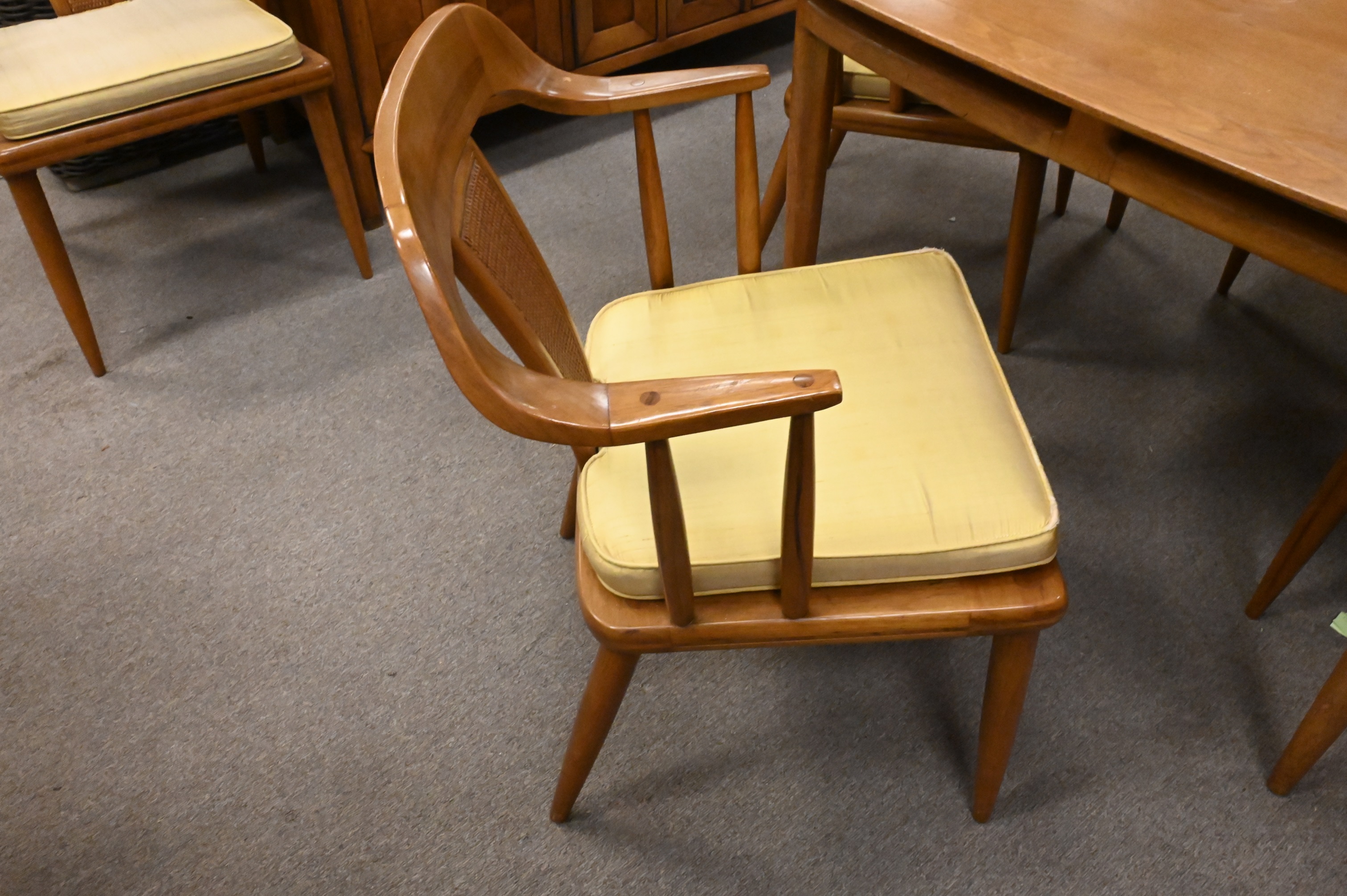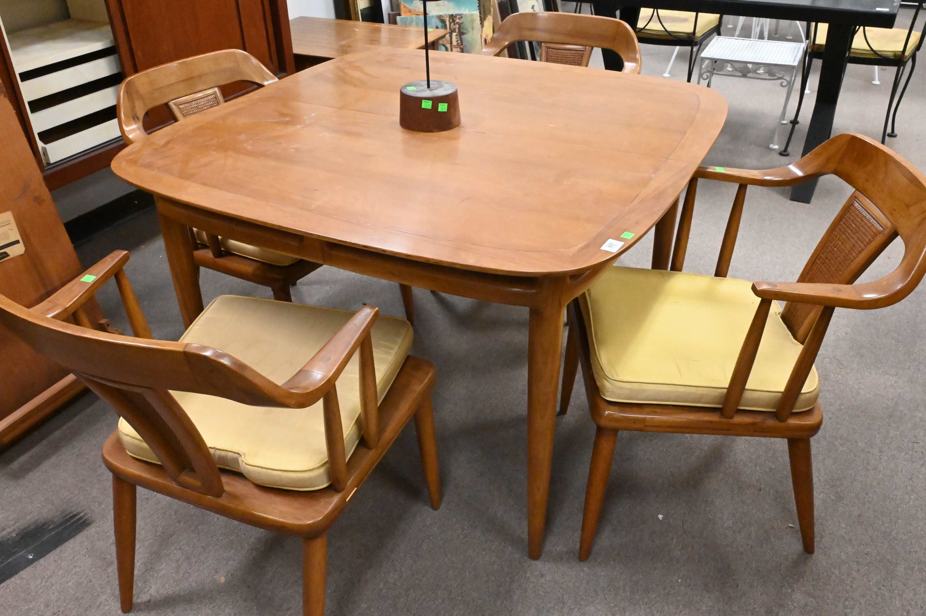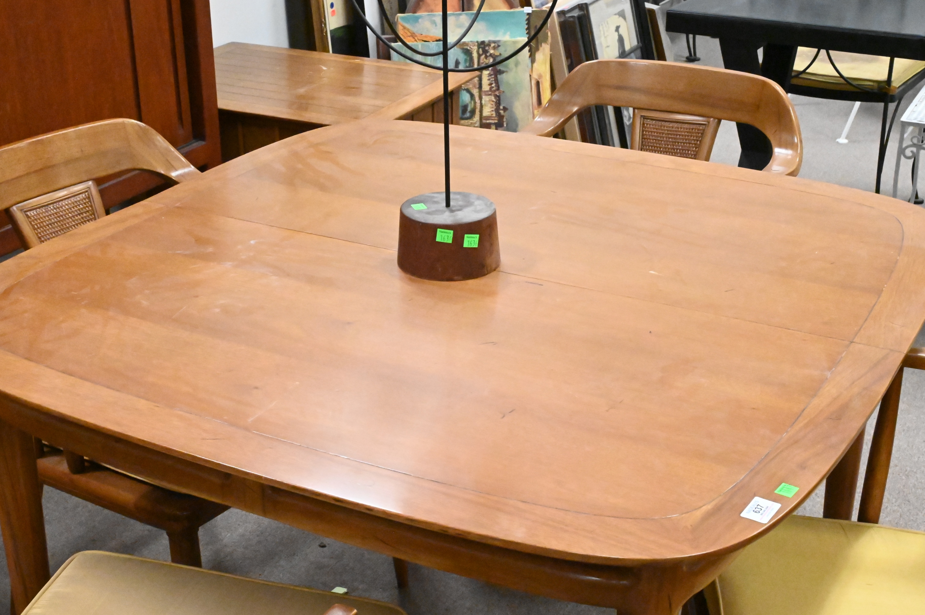 Seven Piece Tomlin “Sophisticate” Dining Set, to include six chairs, table, two leaves (18 inches) and sideboard, height 29 inches, Top 44 inches x 44 inches, Top Open 44 inches x 80 inches