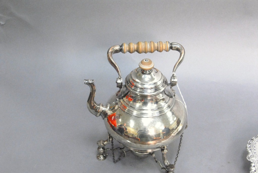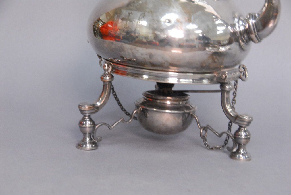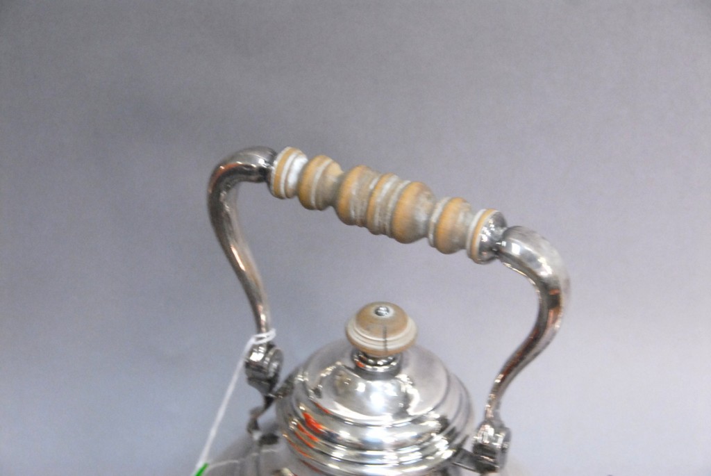 Lot 638: Crichton silver hot water pot on tilting stand with family crest on one side, wood swing handle, and wood finial with spout in form …