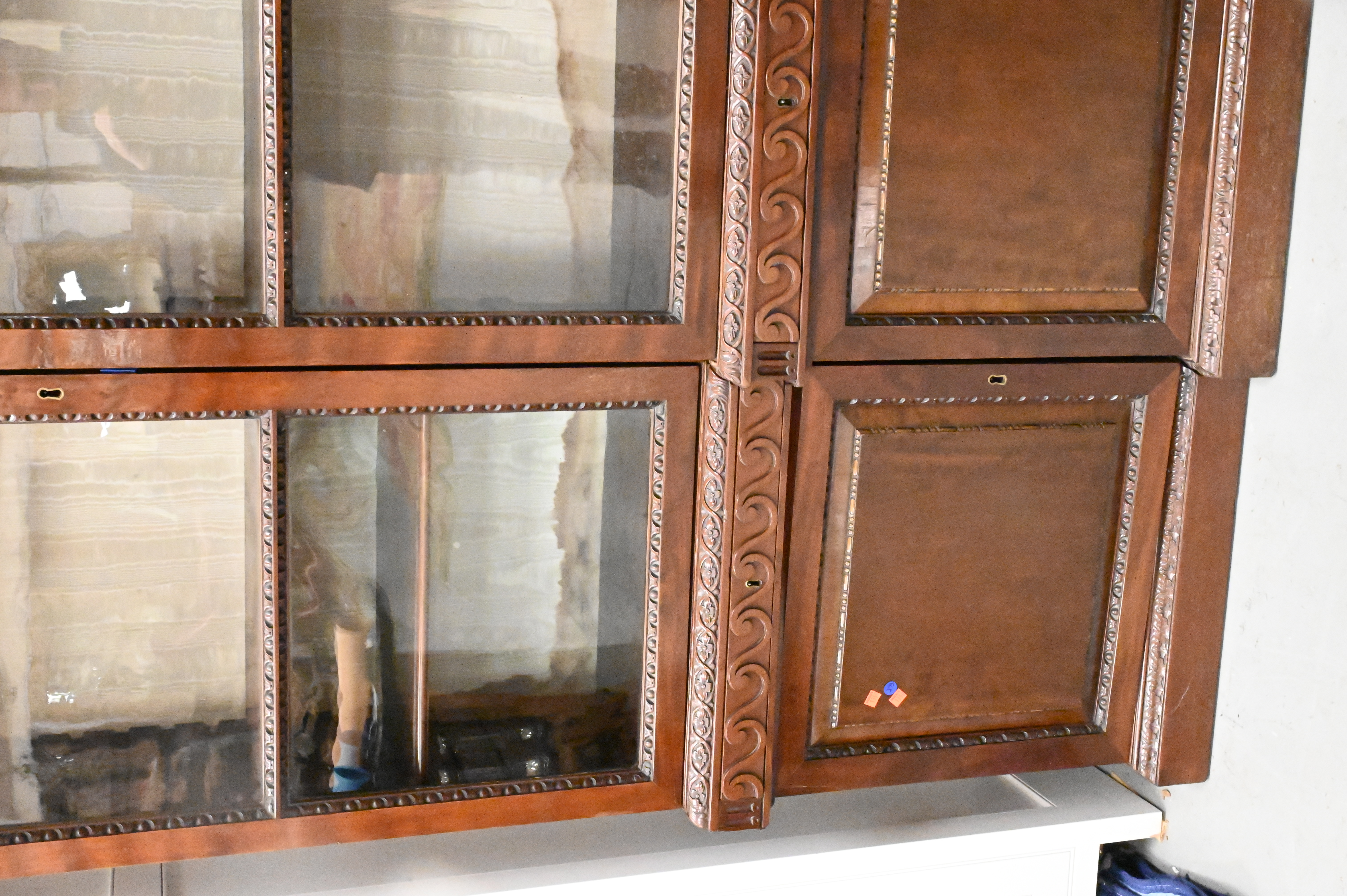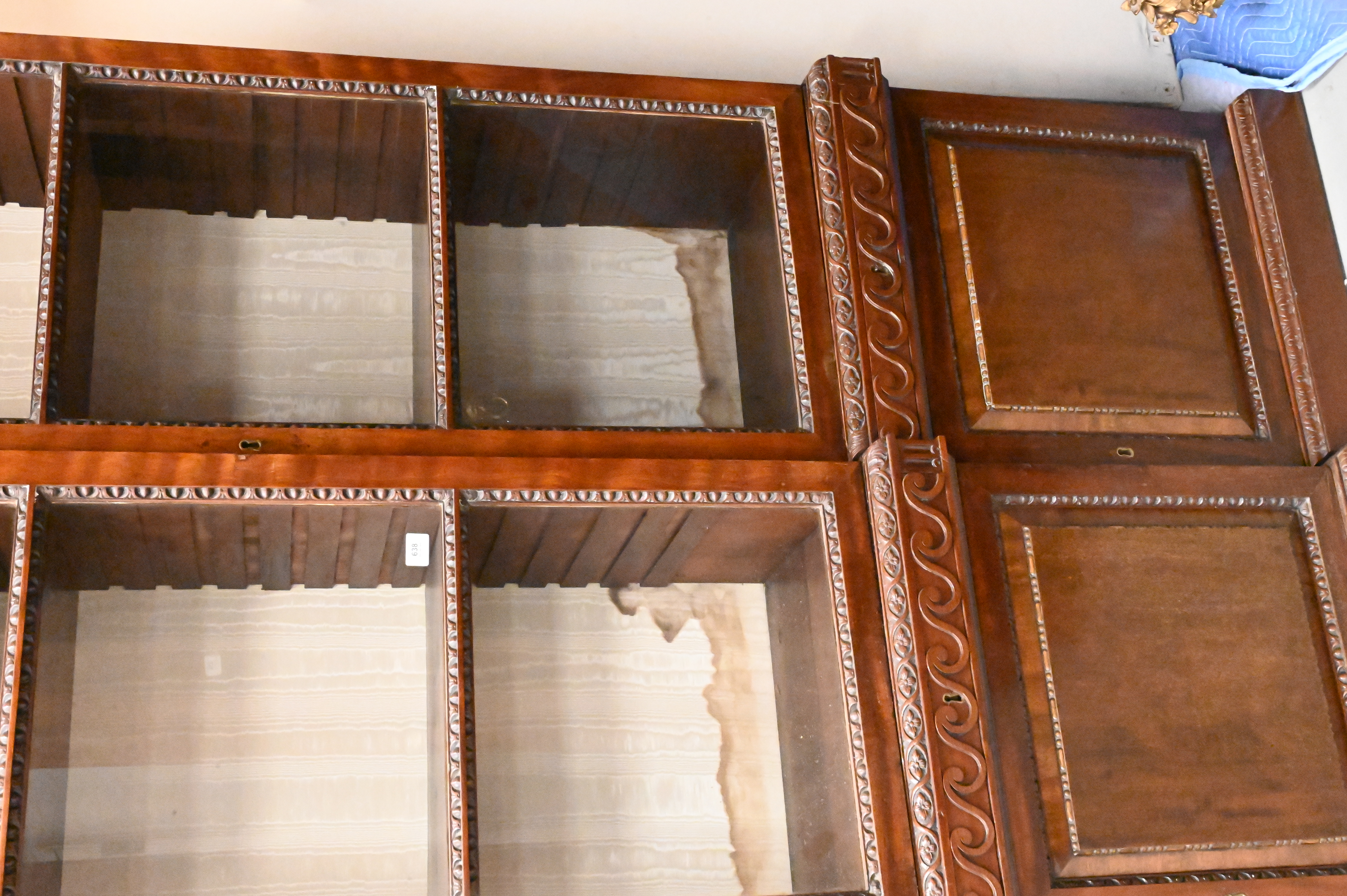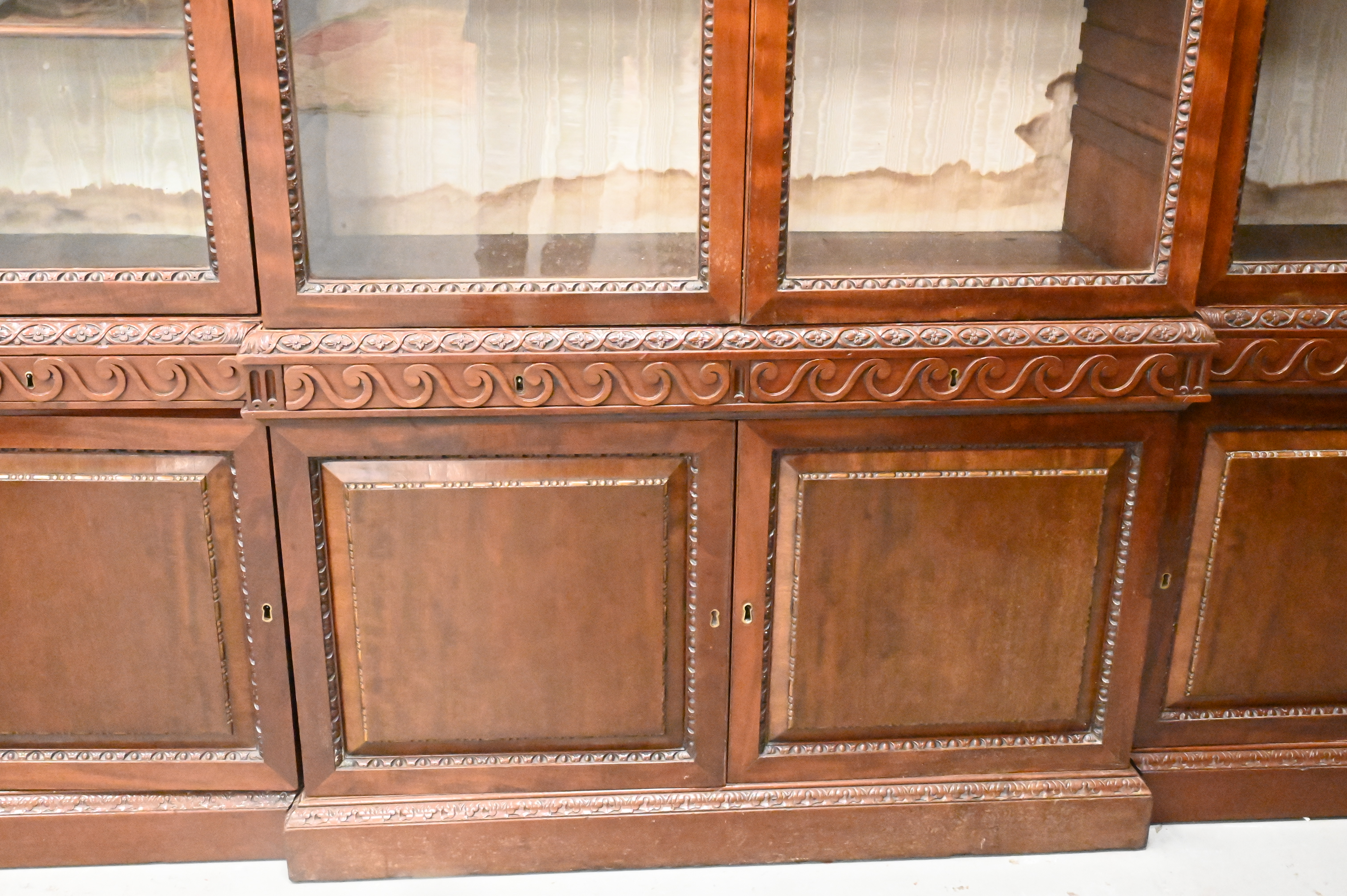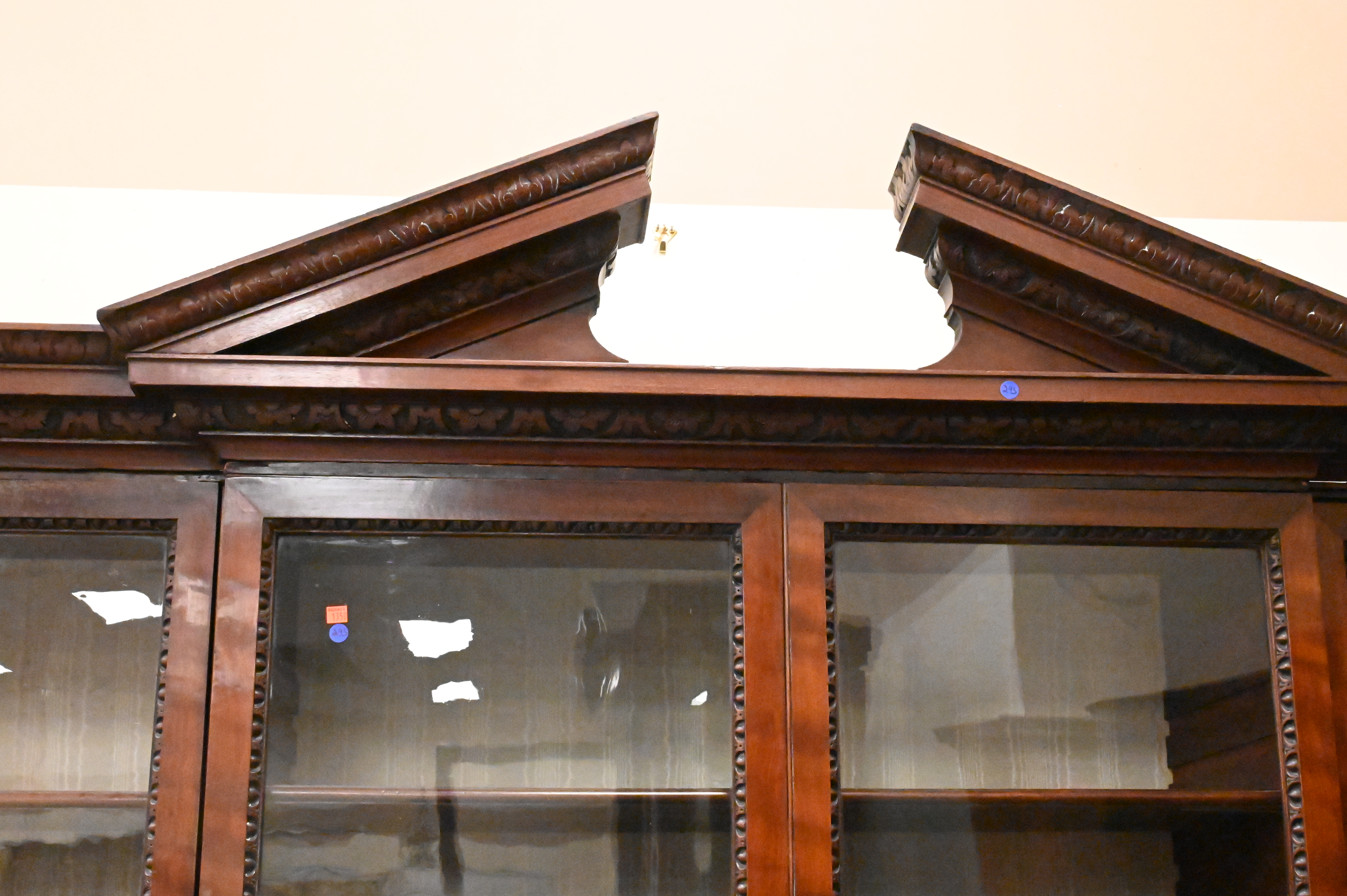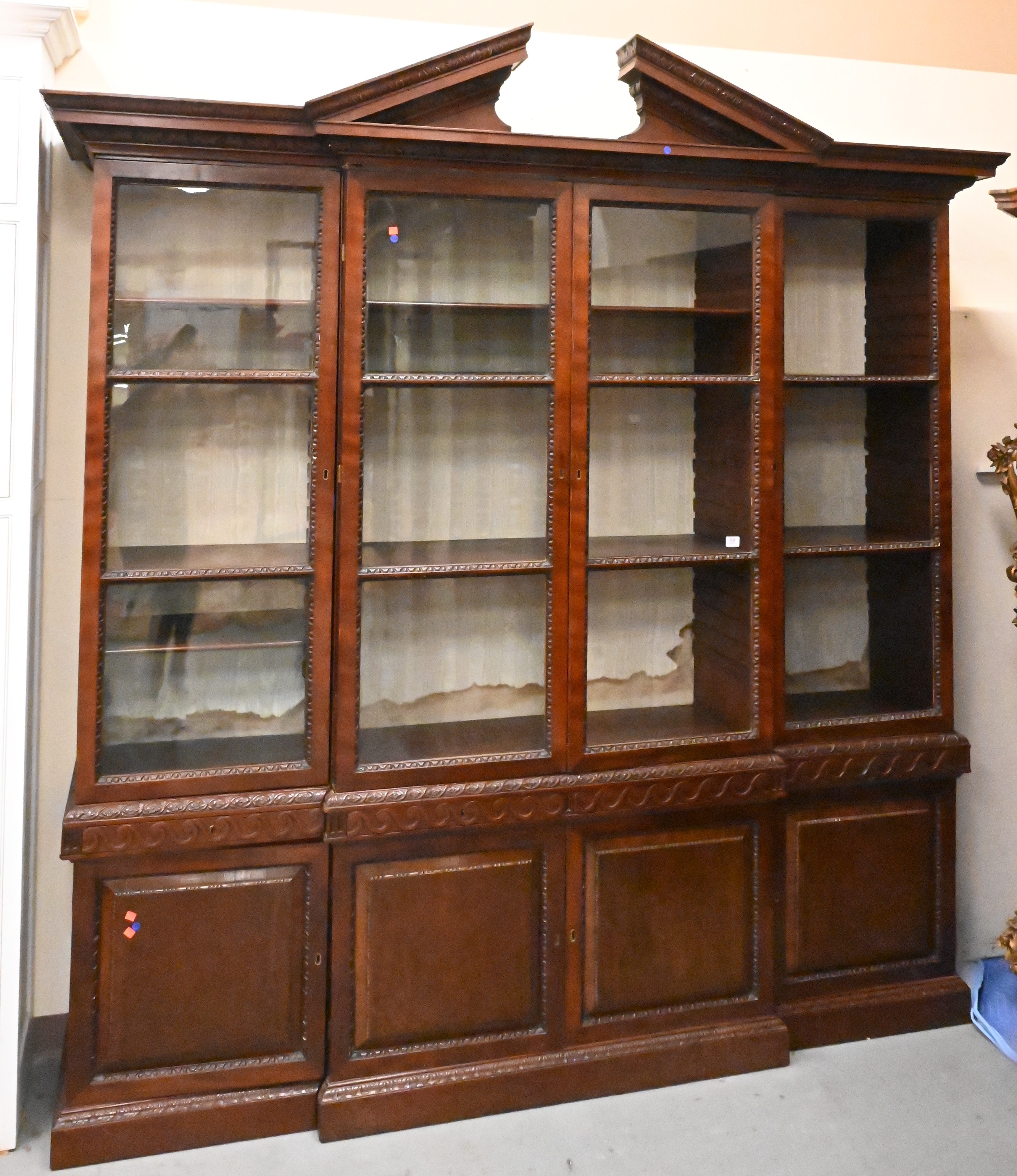 the broken arched pediment heavily carved with foliage and floral guilloche above a pair of projecting glazed doors flanked by recessed glazed door