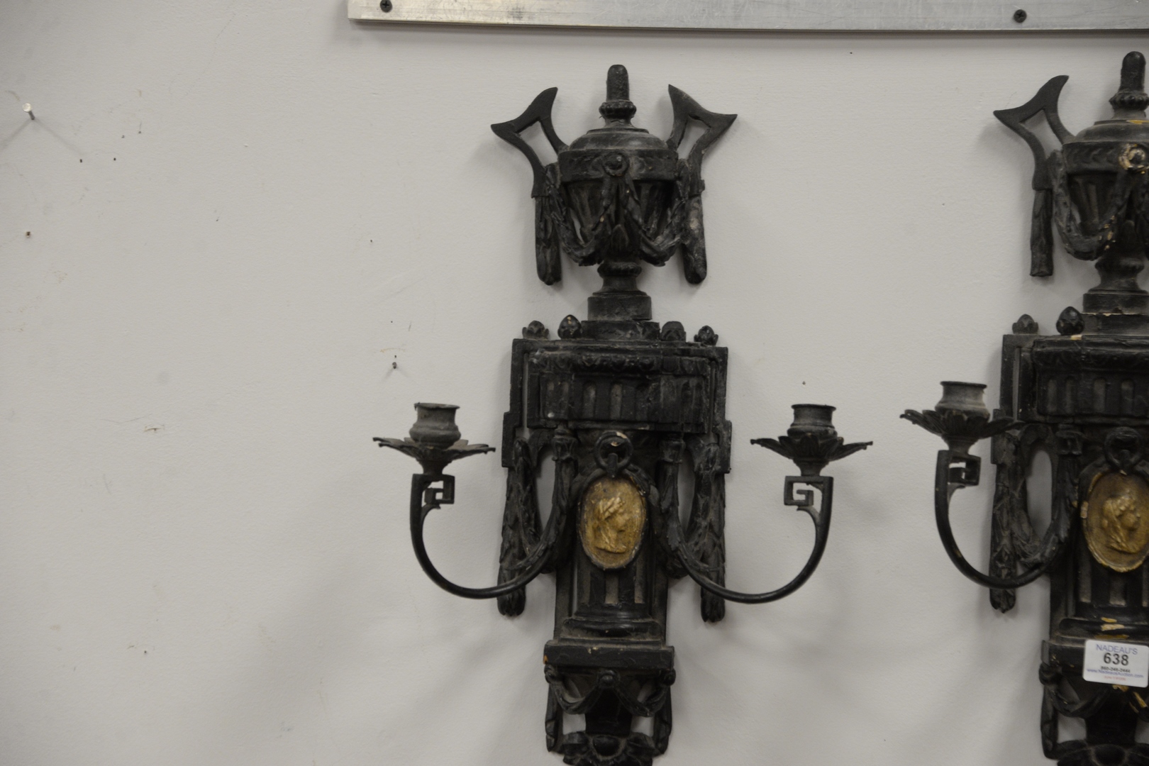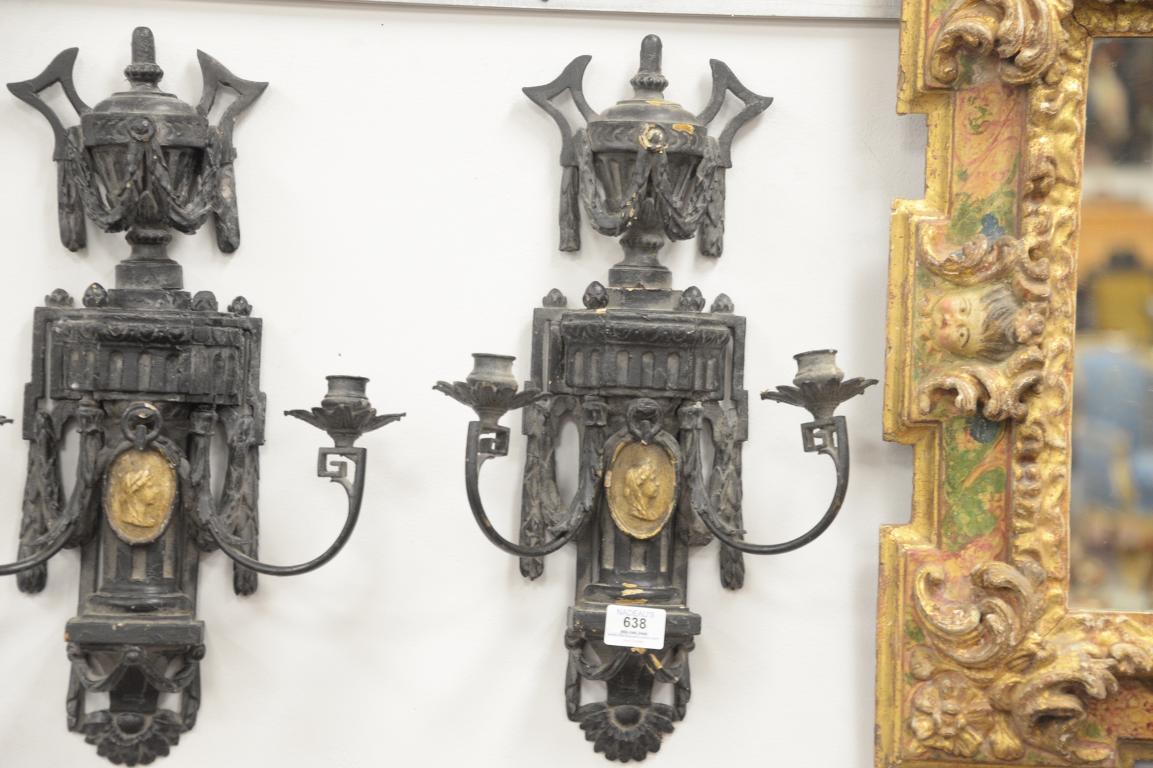 Lot 638: Pair of French Carved Wood and Gesso Sconces having two arms each and a figural medallion to the center of each, height 19 inches, w…