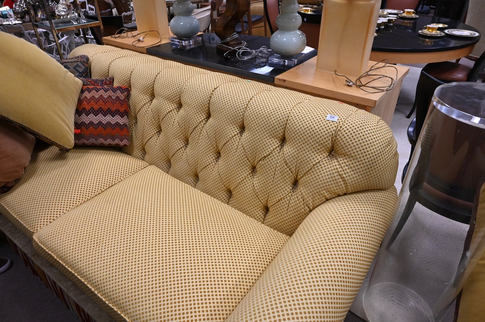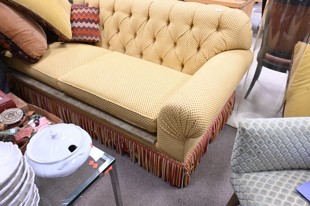 TRS Custom Upholstered Sofa, having tufted back, height 33 inches, length 89 inches, (right front fringe is partially missing).