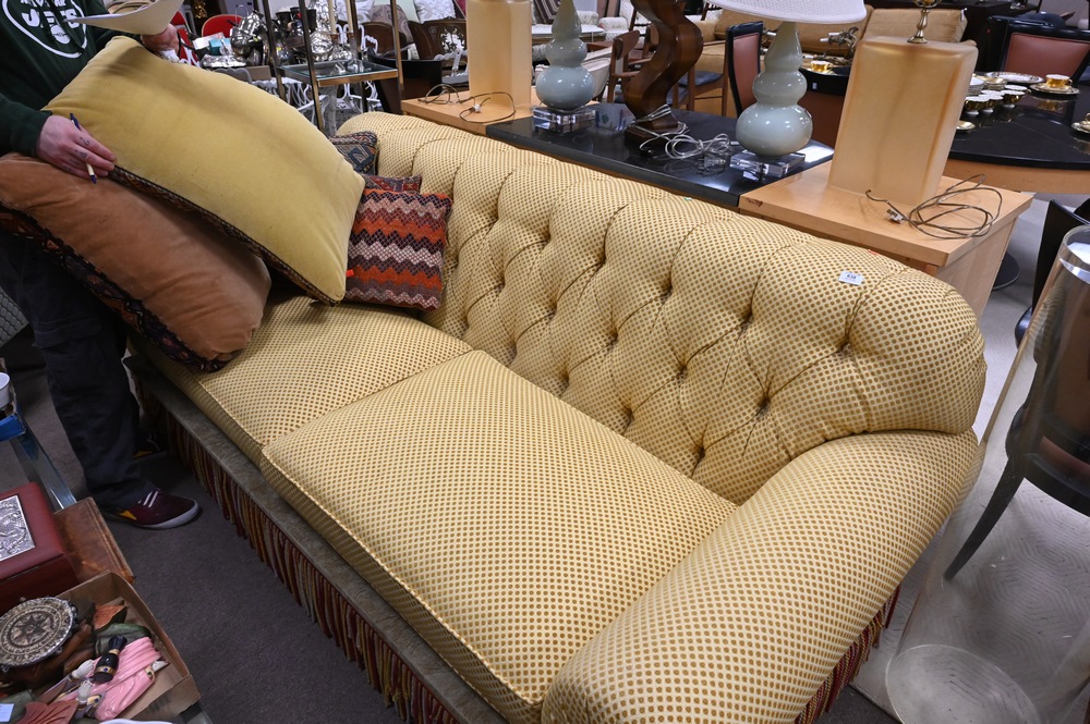 Lot 638: TRS Custom Upholstered Sofa, having tufted back, height 33 inches, length 89 inches, (right front fringe is partially missing).