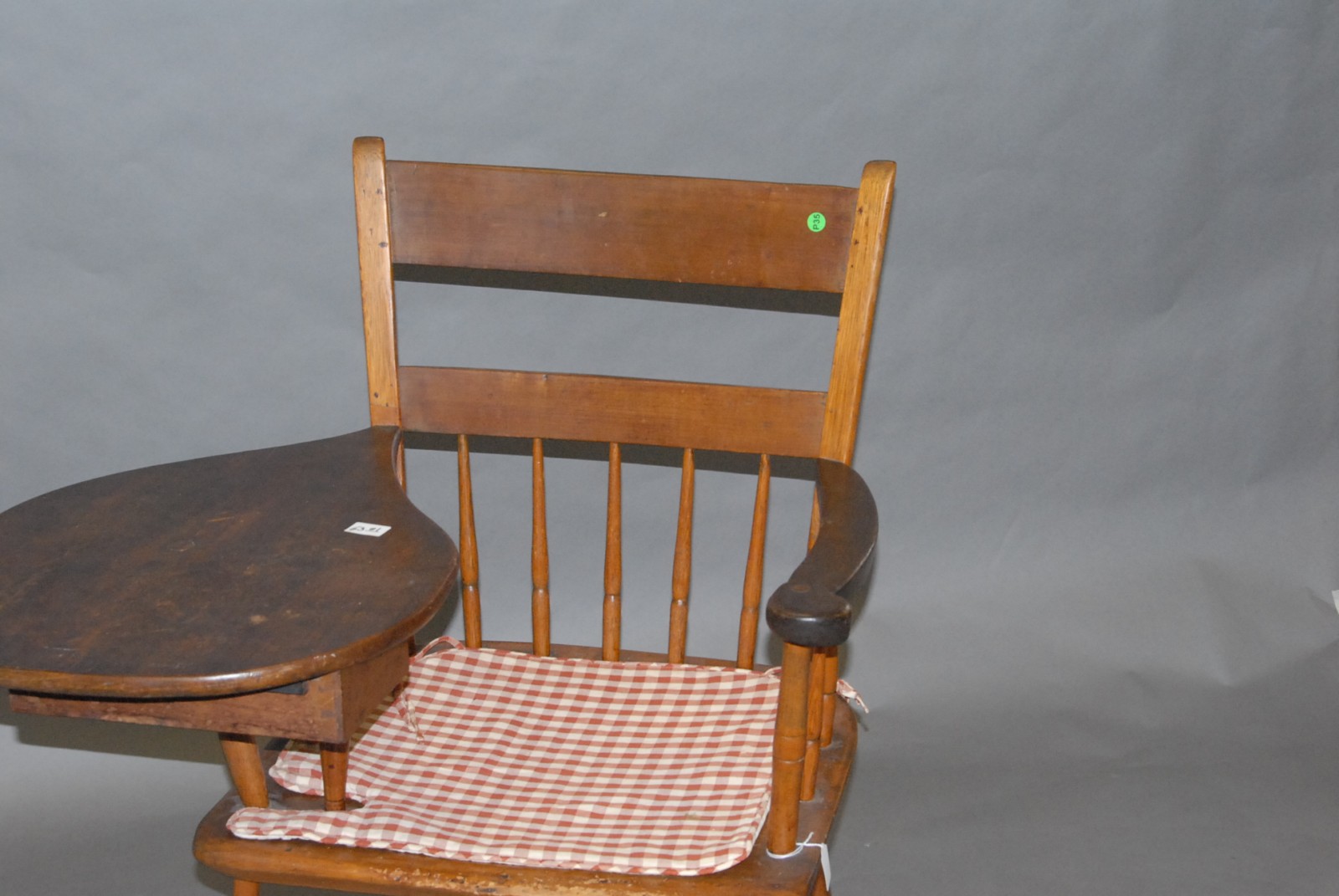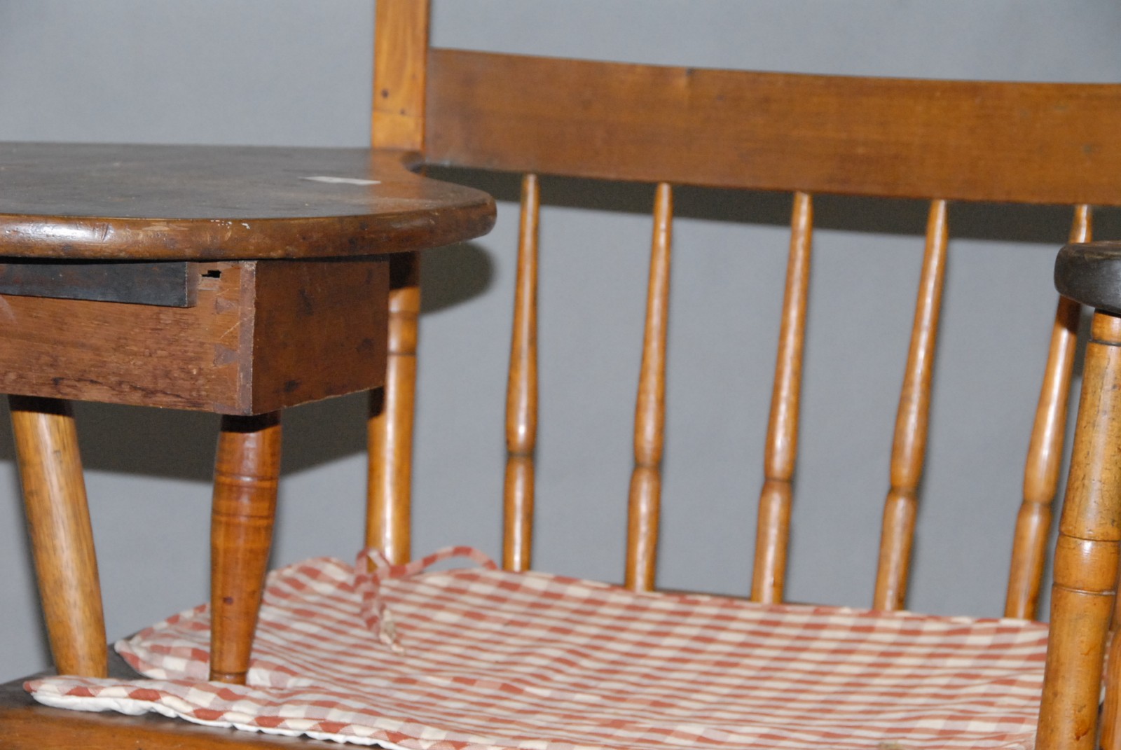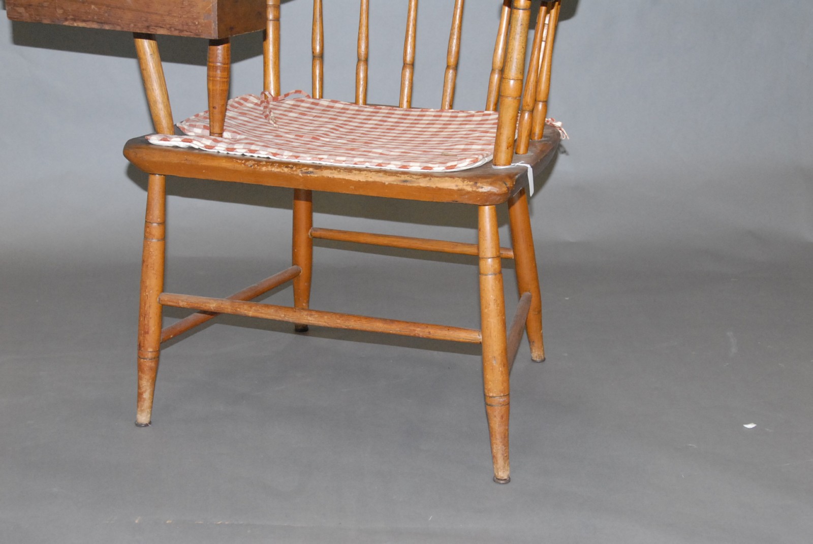 Primitive thumb back writing Windsor armchair with drawer on turned legs.