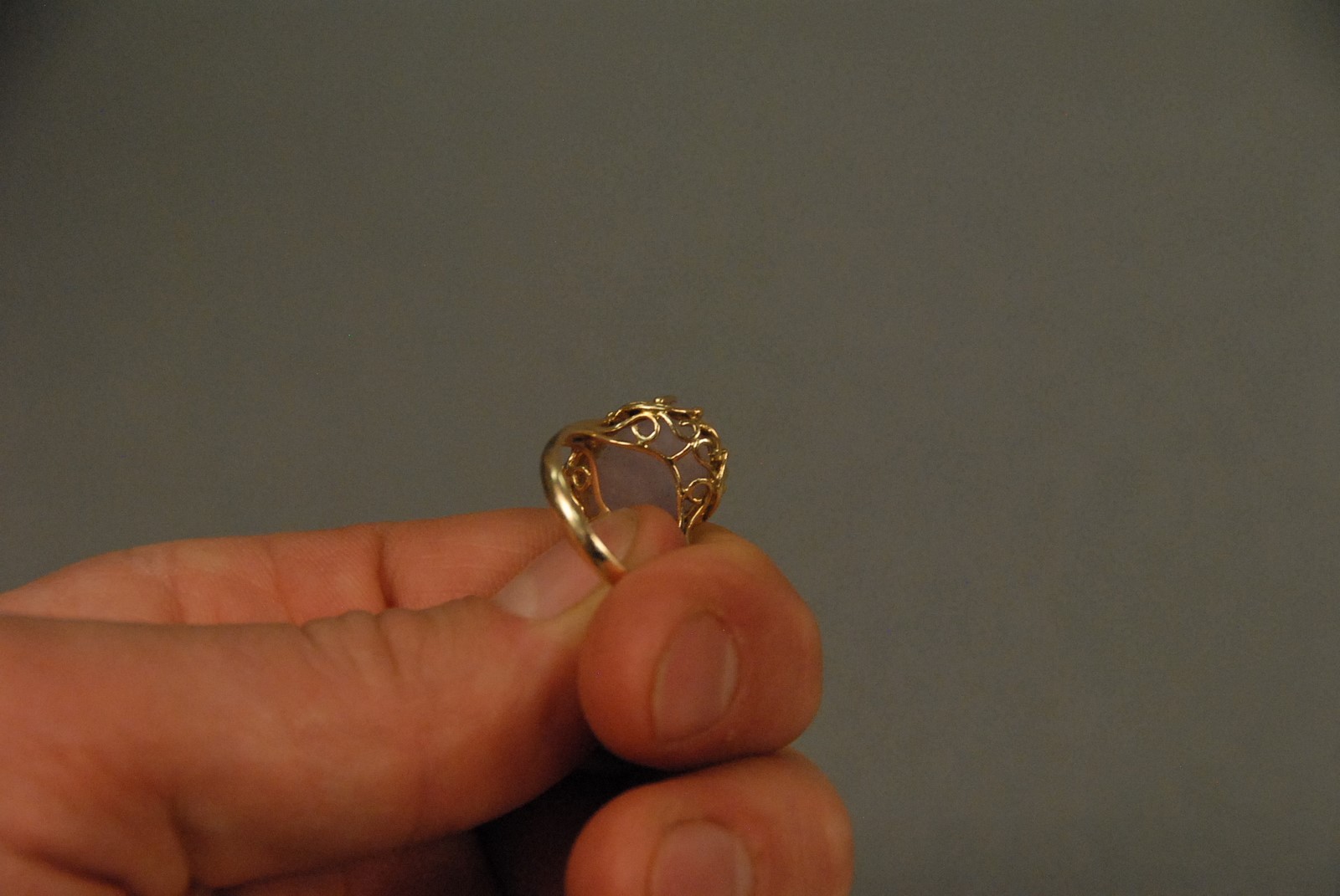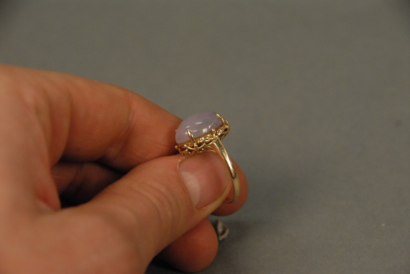14K gold ring set with cabochon cut pink stone.