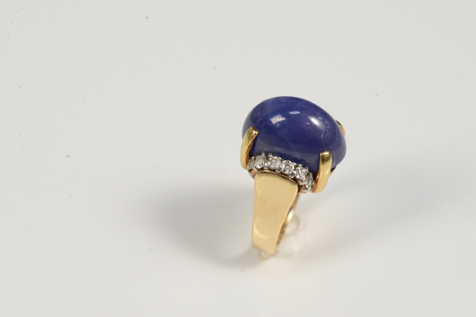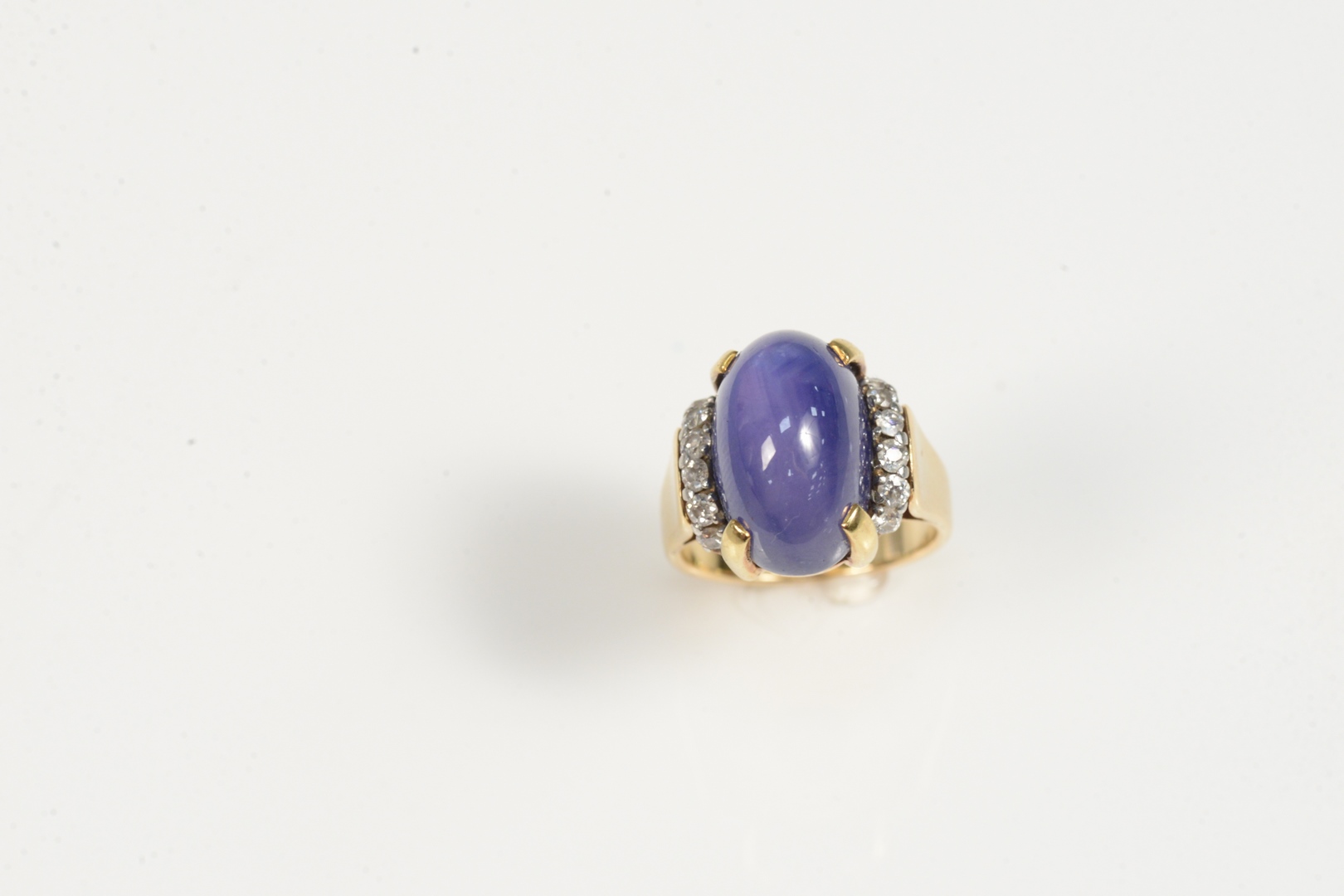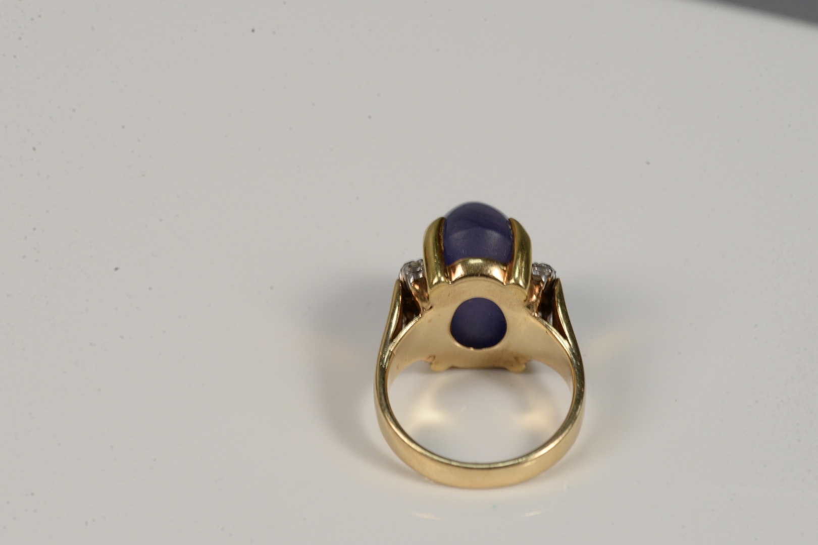 Lot 64: 18 Karat Yellow Gold Ring set with large purple cabochon cut star sapphire, flanked by six diamonds on either side size 7 1/2 13.9 g…