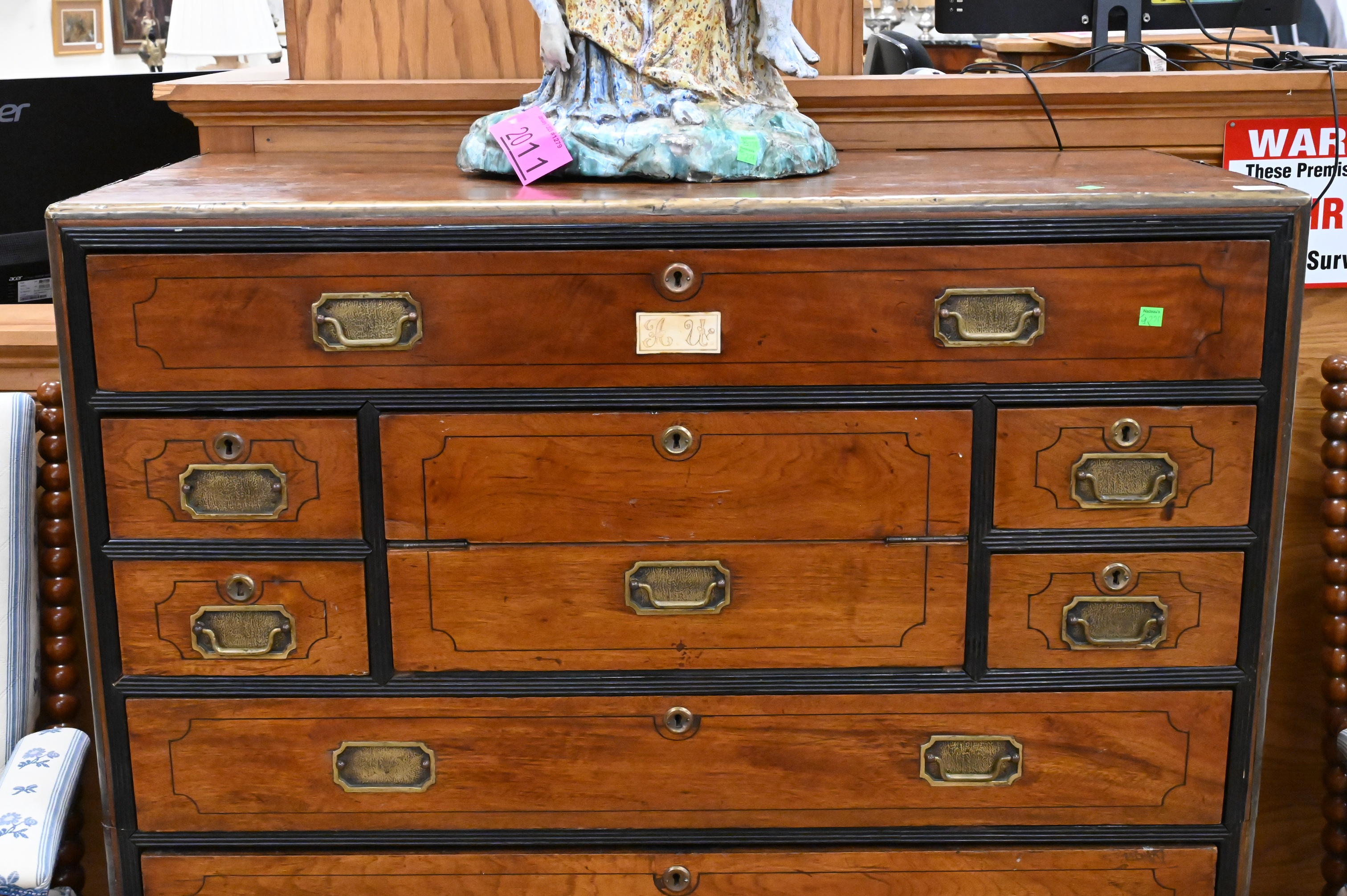 rectangular campaign chest in figured mahogany with ebonized moldings, lock plate stamped “UNWIN FINE STEEL” beneath a crowned VR cypher (for Queen Victoria), along with central drawer bearing a scrimshawed nameplate, fitted with brass recessed campaign pulls and brass side-carry handles, upper central drawer opens to reveal a fall-front writing surface lined in green baize, with interior compartments behind, additional small drawers flank the writing drawer, over two long drawers and a full-width lower drawer, raised on turned feet, a well-constructed and richly patinated example of late 19th-century campaign furniture