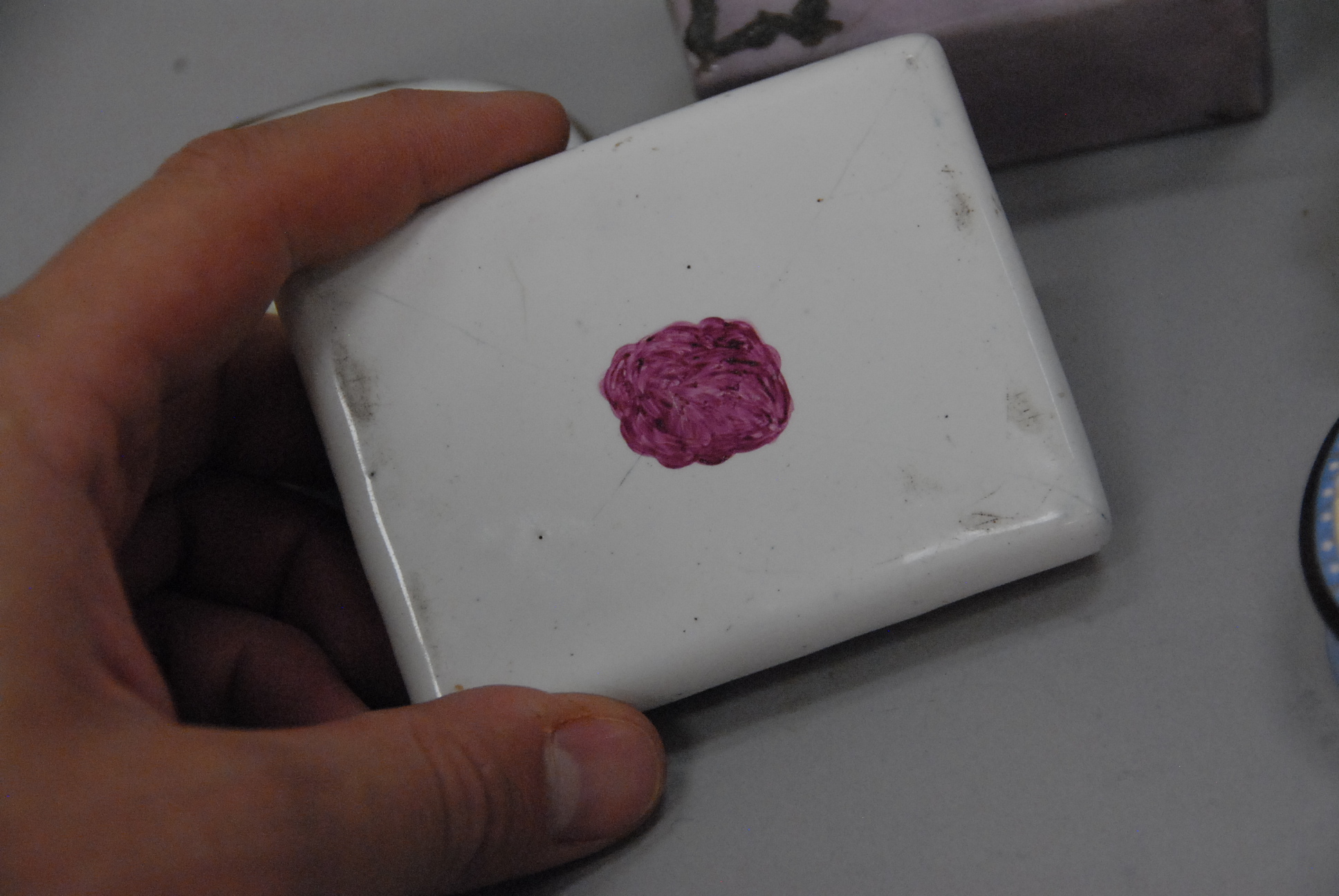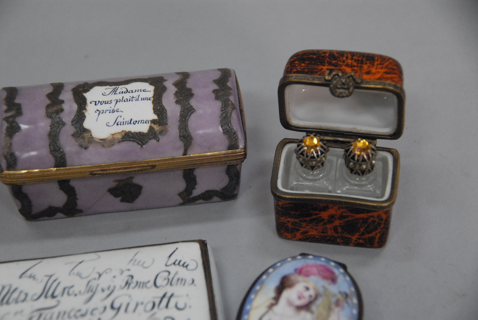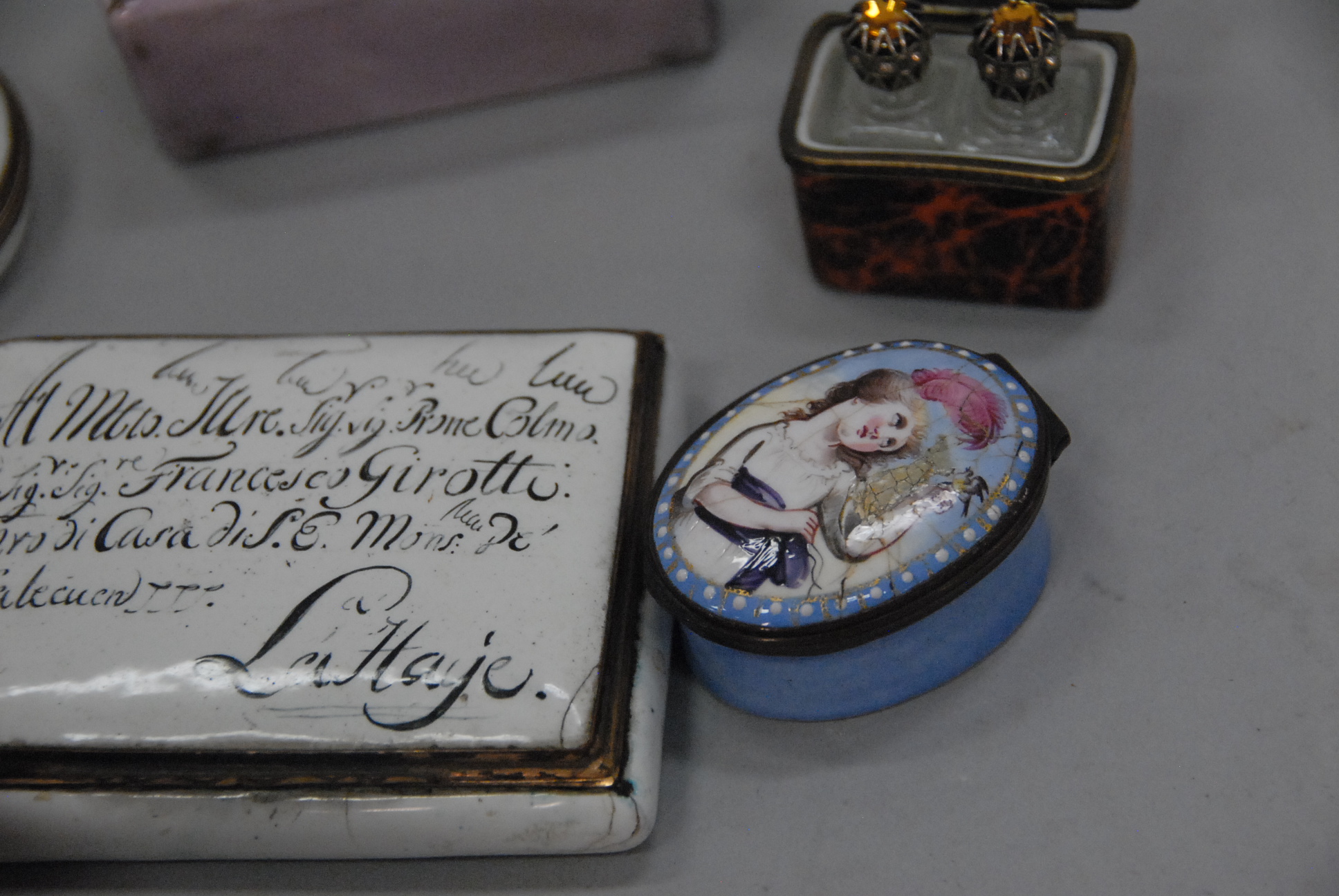 Five boxes to include four Battersea boxes, one marked 1760 and small enameled perfume box.