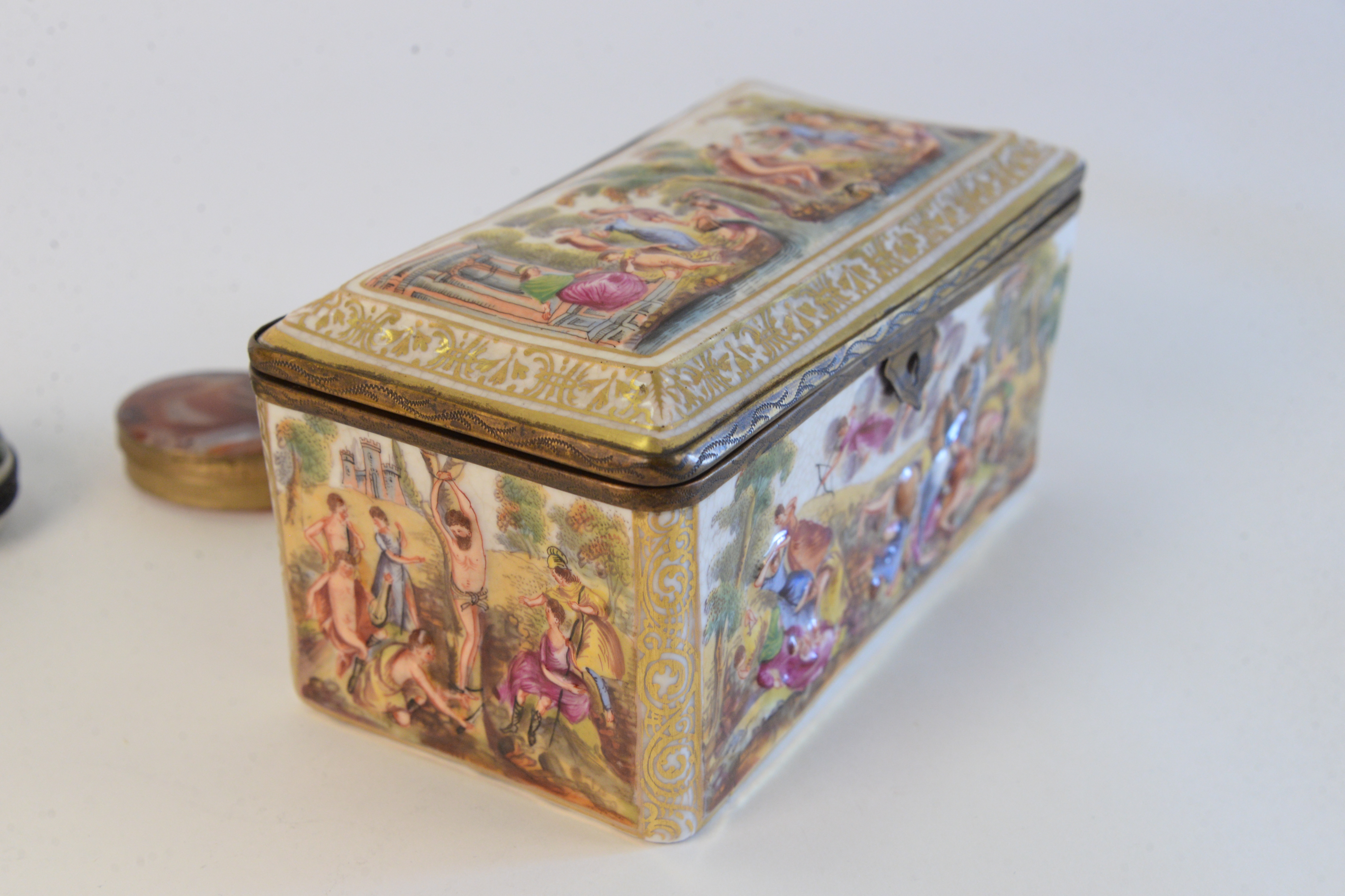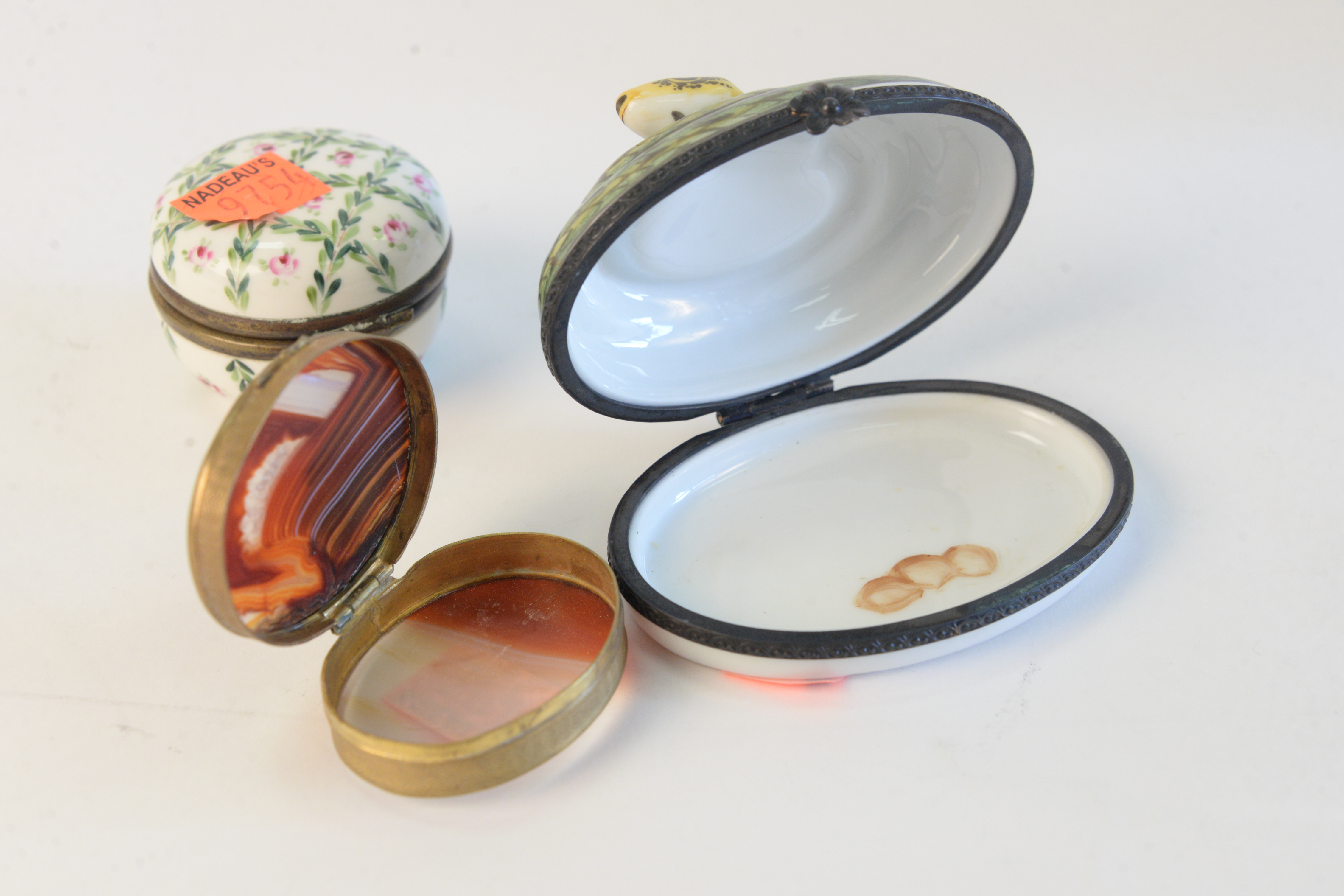 Lot 64: Group of four boxes to include, Capodimonte box with hinged lid, agate trinket case, painted porcelain with floral motif trinket box…