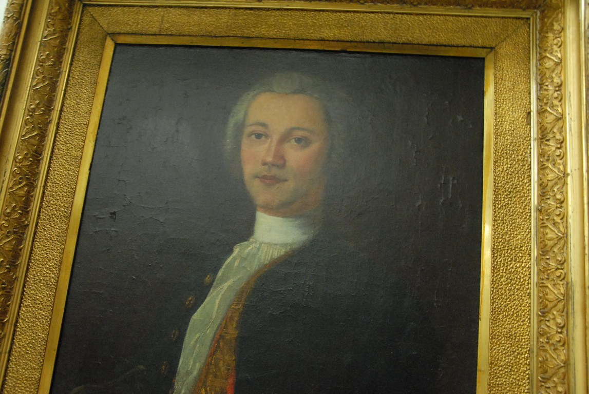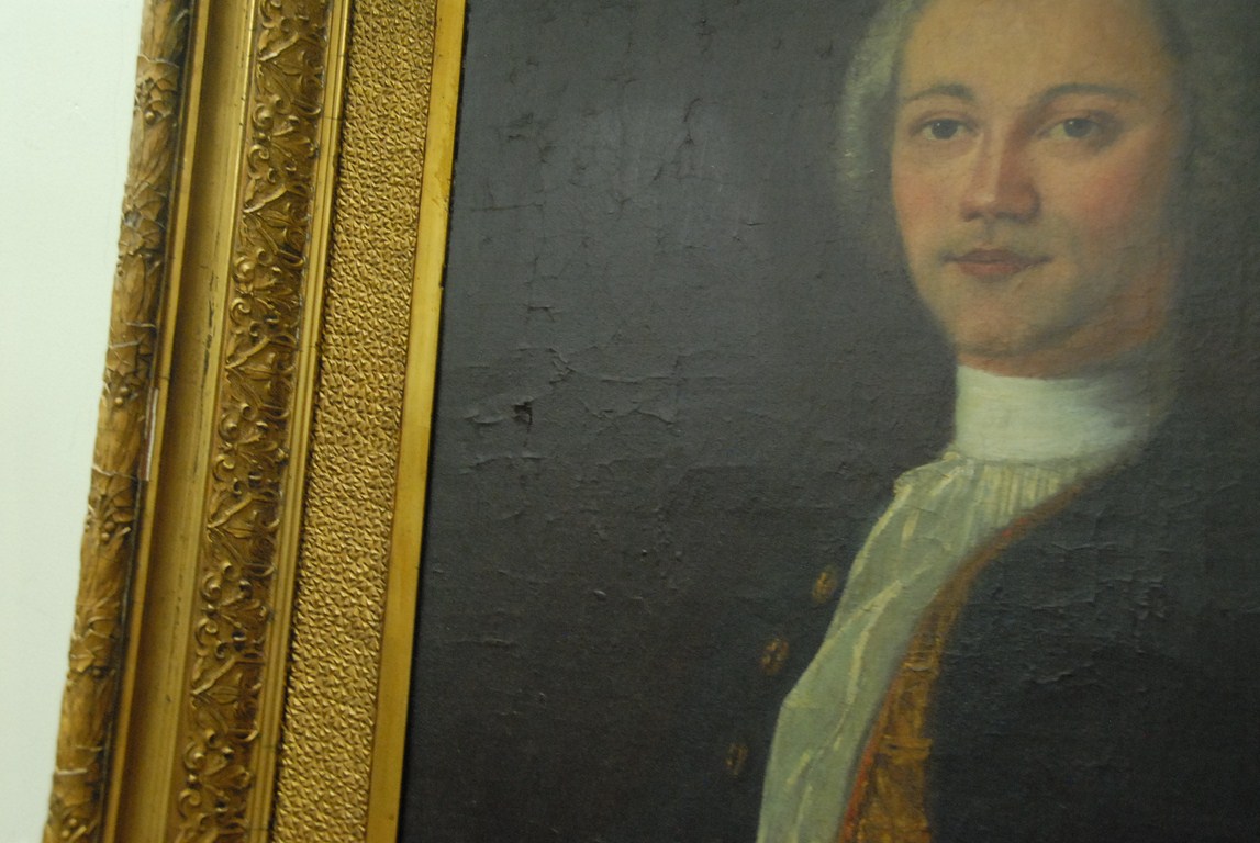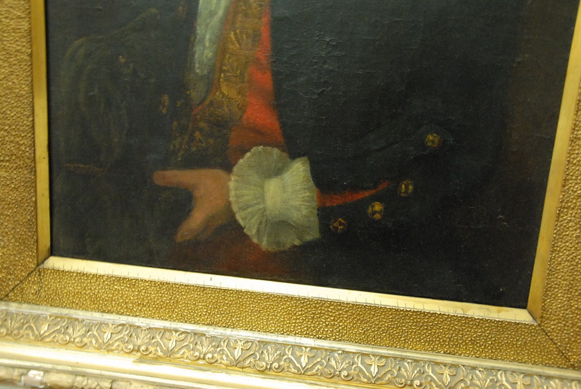 Lot 64: PORTRAIT OF MAN AND DOG man with dark blue jacket with white ruffled shirt oil on canvas in Victorian gold frame 30 x 22