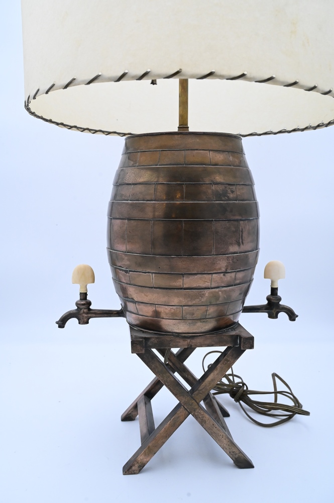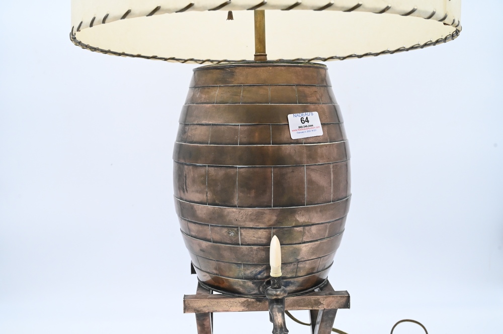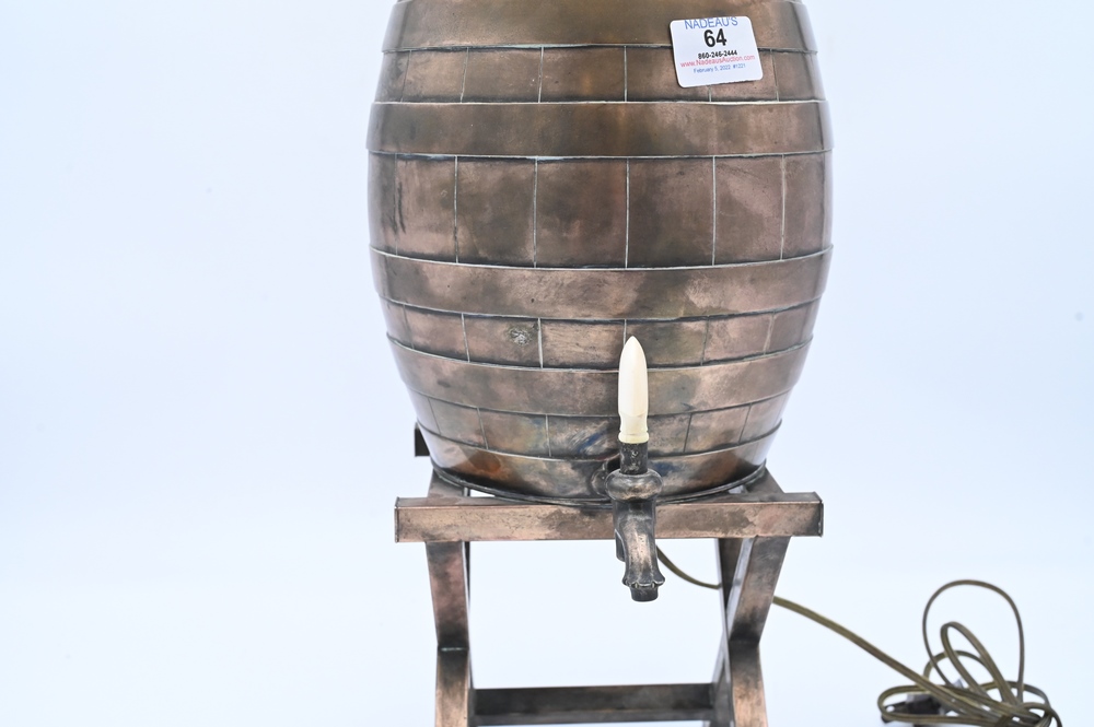 Lot 64: Silver Plated Barrel Form Lamp, having barrel with two spigots on a stand made into a table lamp, height 30.5 inches.