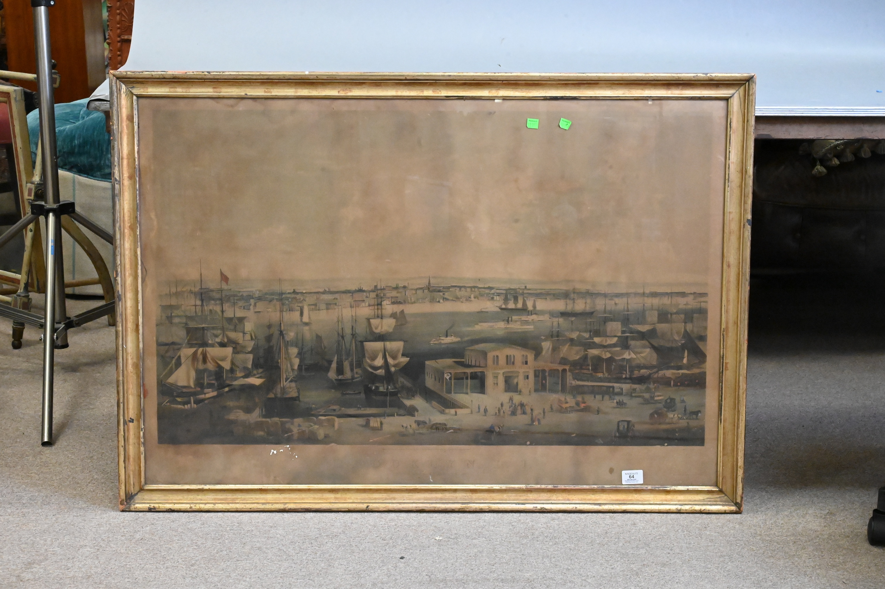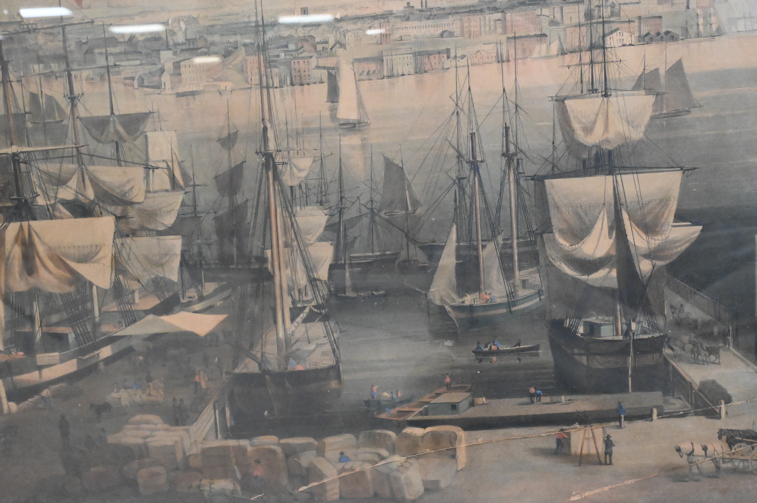 Lithograph depicting a bustling harbor scene with vessels and cityscape beyond